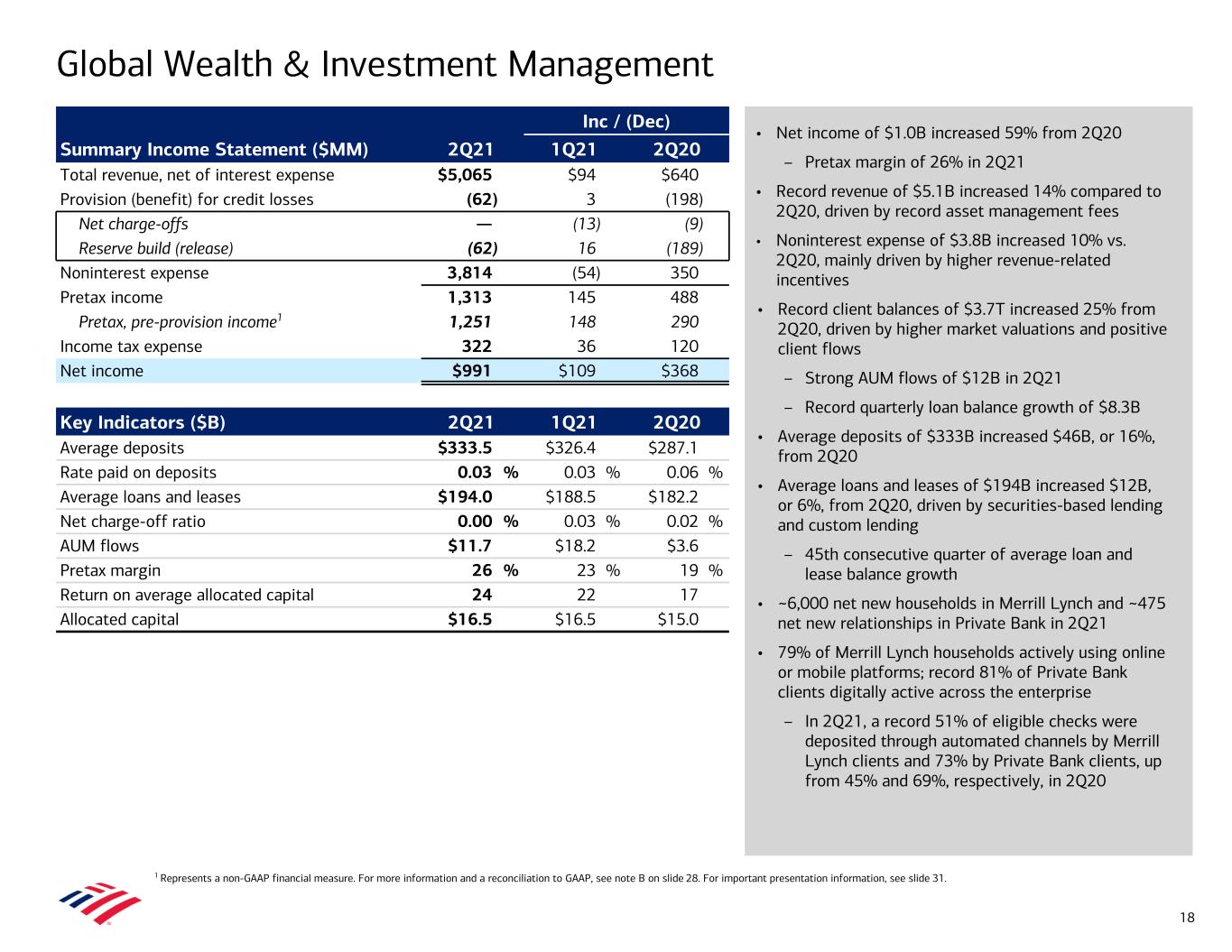 • Net income of $1.0B increased 59% from 2Q20 – Pretax margin of 26% in 2Q21 • Record revenue of $5.1B increased 14% compared to 2Q20, driven by record asset management fees • Noninterest expense of $3.8B increased 10% vs. 2Q20, mainly driven by higher revenue-related incentives • Record client balances of $3.7T increased 25% from 2Q20, driven by higher market valuations and positive client flows – Strong AUM flows of $12B in 2Q21 – Record quarterly loan balance growth of $8.3B • Average deposits of $333B increased $46B, or 16%, from 2Q20 • Average loans and leases of $194B increased $12B, or 6%, from 2Q20, driven by securities-based lending and custom lending – 45th consecutive quarter of average loan and lease balance growth • ~6,000 net new households in Merrill Lynch and ~475 net new relationships in Private Bank in 2Q21 • 79% of Merrill Lynch households actively using online or mobile platforms; record 81% of Private Bank clients digitally active across the enterprise – In 2Q21, a record 51% of eligible checks were deposited through automated channels by Merrill Lynch clients and 73% by Private Bank clients, up from 45% and 69%, respectively, in 2Q20 Global Wealth & Investment Management 1 Represents a non-GAAP financial measure. For more information and a reconciliation to GAAP, see note B on slide 28. For important presentation information, see slide 31. Inc / (Dec) Summary Income Statement ($MM) 2Q21 1Q21 2Q20 Total revenue, net of interest expense $5,065 $94 $640 Provision (benefit) for credit losses (62) 3 (198) Net charge-offs — (13) (9) Reserve build (release) (62) 16 (189) Noninterest expense 3,814 (54) 350 Pretax income 1,313 145 488 Pretax, pre-provision income1 1,251 148 290 Income tax expense 322 36 120 Net income $991 $109 $368 Key Indicators ($B) 2Q21 1Q21 2Q20 Average deposits $333.5 $326.4 $287.1 Rate paid on deposits 0.03 % 0.03 % 0.06 % Average loans and leases $194.0 $188.5 $182.2 Net charge-off ratio 0.00 % 0.03 % 0.02 % AUM flows $11.7 $18.2 $3.6 Pretax margin 26 % 23 % 19 % Return on average allocated capital 24 22 17 Allocated capital $16.5 $16.5 $15.0 18