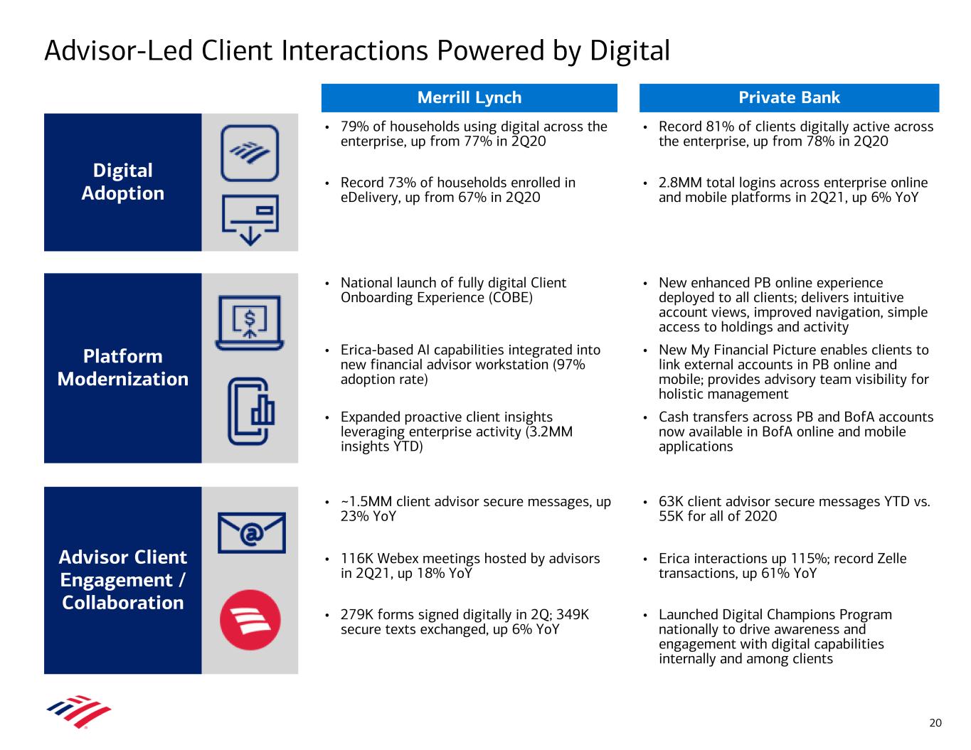 Merrill Lynch Private Bank • 79% of households using digital across the enterprise, up from 77% in 2Q20 • Record 81% of clients digitally active across the enterprise, up from 78% in 2Q20 • Record 73% of households enrolled in eDelivery, up from 67% in 2Q20 • 2.8MM total logins across enterprise online and mobile platforms in 2Q21, up 6% YoY • National launch of fully digital Client Onboarding Experience (COBE) • New enhanced PB online experience deployed to all clients; delivers intuitive account views, improved navigation, simple access to holdings and activity • Erica-based AI capabilities integrated into new financial advisor workstation (97% adoption rate) • New My Financial Picture enables clients to link external accounts in PB online and mobile; provides advisory team visibility for holistic management • Expanded proactive client insights leveraging enterprise activity (3.2MM insights YTD) • Cash transfers across PB and BofA accounts now available in BofA online and mobile applications • ~1.5MM client advisor secure messages, up 23% YoY • 63K client advisor secure messages YTD vs. 55K for all of 2020 • 116K Webex meetings hosted by advisors in 2Q21, up 18% YoY • Erica interactions up 115%; record Zelle transactions, up 61% YoY • 279K forms signed digitally in 2Q; 349K secure texts exchanged, up 6% YoY • Launched Digital Champions Program nationally to drive awareness and engagement with digital capabilities internally and among clients Advisor-Led Client Interactions Powered by Digital Digital Adoption 20 Platform Modernization Advisor Client Engagement / Collaboration