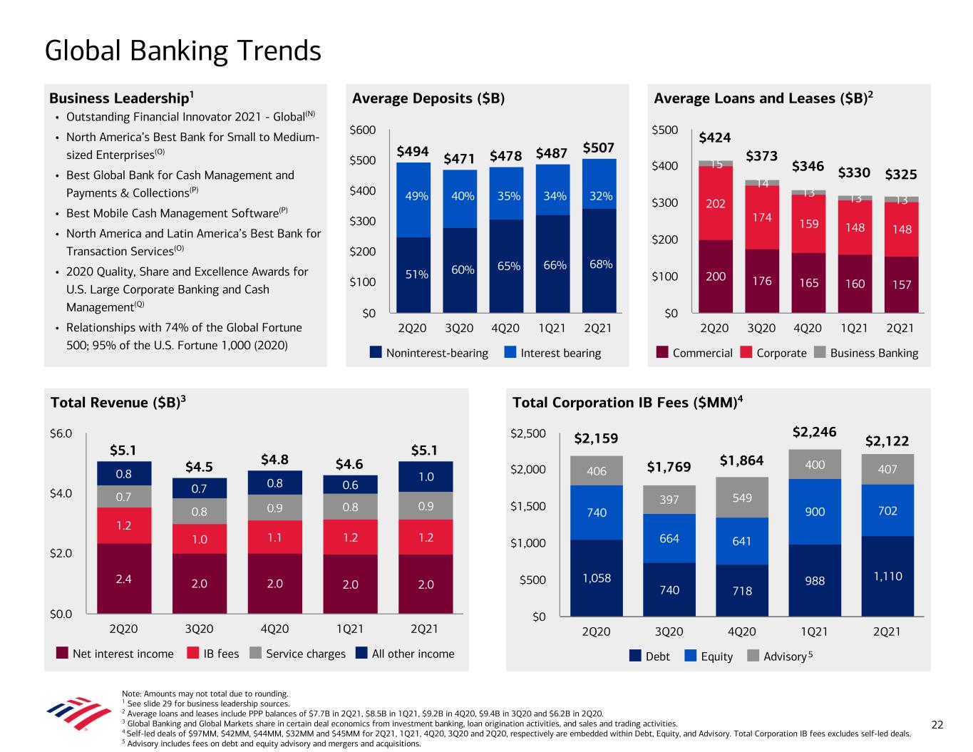 • Net income of $2.4B increased $1.7B from 2Q20, driven primarily by lower provision for credit losses • Revenue of $5.1B was relatively flat vs. 2Q20, as higher leasing-related revenue and treasury fees were offset by lower NII • Total Corporation investment banking fees of $2.1B (excl. self-led) decreased $37MM, or 2%, from 2Q20 – Third best quarter for firm-wide fees post-merger, after 1Q21 and 2Q20 • Provision benefit of $0.8B reflects the current quarter reserve release, compared to a reserve build in the year-ago quarter, due to an improved macroeconomic outlook • Noninterest expense of $2.6B increased 17% from 2Q20, reflecting higher operating costs • Average deposits of $507B increased $13B, or 3%, from 2Q20, reflecting client liquidity and valued relationships • Average loans and leases of $325B decreased 23% from 2Q20, driven by continued paydowns Global Banking 1 Global Banking and Global Markets share in certain deal economics from investment banking, loan origination activities and sales and trading activities. 2 Represents a non-GAAP financial measure. For more information and a reconciliation to GAAP, see note B on slide 28. For important presentation information about this measure, see slide 31. Inc / (Dec) Summary Income Statement ($MM) 2Q21 1Q21 2Q20 Total revenue, net of interest expense1 $5,089 $456 ($2) Provision (benefit) for credit losses (831) 295 (2,704) Net charge-offs 3 (33) (327) Reserve build (release) (834) 328 (2,377) Noninterest expense 2,599 (182) 377 Pretax income 3,321 343 2,325 Pretax, pre-provision income2 2,490 638 (379) Income tax expense 897 93 628 Net income $2,424 $250 $1,697 Selected Revenue Items ($MM) 2Q21 1Q21 2Q20 Total Corporation IB fees (excl. self-led)1 $2,122 $2,246 $2,159 Global Banking IB fees1 1,173 1,172 1,181 Business Lending revenue 1,912 1,607 1,863 Global Transaction Services revenue 1,720 1,645 1,811 Key Indicators ($B) 2Q21 1Q21 2Q20 Average deposits $506.6 $487.0 $493.9 Average loans and leases 325.1 330.1 423.6 Net charge-off ratio 0.00 % 0.05 % 0.32 % Return on average allocated capital 23 21 7 Allocated capital $42.5 $42.5 $42.5 Efficiency ratio 51 % 60 % 44 % 21