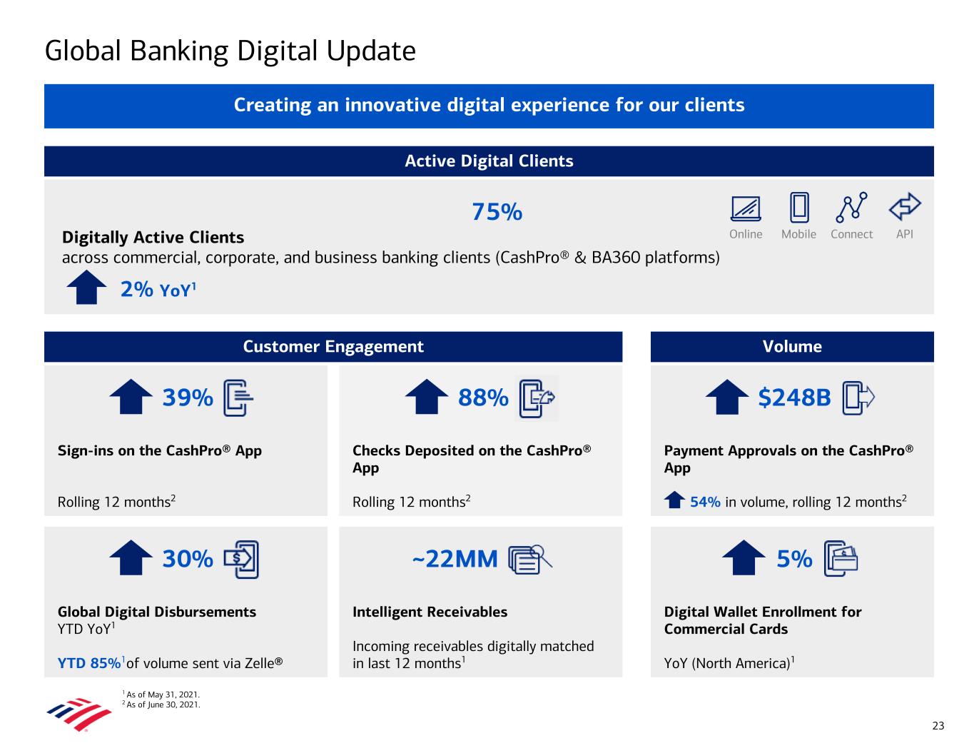 Global Banking Digital Update 75% Digitally Active Clients across commercial, corporate, and business banking clients (CashPro® & BA360 platforms) 2% YoY1 Active Digital Clients 39% Sign-ins on the CashPro® App Rolling 12 months2 $248B Payment Approvals on the CashPro® App 54% in volume, rolling 12 months2 30% Global Digital Disbursements YTD YoY1 YTD 85%1of volume sent via Zelle® 5% Digital Wallet Enrollment for Commercial Cards YoY (North America)1 88% Checks Deposited on the CashPro® App Rolling 12 months2 ~22MM Intelligent Receivables Incoming receivables digitally matched in last 12 months1 Customer Engagement Online Mobile Connect API Volume 1 As of May 31, 2021. 2 As of June 30, 2021. Creating an innovative digital experience for our clients 23
