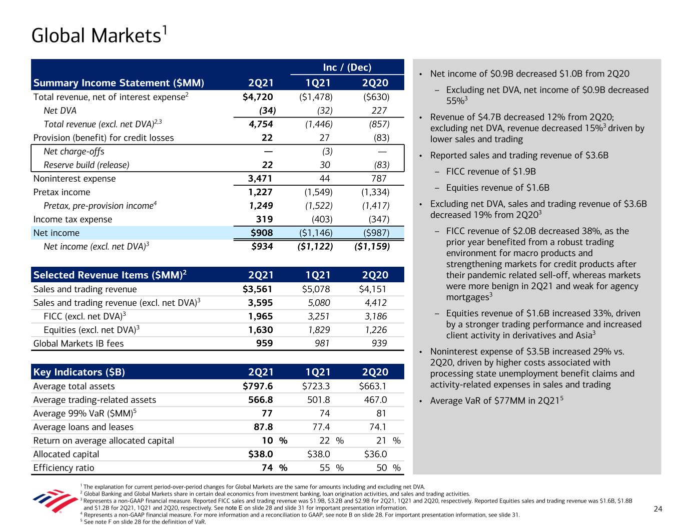 Global Markets1 • Net income of $0.9B decreased $1.0B from 2Q20 – Excluding net DVA, net income of $0.9B decreased 55%3 • Revenue of $4.7B decreased 12% from 2Q20; excluding net DVA, revenue decreased 15%3 driven by lower sales and trading • Reported sales and trading revenue of $3.6B – FICC revenue of $1.9B – Equities revenue of $1.6B • Excluding net DVA, sales and trading revenue of $3.6B decreased 19% from 2Q203 – FICC revenue of $2.0B decreased 38%, as the prior year benefited from a robust trading environment for macro products and strengthening markets for credit products after their pandemic related sell-off, whereas markets were more benign in 2Q21 and weak for agency mortgages3 – Equities revenue of $1.6B increased 33%, driven by a stronger trading performance and increased client activity in derivatives and Asia3 • Noninterest expense of $3.5B increased 29% vs. 2Q20, driven by higher costs associated with processing state unemployment benefit claims and activity-related expenses in sales and trading • Average VaR of $77MM in 2Q215 1 The explanation for current period-over-period changes for Global Markets are the same for amounts including and excluding net DVA. 2 Global Banking and Global Markets share in certain deal economics from investment banking, loan origination activities, and sales and trading activities. 3 Represents a non-GAAP financial measure. Reported FICC sales and trading revenue was $1.9B, $3.2B and $2.9B for 2Q21, 1Q21 and 2Q20, respectively. Reported Equities sales and trading revenue was $1.6B, $1.8B and $1.2B for 2Q21, 1Q21 and 2Q20, respectively. See note E on slide 28 and slide 31 for important presentation information. 4 Represents a non-GAAP financial measure. For more information and a reconciliation to GAAP, see note B on slide 28. For important presentation information, see slide 31. 5 See note F on slide 28 for the definition of VaR. Inc / (Dec) Summary Income Statement ($MM) 2Q21 1Q21 2Q20 Total revenue, net of interest expense2 $4,720 ($1,478) ($630) Net DVA (34) (32) 227 Total revenue (excl. net DVA)2,3 4,754 (1,446) (857) Provision (benefit) for credit losses 22 27 (83) Net charge-offs — (3) — Reserve build (release) 22 30 (83) Noninterest expense 3,471 44 787 Pretax income 1,227 (1,549) (1,334) Pretax, pre-provision income4 1,249 (1,522) (1,417) Income tax expense 319 (403) (347) Net income $908 ($1,146) ($987) Net income (excl. net DVA)3 $934 ($1,122) ($1,159) Selected Revenue Items ($MM)2 2Q21 1Q21 2Q20 Sales and trading revenue $3,561 $5,078 $4,151 Sales and trading revenue (excl. net DVA)3 3,595 5,080 4,412 FICC (excl. net DVA)3 1,965 3,251 3,186 Equities (excl. net DVA)3 1,630 1,829 1,226 Global Markets IB fees 959 981 939 Key Indicators ($B) 2Q21 1Q21 2Q20 Average total assets $797.6 $723.3 $663.1 Average trading-related assets 566.8 501.8 467.0 Average 99% VaR ($MM)5 77 74 81 Average loans and leases 87.8 77.4 74.1 Return on average allocated capital 10 % 22 % 21 % Allocated capital $38.0 $38.0 $36.0 Efficiency ratio 74 % 55 % 50 % 24