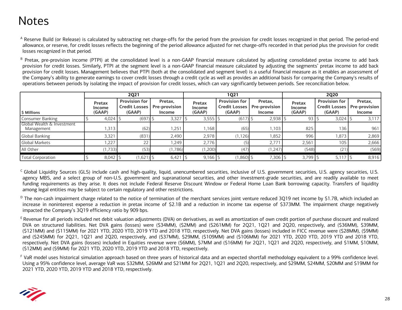 A Reserve Build (or Release) is calculated by subtracting net charge-offs for the period from the provision for credit losses recognized in that period. The period-end allowance, or reserve, for credit losses reflects the beginning of the period allowance adjusted for net charge-offs recorded in that period plus the provision for credit losses recognized in that period. B Pretax, pre-provision income (PTPI) at the consolidated level is a non-GAAP financial measure calculated by adjusting consolidated pretax income to add back provision for credit losses. Similarly, PTPI at the segment level is a non-GAAP financial measure calculated by adjusting the segments’ pretax income to add back provision for credit losses. Management believes that PTPI (both at the consolidated and segment level) is a useful financial measure as it enables an assessment of the Company’s ability to generate earnings to cover credit losses through a credit cycle as well as provides an additional basis for comparing the Company's results of operations between periods by isolating the impact of provision for credit losses, which can vary significantly between periods. See reconciliation below. Notes C Global Liquidity Sources (GLS) include cash and high-quality, liquid, unencumbered securities, inclusive of U.S. government securities, U.S. agency securities, U.S. agency MBS, and a select group of non-U.S. government and supranational securities, and other investment-grade securities, and are readily available to meet funding requirements as they arise. It does not include Federal Reserve Discount Window or Federal Home Loan Bank borrowing capacity. Transfers of liquidity among legal entities may be subject to certain regulatory and other restrictions. D The non-cash impairment charge related to the notice of termination of the merchant services joint venture reduced 3Q19 net income by $1.7B, which included an increase in noninterest expense a reduction in pretax income of $2.1B and a reduction in income tax expense of $373MM. The impairment charge negatively impacted the Company’s 3Q19 efficiency ratio by 909 bps. E Revenue for all periods included net debit valuation adjustments (DVA) on derivatives, as well as amortization of own credit portion of purchase discount and realized DVA on structured liabilities. Net DVA gains (losses) were ($34MM), ($2MM) and ($261MM) for 2Q21, 1Q21 and 2Q20, respectively, and ($36MM), $39MM, ($121MM) and ($115MM) for 2021 YTD, 2020 YTD, 2019 YTD and 2018 YTD, respectively. Net DVA gains (losses) included in FICC revenue were ($28MM), ($9MM) and ($245MM) for 2Q21, 1Q21 and 2Q20, respectively, and ($37MM), $29MM, ($109MM) and ($106MM) for 2021 YTD, 2020 YTD, 2019 YTD and 2018 YTD, respectively. Net DVA gains (losses) included in Equities revenue were ($6MM), $7MM and ($16MM) for 2Q21, 1Q21 and 2Q20, respectively, and $1MM, $10MM, ($12MM) and ($9MM) for 2021 YTD, 2020 YTD, 2019 YTD and 2018 YTD, respectively. F VaR model uses historical simulation approach based on three years of historical data and an expected shortfall methodology equivalent to a 99% confidence level. Using a 95% confidence level, average VaR was $32MM, $26MM and $21MM for 2Q21, 1Q21 and 2Q20, respectively, and $29MM, $24MM, $20MM and $19MM for 2021 YTD, 2020 YTD, 2019 YTD and 2018 YTD, respectively. $ Millions 2Q21 1Q21 2Q20 Pretax Income (GAAP) Provision for Credit Losses (GAAP) Pretax, Pre-provision Income Pretax Income (GAAP) Provision for Credit Losses (GAAP) Pretax, Pre-provision Income Pretax Income (GAAP) Provision for Credit Losses (GAAP) Pretax, Pre-provision Income Consumer Banking $ 4,024 $ (697) $ 3,327 $ 3,555 $ (617) $ 2,938 $ 93 $ 3,024 $ 3,117 Global Wealth & Investment Management 1,313 (62) 1,251 1,168 (65) 1,103 825 136 961 Global Banking 3,321 (831) 2,490 2,978 (1,126) 1,852 996 1,873 2,869 Global Markets 1,227 22 1,249 2,776 (5) 2,771 2,561 105 2,666 All Other (1,733) (53) (1,786) (1,200) (47) (1,247) (548) (21) (569) Total Corporation $ 8,042 $ (1,621) $ 6,421 $ 9,166 $ (1,860) $ 7,306 $ 3,799 $ 5,117 $ 8,916 28