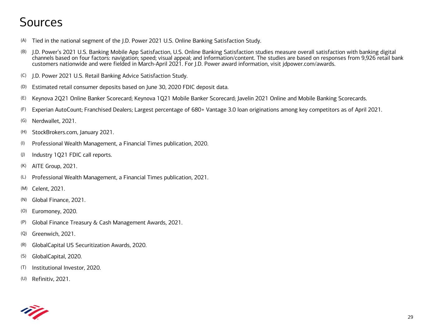 Sources (A) Tied in the national segment of the J.D. Power 2021 U.S. Online Banking Satisfaction Study. (B) J.D. Power’s 2021 U.S. Banking Mobile App Satisfaction, U.S. Online Banking Satisfaction studies measure overall satisfaction with banking digital channels based on four factors: navigation; speed; visual appeal; and information/content. The studies are based on responses from 9,926 retail bank customers nationwide and were fielded in March-April 2021. For J.D. Power award information, visit jdpower.com/awards. (C) J.D. Power 2021 U.S. Retail Banking Advice Satisfaction Study. (D) Estimated retail consumer deposits based on June 30, 2020 FDIC deposit data. (E) Keynova 2Q21 Online Banker Scorecard; Keynova 1Q21 Mobile Banker Scorecard; Javelin 2021 Online and Mobile Banking Scorecards. (F) Experian AutoCount; Franchised Dealers; Largest percentage of 680+ Vantage 3.0 loan originations among key competitors as of April 2021. (G) Nerdwallet, 2021. (H) StockBrokers.com, January 2021. (I) Professional Wealth Management, a Financial Times publication, 2020. (J) Industry 1Q21 FDIC call reports. (K) AITE Group, 2021. (L) Professional Wealth Management, a Financial Times publication, 2021. (M) Celent, 2021. (N) Global Finance, 2021. (O) Euromoney, 2020. (P) Global Finance Treasury & Cash Management Awards, 2021. (Q) Greenwich, 2021. (R) GlobalCapital US Securitization Awards, 2020. (S) GlobalCapital, 2020. (T) Institutional Investor, 2020. (U) Refinitiv, 2021. 29