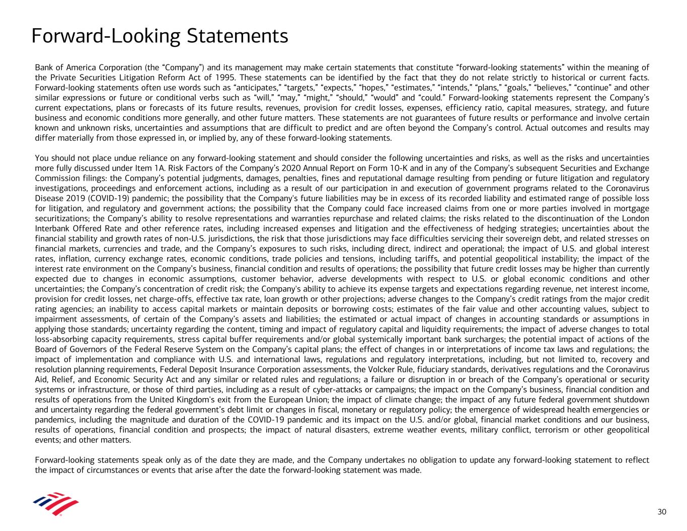 Forward-Looking Statements Bank of America Corporation (the “Company”) and its management may make certain statements that constitute “forward-looking statements” within the meaning of the Private Securities Litigation Reform Act of 1995. These statements can be identified by the fact that they do not relate strictly to historical or current facts. Forward-looking statements often use words such as “anticipates,” “targets,” “expects,” “hopes,” “estimates,” “intends,” “plans,” “goals,” “believes,” “continue” and other similar expressions or future or conditional verbs such as “will,” “may,” “might,” “should,” “would” and “could.” Forward-looking statements represent the Company’s current expectations, plans or forecasts of its future results, revenues, provision for credit losses, expenses, efficiency ratio, capital measures, strategy, and future business and economic conditions more generally, and other future matters. These statements are not guarantees of future results or performance and involve certain known and unknown risks, uncertainties and assumptions that are difficult to predict and are often beyond the Company’s control. Actual outcomes and results may differ materially from those expressed in, or implied by, any of these forward-looking statements. You should not place undue reliance on any forward-looking statement and should consider the following uncertainties and risks, as well as the risks and uncertainties more fully discussed under Item 1A. Risk Factors of the Company’s 2020 Annual Report on Form 10-K and in any of the Company’s subsequent Securities and Exchange Commission filings: the Company’s potential judgments, damages, penalties, fines and reputational damage resulting from pending or future litigation and regulatory investigations, proceedings and enforcement actions, including as a result of our participation in and execution of government programs related to the Coronavirus Disease 2019 (COVID-19) pandemic; the possibility that the Company's future liabilities may be in excess of its recorded liability and estimated range of possible loss for litigation, and regulatory and government actions; the possibility that the Company could face increased claims from one or more parties involved in mortgage securitizations; the Company’s ability to resolve representations and warranties repurchase and related claims; the risks related to the discontinuation of the London Interbank Offered Rate and other reference rates, including increased expenses and litigation and the effectiveness of hedging strategies; uncertainties about the financial stability and growth rates of non-U.S. jurisdictions, the risk that those jurisdictions may face difficulties servicing their sovereign debt, and related stresses on financial markets, currencies and trade, and the Company’s exposures to such risks, including direct, indirect and operational; the impact of U.S. and global interest rates, inflation, currency exchange rates, economic conditions, trade policies and tensions, including tariffs, and potential geopolitical instability; the impact of the interest rate environment on the Company’s business, financial condition and results of operations; the possibility that future credit losses may be higher than currently expected due to changes in economic assumptions, customer behavior, adverse developments with respect to U.S. or global economic conditions and other uncertainties; the Company’s concentration of credit risk; the Company's ability to achieve its expense targets and expectations regarding revenue, net interest income, provision for credit losses, net charge-offs, effective tax rate, loan growth or other projections; adverse changes to the Company’s credit ratings from the major credit rating agencies; an inability to access capital markets or maintain deposits or borrowing costs; estimates of the fair value and other accounting values, subject to impairment assessments, of certain of the Company’s assets and liabilities; the estimated or actual impact of changes in accounting standards or assumptions in applying those standards; uncertainty regarding the content, timing and impact of regulatory capital and liquidity requirements; the impact of adverse changes to total loss-absorbing capacity requirements, stress capital buffer requirements and/or global systemically important bank surcharges; the potential impact of actions of the Board of Governors of the Federal Reserve System on the Company’s capital plans; the effect of changes in or interpretations of income tax laws and regulations; the impact of implementation and compliance with U.S. and international laws, regulations and regulatory interpretations, including, but not limited to, recovery and resolution planning requirements, Federal Deposit Insurance Corporation assessments, the Volcker Rule, fiduciary standards, derivatives regulations and the Coronavirus Aid, Relief, and Economic Security Act and any similar or related rules and regulations; a failure or disruption in or breach of the Company’s operational or security systems or infrastructure, or those of third parties, including as a result of cyber-attacks or campaigns; the impact on the Company’s business, financial condition and results of operations from the United Kingdom's exit from the European Union; the impact of climate change; the impact of any future federal government shutdown and uncertainty regarding the federal government’s debt limit or changes in fiscal, monetary or regulatory policy; the emergence of widespread health emergencies or pandemics, including the magnitude and duration of the COVID-19 pandemic and its impact on the U.S. and/or global, financial market conditions and our business, results of operations, financial condition and prospects; the impact of natural disasters, extreme weather events, military conflict, terrorism or othe
