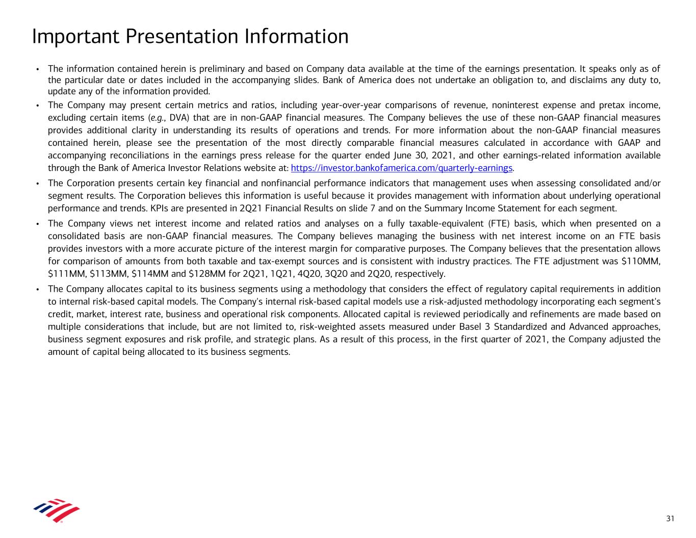 • The information contained herein is preliminary and based on Company data available at the time of the earnings presentation. It speaks only as of the particular date or dates included in the accompanying slides. Bank of America does not undertake an obligation to, and disclaims any duty to, update any of the information provided. • The Company may present certain metrics and ratios, including year-over-year comparisons of revenue, noninterest expense and pretax income, excluding certain items (e.g., DVA) that are in non-GAAP financial measures. The Company believes the use of these non-GAAP financial measures provides additional clarity in understanding its results of operations and trends. For more information about the non-GAAP financial measures contained herein, please see the presentation of the most directly comparable financial measures calculated in accordance with GAAP and accompanying reconciliations in the earnings press release for the quarter ended June 30, 2021, and other earnings-related information available through the Bank of America Investor Relations website at: https://investor.bankofamerica.com/quarterly-earnings. • The Corporation presents certain key financial and nonfinancial performance indicators that management uses when assessing consolidated and/or segment results. The Corporation believes this information is useful because it provides management with information about underlying operational performance and trends. KPIs are presented in 2Q21 Financial Results on slide 7 and on the Summary Income Statement for each segment. • The Company views net interest income and related ratios and analyses on a fully taxable-equivalent (FTE) basis, which when presented on a consolidated basis are non-GAAP financial measures. The Company believes managing the business with net interest income on an FTE basis provides investors with a more accurate picture of the interest margin for comparative purposes. The Company believes that the presentation allows for comparison of amounts from both taxable and tax-exempt sources and is consistent with industry practices. The FTE adjustment was $110MM, $111MM, $113MM, $114MM and $128MM for 2Q21, 1Q21, 4Q20, 3Q20 and 2Q20, respectively. • The Company allocates capital to its business segments using a methodology that considers the effect of regulatory capital requirements in addition to internal risk-based capital models. The Company's internal risk-based capital models use a risk-adjusted methodology incorporating each segment's credit, market, interest rate, business and operational risk components. Allocated capital is reviewed periodically and refinements are made based on multiple considerations that include, but are not limited to, risk-weighted assets measured under Basel 3 Standardized and Advanced approaches, business segment exposures and risk profile, and strategic plans. As a result of this process, in the first quarter of 2021, the Company adjusted the amount of capital being allocated to its business segments. Important Presentation Information 31