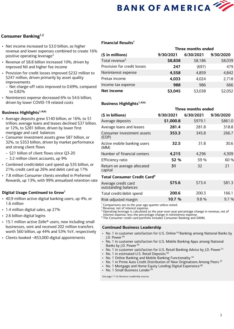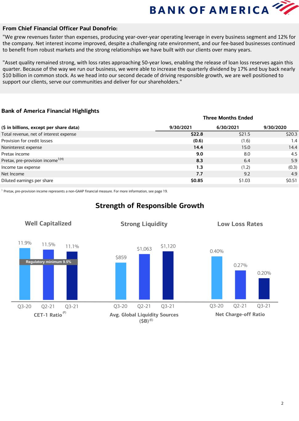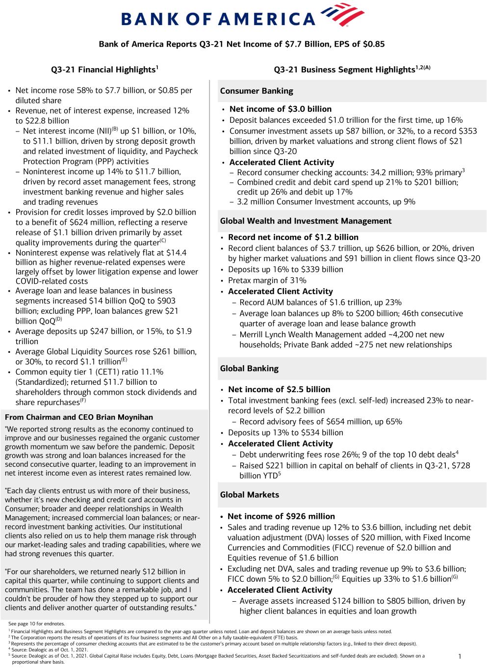 1 Q3-21 Financial Highlights1 Q3-21 Business Segment Highlights1,2(A) Consumer Banking Global Wealth and Investment Management Global Banking Global Markets Bank of America Reports Q3-21 Net Income of $7.7 Billion, EPS of $0.85 See page 10 for endnotes. 1 Financial Highlights and Business Segment Highlights are compared to the year-ago quarter unless noted. Loan and deposit balances are shown on an average basis unless noted. 2 The Corporation reports the results of operations of its four business segments and All Other on a fully taxable-equivalent (FTE) basis. 3 Represents the percentage of consumer checking accounts that are estimated to be the customer’s primary account based on multiple relationship factors (e.g., linked to their direct deposit). 4 Source: Dealogic as of Oct. 1, 2021. 5 Source: Dealogic as of Oct. 1, 2021. Global Capital Raise includes Equity, Debt, Loans (Mortgage Backed Securities, Asset Backed Securitizations and self-funded deals are excluded). Shown on a proportional share basis. • Net income of $3.0 billion • Deposit balances exceeded $1.0 trillion for the first time, up 16% • Consumer investment assets up $87 billion, or 32%, to a record $353 billion, driven by market valuations and strong client flows of $21 billion since Q3-20 • Accelerated Client Activity – Record consumer checking accounts: 34.2 million; 93% primary3 – Combined credit and debit card spend up 21% to $201 billion; credit up 26% and debit up 17% – 3.2 million Consumer Investment accounts, up 9% • Net income rose 58% to $7.7 billion, or $0.85 per diluted share • Revenue, net of interest expense, increased 12% to $22.8 billion – Net interest income (NII)(B) up $1 billion, or 10%, to $11.1 billion, driven by strong deposit growth and related investment of liquidity, and Paycheck Protection Program (PPP) activities – Noninterest income up 14% to $11.7 billion, driven by record asset management fees, strong investment banking revenue and higher sales and trading revenues • Provision for credit losses improved by $2.0 billion to a benefit of $624 million, reflecting a reserve release of $1.1 billion driven primarily by asset quality improvements during the quarter(C) • Noninterest expense was relatively flat at $14.4 billion as higher revenue-related expenses were largely offset by lower litigation expense and lower COVID-related costs • Average loan and lease balances in business segments increased $14 billion QoQ to $903 billion; excluding PPP, loan balances grew $21 billion QoQ(D) • Average deposits up $247 billion, or 15%, to $1.9 trillion • Average Global Liquidity Sources rose $261 billion, or 30%, to record $1.1 trillion(E) • Common equity tier 1 (CET1) ratio 11.1% (Standardized); returned $11.7 billion to shareholders through common stock dividends and share repurchases(F) • Net income of $926 million • Sales and trading revenue up 12% to $3.6 billion, including net debit valuation adjustment (DVA) losses of $20 million, with Fixed Income Currencies and Commodities (FICC) revenue of $2.0 billion and Equities revenue of $1.6 billion • Excluding net DVA, sales and trading revenue up 9% to $3.6 billion; FICC down 5% to $2.0 billion;(G) Equities up 33% to $1.6 billion(G) • Accelerated Client Activity – Average assets increased $124 billion to $805 billion, driven by higher client balances in equities and loan growth From Chairman and CEO Brian Moynihan "We reported strong results as the economy continued to improve and our businesses regained the organic customer growth momentum we saw before the pandemic. Deposit growth was strong and loan balances increased for the second consecutive quarter, leading to an improvement in net interest income even as interest rates remained low. "Each day clients entrust us with more of their business, whether it's new checking and credit card accounts in Consumer; broader and deeper relationships in Wealth Management; increased commercial loan balances; or near- record investment banking activities. Our institutional clients also relied on us to help them manage risk through our market-leading sales and trading capabilities, where we had strong revenues this quarter. "For our shareholders, we returned nearly $12 billion in capital this quarter, while continuing to support clients and communities. The team has done a remarkable job, and I couldn't be prouder of how they stepped up to support our clients and deliver another quarter of outstanding results." • Record net income of $1.2 billion • Record client balances of $3.7 trillion, up $626 billion, or 20%, driven by higher market valuations and $91 billion in client flows since Q3-20 • Deposits up 16% to $339 billion • Pretax margin of 31% • Accelerated Client Activity – Record AUM balances of $1.6 trillion, up 23% – Average loan balances up 8% to $200 billion; 46th consecutive quarter of average loan and lease balance growth – Merrill Lynch Wealth Management added ~4,200 net new households; Private Bank added ~275 net new relationships • Net income of $2.5 billion • Total investment banking fees (excl. self-led) increased 23% to near- record levels of $2.2 billion – Record advisory fees of $654 million, up 65% • Deposits up 13% to $534 billion • Accelerated Client Activity – Debt underwriting fees rose 26%; 9 of the top 10 debt deals4 – Raised $221 billion in capital on behalf of clients in Q3-21, $728 billion YTD5