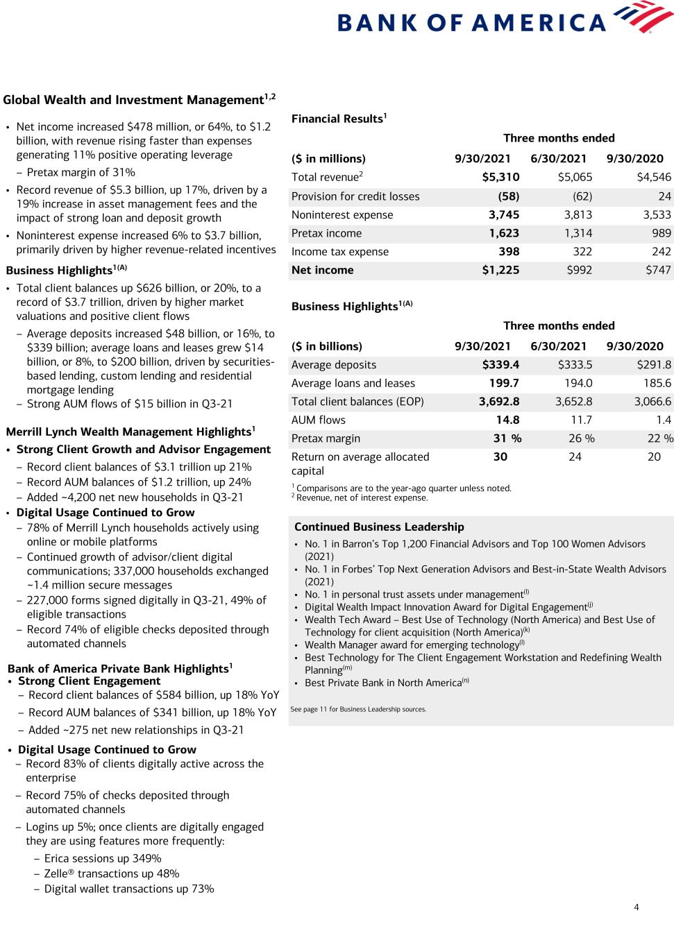 3 Consumer Banking1,2 Financial Results1 Three months ended ($ in millions) 9/30/2021 6/30/2021 9/30/2020 Total revenue2 $8,838 $8,186 $8,039 Provision for credit losses 247 (697) 479 Noninterest expense 4,558 4,859 4,842 Pretax income 4,033 4,024 2,718 Income tax expense 988 986 666 Net income $3,045 $3,038 $2,052 Business Highlights1,4(A) Three months ended ($ in billions) 9/30/2021 6/30/2021 9/30/2020 Average deposits $1,000.8 $979.1 $861.0 Average loans and leases 281.4 281.8 318.8 Consumer investment assets (EOP) 353.3 345.8 266.7 Active mobile banking users (MM) 32.5 31.8 30.6 Number of financial centers 4,215 4,296 4,309 Efficiency ratio 52 % 59 % 60 % Return on average allocated capital 31 32 21 Total Consumer Credit Card4 Average credit card outstanding balances $75.6 $73.4 $81.3 Total credit/debit spend 200.6 200.3 166.1 Risk-adjusted margin 10.7 % 9.8 % 9.7 % 1 Comparisons are to the year-ago quarter unless noted. 2 Revenue, net of interest expense. 3 Operating leverage is calculated as the year-over-year percentage change in revenue, net of interest expense, less the percentage change in noninterest expense. 4 The Consumer credit card portfolio includes Consumer Banking and GWIM. • Net income increased to $3.0 billion, as higher revenue and lower expenses combined to create 16% positive operating leverage3 • Revenue of $8.8 billion increased 10%, driven by improved NII and higher fee income • Provision for credit losses improved $232 million to $247 million, driven primarily by asset quality improvements – Net charge-off ratio improved to 0.69%, compared to 0.82% • Noninterest expense decreased 6% to $4.6 billion, driven by lower COVID-19 related costs Business Highlights1,4(A) • Average deposits grew $140 billion, or 16%, to $1 trillion; average loans and leases declined $37 billion, or 12%, to $281 billion, driven by lower first mortgage and card balances • Consumer investment assets grew $87 billion, or 32%, to $353 billion, driven by market performance and strong client flows – $21 billion of client flows since Q3-20 – 3.2 million client accounts, up 9% • Combined credit/debit card spend up $35 billion, or 21%; credit card up 26% and debit card up 17% • 7.8 million Consumer clients enrolled in Preferred Rewards, up 13%, with 99% annualized retention rate Digital Usage Continued to Grow1 • 40.9 million active digital banking users, up 4%, or 1.6 million • 1.4 million digital sales, up 27% • 2.6 billion digital logins • 15.1 million active Zelle® users, now including small businesses, sent and received 202 million transfers worth $60 billion, up 44% and 53% YoY, respectively • Clients booked ~853,000 digital appointments Continued Business Leadership • No. 1 in customer satisfaction for U.S. Online (a) Banking among National Banks by J.D. Power (b) • No. 1 in customer satisfaction for U.S. Mobile Banking Apps among National Banks by J.D. Power (b) • No. 1 in customer satisfaction for U.S. Retail Banking Advice by J.D. Power (c) • No. 1 in estimated U.S. Retail Deposits (d) • No. 1 Online Banking and Mobile Banking Functionality (e) • No. 1 in Prime Auto Credit Distribution of New Originations Among Peers (f) • No. 1 Mortgage and Home Equity Lending Digital Experience (g) • No. 1 Small Business Lender (h) See page 11 for Business Leadership sources.