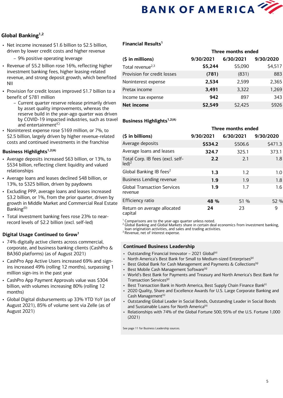 4 Global Wealth and Investment Management1,2 Financial Results1 Three months ended ($ in millions) 9/30/2021 6/30/2021 9/30/2020 Total revenue2 $5,310 $5,065 $4,546 Provision for credit losses (58) (62) 24 Noninterest expense 3,745 3,813 3,533 Pretax income 1,623 1,314 989 Income tax expense 398 322 242 Net income $1,225 $992 $747 Business Highlights1(A) Three months ended ($ in billions) 9/30/2021 6/30/2021 9/30/2020 Average deposits $339.4 $333.5 $291.8 Average loans and leases 199.7 194.0 185.6 Total client balances (EOP) 3,692.8 3,652.8 3,066.6 AUM flows 14.8 11.7 1.4 Pretax margin 31 % 26 % 22 % Return on average allocated capital 30 24 20 1 Comparisons are to the year-ago quarter unless noted. 2 Revenue, net of interest expense. Continued Business Leadership • No. 1 in Barron’s Top 1,200 Financial Advisors and Top 100 Women Advisors (2021) • No. 1 in Forbes’ Top Next Generation Advisors and Best-in-State Wealth Advisors (2021) • No. 1 in personal trust assets under management(l) • Digital Wealth Impact Innovation Award for Digital Engagement(j) • Wealth Tech Award – Best Use of Technology (North America) and Best Use of Technology for client acquisition (North America)(k) • Wealth Manager award for emerging technology(l) • Best Technology for The Client Engagement Workstation and Redefining Wealth Planning(m) • Best Private Bank in North America(n) See page 11 for Business Leadership sources. • Net income increased $478 million, or 64%, to $1.2 billion, with revenue rising faster than expenses generating 11% positive operating leverage – Pretax margin of 31% • Record revenue of $5.3 billion, up 17%, driven by a 19% increase in asset management fees and the impact of strong loan and deposit growth • Noninterest expense increased 6% to $3.7 billion, primarily driven by higher revenue-related incentives Business Highlights1(A) • Total client balances up $626 billion, or 20%, to a record of $3.7 trillion, driven by higher market valuations and positive client flows – Average deposits increased $48 billion, or 16%, to $339 billion; average loans and leases grew $14 billion, or 8%, to $200 billion, driven by securities- based lending, custom lending and residential mortgage lending – Strong AUM flows of $15 billion in Q3-21 Merrill Lynch Wealth Management Highlights1 • Strong Client Growth and Advisor Engagement – Record client balances of $3.1 trillion up 21% – Record AUM balances of $1.2 trillion, up 24% – Added ~4,200 net new households in Q3-21 • Digital Usage Continued to Grow – 78% of Merrill Lynch households actively using online or mobile platforms – Continued growth of advisor/client digital communications; 337,000 households exchanged ~1.4 million secure messages – 227,000 forms signed digitally in Q3-21, 49% of eligible transactions – Record 74% of eligible checks deposited through automated channels • Strong Client Engagement – Record client balances of $584 billion, up 18% YoY – Record AUM balances of $341 billion, up 18% YoY – Added ~275 net new relationships in Q3-21 Bank of America Private Bank Highlights1 • Digital Usage Continued to Grow – Record 83% of clients digitally active across the enterprise – Record 75% of checks deposited through automated channels – Logins up 5%; once clients are digitally engaged they are using features more frequently: – Erica sessions up 349% – Zelle® transactions up 48% – Digital wallet transactions up 73%