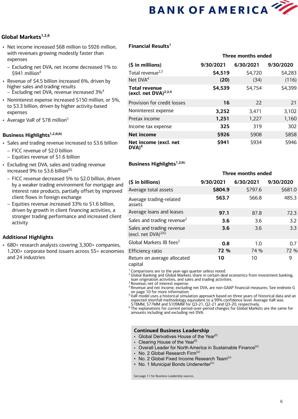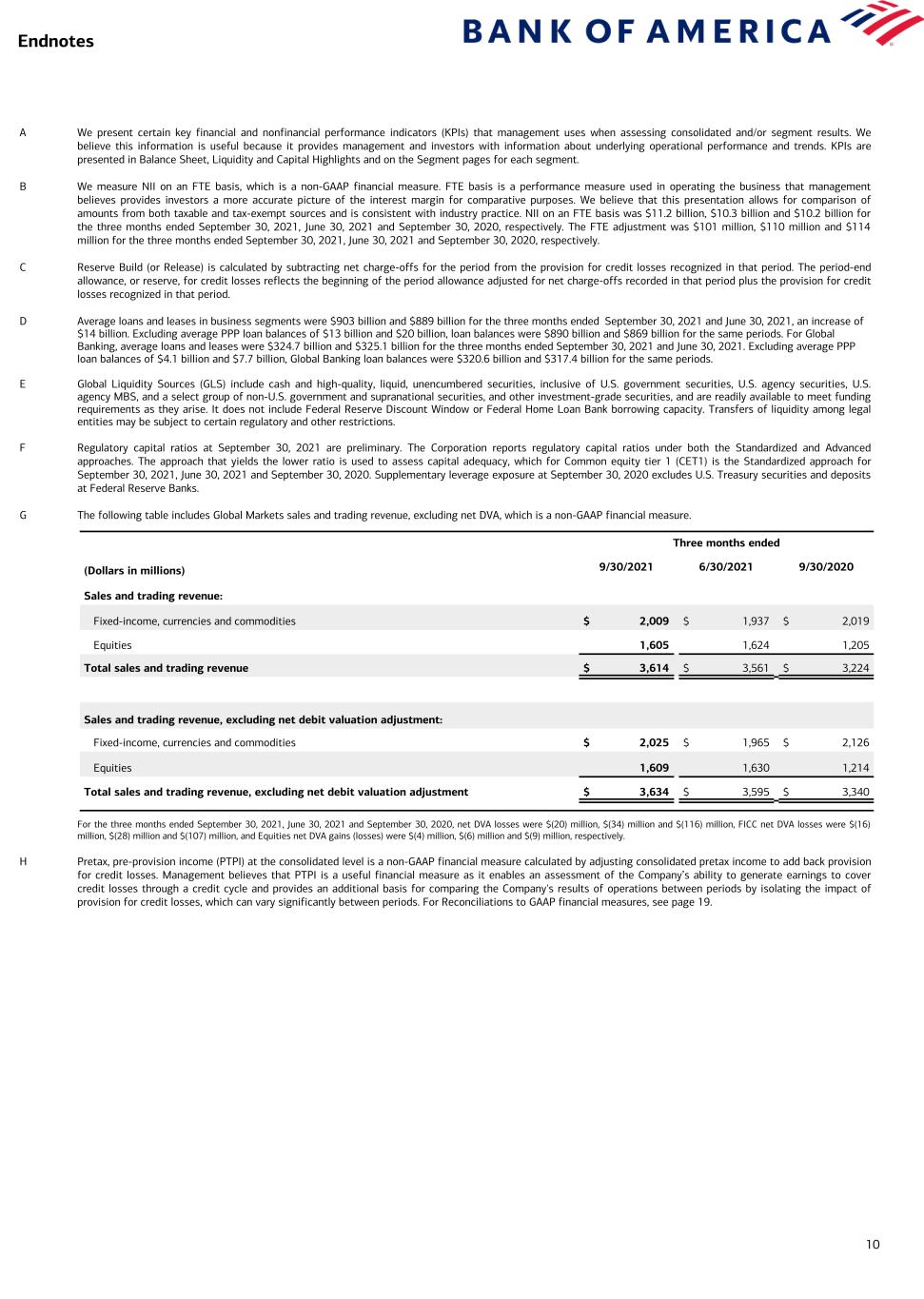 10 A We present certain key financial and nonfinancial performance indicators (KPIs) that management uses when assessing consolidated and/or segment results. We believe this information is useful because it provides management and investors with information about underlying operational performance and trends. KPIs are presented in Balance Sheet, Liquidity and Capital Highlights and on the Segment pages for each segment. B We measure NII on an FTE basis, which is a non-GAAP financial measure. FTE basis is a performance measure used in operating the business that management believes provides investors a more accurate picture of the interest margin for comparative purposes. We believe that this presentation allows for comparison of amounts from both taxable and tax-exempt sources and is consistent with industry practice. NII on an FTE basis was $11.2 billion, $10.3 billion and $10.2 billion for the three months ended September 30, 2021, June 30, 2021 and September 30, 2020, respectively. The FTE adjustment was $101 million, $110 million and $114 million for the three months ended September 30, 2021, June 30, 2021 and September 30, 2020, respectively. C Reserve Build (or Release) is calculated by subtracting net charge-offs for the period from the provision for credit losses recognized in that period. The period-end allowance, or reserve, for credit losses reflects the beginning of the period allowance adjusted for net charge-offs recorded in that period plus the provision for credit losses recognized in that period. D Average loans and leases in business segments were $903 billion and $889 billion for the three months ended September 30, 2021 and June 30, 2021, an increase of $14 billion. Excluding average PPP loan balances of $13 billion and $20 billion, loan balances were $890 billion and $869 billion for the same periods. For Global Banking, average loans and leases were $324.7 billion and $325.1 billion for the three months ended September 30, 2021 and June 30, 2021. Excluding average PPP loan balances of $4.1 billion and $7.7 billion, Global Banking loan balances were $320.6 billion and $317.4 billion for the same periods. E Global Liquidity Sources (GLS) include cash and high-quality, liquid, unencumbered securities, inclusive of U.S. government securities, U.S. agency securities, U.S. agency MBS, and a select group of non-U.S. government and supranational securities, and other investment-grade securities, and are readily available to meet funding requirements as they arise. It does not include Federal Reserve Discount Window or Federal Home Loan Bank borrowing capacity. Transfers of liquidity among legal entities may be subject to certain regulatory and other restrictions. F Regulatory capital ratios at September 30, 2021 are preliminary. The Corporation reports regulatory capital ratios under both the Standardized and Advanced approaches. The approach that yields the lower ratio is used to assess capital adequacy, which for Common equity tier 1 (CET1) is the Standardized approach for September 30, 2021, June 30, 2021 and September 30, 2020. Supplementary leverage exposure at September 30, 2020 excludes U.S. Treasury securities and deposits at Federal Reserve Banks. G The following table includes Global Markets sales and trading revenue, excluding net DVA, which is a non-GAAP financial measure. For the three months ended September 30, 2021, June 30, 2021 and September 30, 2020, net DVA losses were $(20) million, $(34) million and $(116) million, FICC net DVA losses were $(16) million, $(28) million and $(107) million, and Equities net DVA gains (losses) were $(4) million, $(6) million and $(9) million, respectively. H Pretax, pre-provision income (PTPI) at the consolidated level is a non-GAAP financial measure calculated by adjusting consolidated pretax income to add back provision for credit losses. Management believes that PTPI is a useful financial measure as it enables an assessment of the Company’s ability to generate earnings to cover credit losses through a credit cycle and provides an additional basis for comparing the Company's results of operations between periods by isolating the impact of provision for credit losses, which can vary significantly between periods. For Reconciliations to GAAP financial measures, see page 19. Endnotes Three months ended (Dollars in millions) 9/30/2021 6/30/2021 9/30/2020 Sales and trading revenue: Fixed-income, currencies and commodities $ 2,009 $ 1,937 $ 2,019 Equities 1,605 1,624 1,205 Total sales and trading revenue $ 3,614 $ 3,561 $ 3,224 Sales and trading revenue, excluding net debit valuation adjustment: Fixed-income, currencies and commodities $ 2,025 $ 1,965 $ 2,126 Equities 1,609 1,630 1,214 Total sales and trading revenue, excluding net debit valuation adjustment $ 3,634 $ 3,595 $ 3,340