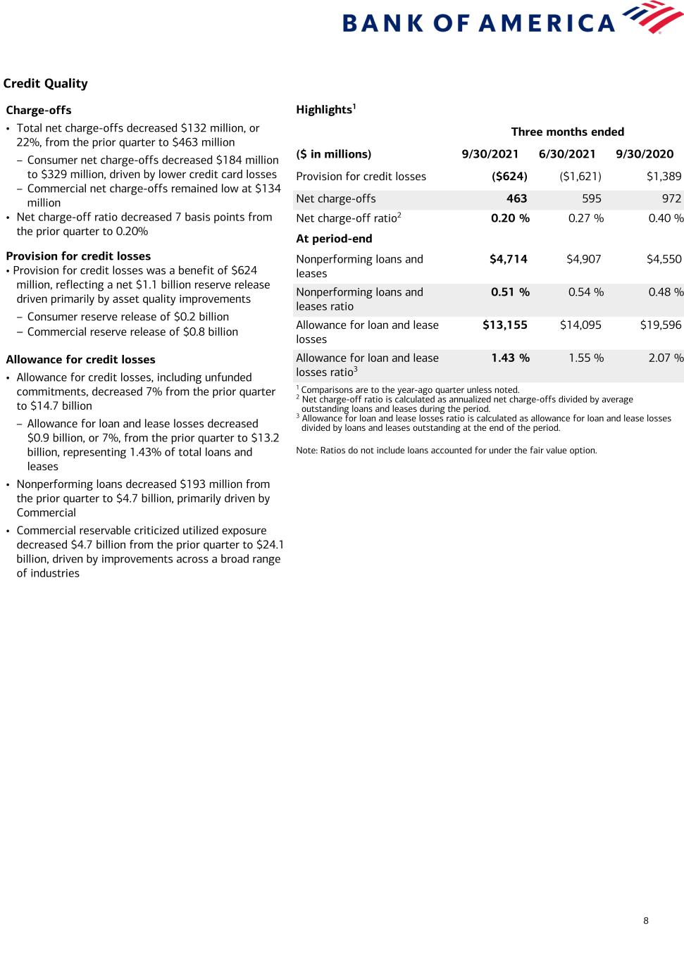 Current-period information is preliminary and based on company data available at the time of the presentation. 14 Bank of America Corporation and Subsidiaries Selected Financial Data (In millions, except per share data) Nine Months Ended September 30 Third Quarter 2021 Second Quarter 2021 Third Quarter 2020Summary Income Statement 2021 2020 Net interest income $ 31,524 $ 33,107 $ 11,094 $ 10,233 $ 10,129 Noninterest income 35,529 32,322 11,672 11,233 10,207 Total revenue, net of interest expense 67,053 65,429 22,766 21,466 20,336 Provision for credit losses (4,105) 11,267 (624) (1,621) 1,389 Noninterest expense 45,000 41,286 14,440 15,045 14,401 Income before income taxes 26,158 12,876 8,950 8,042 4,546 Income tax expense 1,193 452 1,259 (1,182) (335) Net income $ 24,965 $ 12,424 $ 7,691 $ 9,224 $ 4,881 Preferred stock dividends 1,181 1,159 431 260 441 Net income applicable to common shareholders $ 23,784 $ 11,265 $ 7,260 $ 8,964 $ 4,440 Average common shares issued and outstanding 8,583.1 8,762.6 8,430.7 8,620.8 8,732.9 Average diluted common shares issued and outstanding 8,702.2 8,800.5 8,492.8 8,735.5 8,777.5 Summary Average Balance Sheet Total debt securities $ 878,437 $ 491,664 $ 949,009 $ 895,902 $ 533,261 Total loans and leases 912,091 998,473 920,509 907,900 974,018 Total earning assets 2,572,166 2,284,909 2,654,015 2,578,668 2,374,926 Total assets 2,990,984 2,646,607 3,076,452 3,015,113 2,739,684 Total deposits 1,879,597 1,598,031 1,942,705 1,888,834 1,695,488 Common shareholders’ equity 250,889 242,626 252,043 250,948 243,896 Total shareholders’ equity 274,726 266,062 275,484 274,632 267,323 Performance Ratios Return on average assets 1.12 % 0.63 % 0.99 % 1.23 % 0.71 % Return on average common shareholders’ equity 12.67 6.20 11.43 14.33 7.24 Return on average tangible common shareholders’ equity (1) 17.61 8.71 15.85 19.90 10.16 Per Common Share Information Earnings $ 2.77 $ 1.29 $ 0.86 $ 1.04 $ 0.51 Diluted earnings 2.75 1.28 0.85 1.03 0.51 Dividends paid 0.57 0.54 0.21 0.18 0.18 Book value 30.22 28.33 30.22 29.89 28.33 Tangible book value (1) 21.69 20.23 21.69 21.61 20.23 Summary Period-End Balance Sheet September 30 2021 June 30 2021 September 30 2020 Total debt securities $ 968,617 $ 940,314 $ 584,397 Total loans and leases 927,736 918,928 955,172 Total earning assets 2,658,502 2,608,408 2,360,146 Total assets 3,085,446 3,029,894 2,738,452 Total deposits 1,964,804 1,909,142 1,702,880 Common shareholders’ equity 249,023 253,678 245,423 Total shareholders’ equity 272,464 277,119 268,850 Common shares issued and outstanding 8,241.2 8,487.2 8,661.5 Nine Months Ended September 30 Third Quarter 2021 Second Quarter 2021 Third Quarter 2020Credit Quality 2021 2020 Total net charge-offs $ 1,881 $ 3,240 $ 463 $ 595 $ 972 Net charge-offs as a percentage of average loans and leases outstanding (2) 0.28 % 0.44 % 0.20 % 0.27 % 0.40 % Provision for credit losses $ (4,105) $ 11,267 $ (624) $ (1,621) $ 1,389 September 30 2021 June 30 2021 September 30 2020 Total nonperforming loans, leases and foreclosed properties (3) $ 4,831 $ 5,031 $ 4,730 Nonperforming loans, leases and foreclosed properties as a percentage of total loans, leases and foreclosed properties (3) 0.52 % 0.55 % 0.50 % Allowance for loan and lease losses $ 13,155 $ 14,095 $ 19,596 Allowance for loan and lease losses as a percentage of total loans and leases outstanding (2) 1.43 % 1.55 % 2.07 % For footnotes, see page 15.