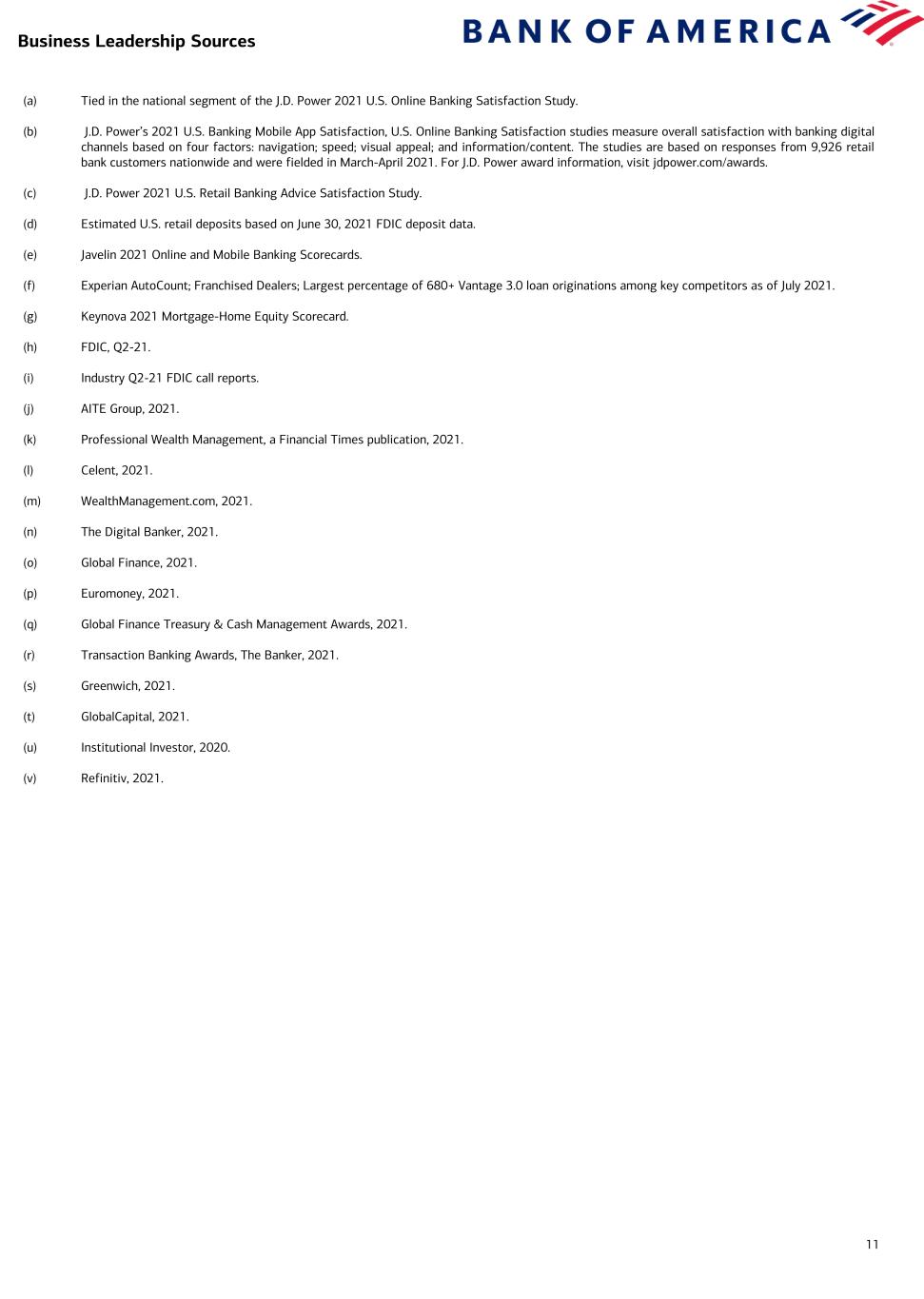 11 (a) Tied in the national segment of the J.D. Power 2021 U.S. Online Banking Satisfaction Study. (b) J.D. Power’s 2021 U.S. Banking Mobile App Satisfaction, U.S. Online Banking Satisfaction studies measure overall satisfaction with banking digital channels based on four factors: navigation; speed; visual appeal; and information/content. The studies are based on responses from 9,926 retail bank customers nationwide and were fielded in March-April 2021. For J.D. Power award information, visit jdpower.com/awards. (c) J.D. Power 2021 U.S. Retail Banking Advice Satisfaction Study. (d) Estimated U.S. retail deposits based on June 30, 2021 FDIC deposit data. (e) Javelin 2021 Online and Mobile Banking Scorecards. (f) Experian AutoCount; Franchised Dealers; Largest percentage of 680+ Vantage 3.0 loan originations among key competitors as of July 2021. (g) Keynova 2021 Mortgage-Home Equity Scorecard. (h) FDIC, Q2-21. (i) Industry Q2-21 FDIC call reports. (j) AITE Group, 2021. (k) Professional Wealth Management, a Financial Times publication, 2021. (l) Celent, 2021. (m) WealthManagement.com, 2021. (n) The Digital Banker, 2021. (o) Global Finance, 2021. (p) Euromoney, 2021. (q) Global Finance Treasury & Cash Management Awards, 2021. (r) Transaction Banking Awards, The Banker, 2021. (s) Greenwich, 2021. (t) GlobalCapital, 2021. (u) Institutional Investor, 2020. (v) Refinitiv, 2021. Business Leadership Sources