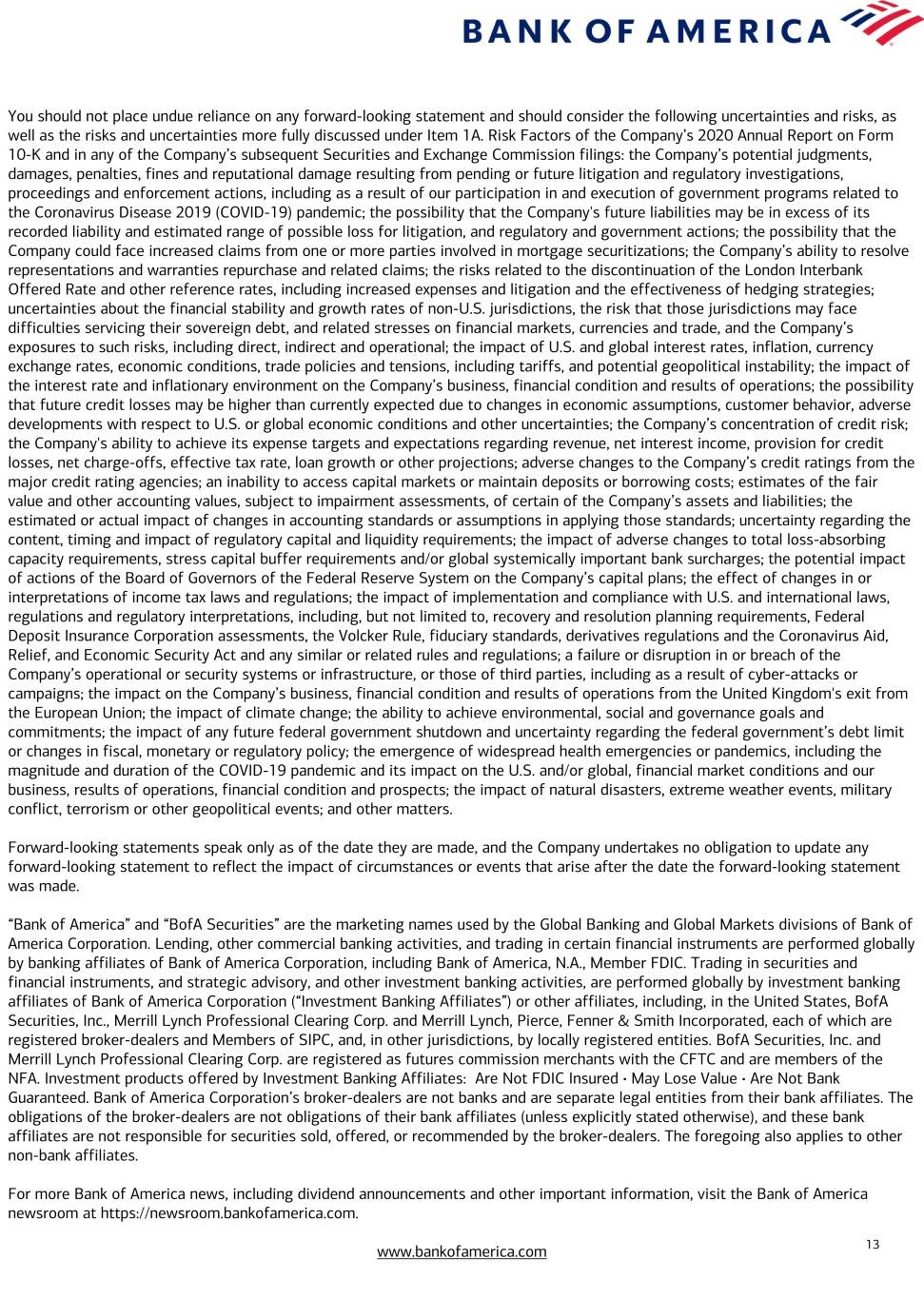 13 You should not place undue reliance on any forward-looking statement and should consider the following uncertainties and risks, as well as the risks and uncertainties more fully discussed under Item 1A. Risk Factors of the Company’s 2020 Annual Report on Form 10-K and in any of the Company’s subsequent Securities and Exchange Commission filings: the Company’s potential judgments, damages, penalties, fines and reputational damage resulting from pending or future litigation and regulatory investigations, proceedings and enforcement actions, including as a result of our participation in and execution of government programs related to the Coronavirus Disease 2019 (COVID-19) pandemic; the possibility that the Company's future liabilities may be in excess of its recorded liability and estimated range of possible loss for litigation, and regulatory and government actions; the possibility that the Company could face increased claims from one or more parties involved in mortgage securitizations; the Company’s ability to resolve representations and warranties repurchase and related claims; the risks related to the discontinuation of the London Interbank Offered Rate and other reference rates, including increased expenses and litigation and the effectiveness of hedging strategies; uncertainties about the financial stability and growth rates of non-U.S. jurisdictions, the risk that those jurisdictions may face difficulties servicing their sovereign debt, and related stresses on financial markets, currencies and trade, and the Company’s exposures to such risks, including direct, indirect and operational; the impact of U.S. and global interest rates, inflation, currency exchange rates, economic conditions, trade policies and tensions, including tariffs, and potential geopolitical instability; the impact of the interest rate and inflationary environment on the Company’s business, financial condition and results of operations; the possibility that future credit losses may be higher than currently expected due to changes in economic assumptions, customer behavior, adverse developments with respect to U.S. or global economic conditions and other uncertainties; the Company’s concentration of credit risk; the Company's ability to achieve its expense targets and expectations regarding revenue, net interest income, provision for credit losses, net charge-offs, effective tax rate, loan growth or other projections; adverse changes to the Company’s credit ratings from the major credit rating agencies; an inability to access capital markets or maintain deposits or borrowing costs; estimates of the fair value and other accounting values, subject to impairment assessments, of certain of the Company’s assets and liabilities; the estimated or actual impact of changes in accounting standards or assumptions in applying those standards; uncertainty regarding the content, timing and impact of regulatory capital and liquidity requirements; the impact of adverse changes to total loss-absorbing capacity requirements, stress capital buffer requirements and/or global systemically important bank surcharges; the potential impact of actions of the Board of Governors of the Federal Reserve System on the Company’s capital plans; the effect of changes in or interpretations of income tax laws and regulations; the impact of implementation and compliance with U.S. and international laws, regulations and regulatory interpretations, including, but not limited to, recovery and resolution planning requirements, Federal Deposit Insurance Corporation assessments, the Volcker Rule, fiduciary standards, derivatives regulations and the Coronavirus Aid, Relief, and Economic Security Act and any similar or related rules and regulations; a failure or disruption in or breach of the Company’s operational or security systems or infrastructure, or those of third parties, including as a result of cyber-attacks or campaigns; the impact on the Company’s business, financial condition and results of operations from the United Kingdom's exit from the European Union; the impact of climate change; the ability to achieve environmental, social and governance goals and commitments; the impact of any future federal government shutdown and uncertainty regarding the federal government’s debt limit or changes in fiscal, monetary or regulatory policy; the emergence of widespread health emergencies or pandemics, including the magnitude and duration of the COVID-19 pandemic and its impact on the U.S. and/or global, financial market conditions and our business, results of operations, financial condition and prospects; the impact of natural disasters, extreme weather events, military conflict, terrorism or other geopolitical events; and other matters. Forward-looking statements speak only as of the date they are made, and the Company undertakes no obligation to update any forward-looking statement to reflect the impact of circumstances or events that arise after the date the forward-looking statement was made. “Bank of America” and “BofA Securities” are the marketing names used by the Global Banking and Global Markets divisions of Bank of America Corporation. Lending, other commercial banking activities, and trading in certain financial instruments are performed globally by banking affiliates of Bank of America Corporation, including Bank of America, N.A., Member FDIC. Trading in securities and financial instruments, and strategic advisory, and other investment banking activities, are performed globally by investment banking affiliates of Bank of America Corporation (“Investment Banking Affiliates”) or other affiliates, including, in the United States, BofA Securities, Inc., Merrill Lynch Professional Clearing Corp. and Merrill Lynch, Pierce, Fenner & Smith Incorporated, each of which are registered broker-dealers and Members of SIPC, and, in other jurisdictions, by locally registered entities. BofA Securities, Inc. and Merrill L