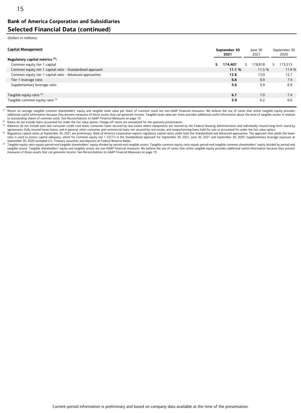 Current-period information is preliminary and based on company data available at the time of the presentation. 15 Bank of America Corporation and Subsidiaries Selected Financial Data (continued) (Dollars in millions) Capital Management September 30 2021 June 30 2021 September 30 2020 Regulatory capital metrics (4): Common equity tier 1 capital $ 174,407 $ 178,818 $ 173,213 Common equity tier 1 capital ratio - Standardized approach 11.1 % 11.5 % 11.9 % Common equity tier 1 capital ratio - Advanced approaches 12.6 13.0 12.7 Tier 1 leverage ratio 6.6 6.9 7.4 Supplementary leverage ratio 5.6 5.9 6.9 Tangible equity ratio (5) 6.7 7.0 7.4 Tangible common equity ratio (5) 5.9 6.2 6.6 (1) Return on average tangible common shareholders’ equity and tangible book value per share of common stock are non-GAAP financial measures. We believe the use of ratios that utilize tangible equity provides additional useful information because they present measures of those assets that can generate income. Tangible book value per share provides additional useful information about the level of tangible assets in relation to outstanding shares of common stock. See Reconciliations to GAAP Financial Measures on page 19. (2) Ratios do not include loans accounted for under the fair value option. Charge-off ratios are annualized for the quarterly presentation. (3) Balances do not include past due consumer credit card loans, consumer loans secured by real estate where repayments are insured by the Federal Housing Administration and individually insured long-term stand-by agreements (fully insured home loans), and in general, other consumer and commercial loans not secured by real estate, and nonperforming loans held for sale or accounted for under the fair value option. (4) Regulatory capital ratios at September 30, 2021 are preliminary. Bank of America Corporation reports regulatory capital ratios under both the Standardized and Advanced approaches. The approach that yields the lower ratio is used to assess capital adequacy, which for Common equity tier 1 (CET1) is the Standardized approach for September 30, 2021, June 30, 2021 and September 30, 2020. Supplementary leverage exposure at September 30, 2020 excluded U.S. Treasury securities and deposits at Federal Reserve Banks. (5) Tangible equity ratio equals period-end tangible shareholders’ equity divided by period-end tangible assets. Tangible common equity ratio equals period-end tangible common shareholders’ equity divided by period-end tangible assets. Tangible shareholders’ equity and tangible assets are non-GAAP financial measures. We believe the use of ratios that utilize tangible equity provides additional useful information because they present measures of those assets that can generate income. See Reconciliations to GAAP Financial Measures on page 19.