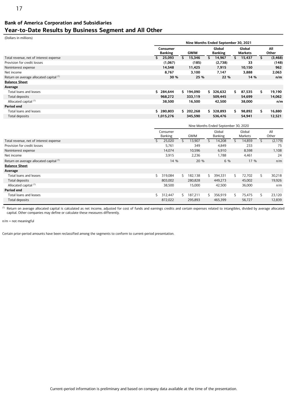 Current-period information is preliminary and based on company data available at the time of the presentation. 16 Bank of America Corporation and Subsidiaries Quarterly Results by Business Segment and All Other (Dollars in millions) Third Quarter 2021 Consumer Banking GWIM Global Banking Global Markets All Other Total revenue, net of interest expense $ 8,838 $ 5,310 $ 5,244 $ 4,519 $ (1,044) Provision for credit losses 247 (58) (781) 16 (48) Noninterest expense 4,558 3,745 2,534 3,252 351 Net income (losses) 3,045 1,225 2,549 926 (54) Return on average allocated capital (1) 31 % 30 % 24 % 10 % n/m Balance Sheet Average Total loans and leases $ 281,380 $ 199,664 $ 324,736 $ 97,148 $ 17,581 Total deposits 1,000,765 339,357 534,166 54,650 13,767 Allocated capital (1) 38,500 16,500 42,500 38,000 n/m Quarter end Total loans and leases $ 280,803 $ 202,268 $ 328,893 $ 98,892 $ 16,880 Total deposits 1,015,276 345,590 536,476 54,941 12,521 Second Quarter 2021 Consumer Banking GWIM Global Banking Global Markets All Other Total revenue, net of interest expense $ 8,186 $ 5,065 $ 5,090 $ 4,720 $ (1,485) Provision for credit losses (697) (62) (831) 22 (53) Noninterest expense 4,859 3,813 2,599 3,471 303 Net income 3,038 992 2,425 908 1,861 Return on average allocated capital (1) 32 % 24 % 23 % 10 % n/m Balance Sheet Average Total loans and leases $ 281,767 $ 193,988 $ 325,110 $ 87,826 $ 19,209 Total deposits 979,072 333,487 506,618 55,584 14,073 Allocated capital (1) 38,500 16,500 42,500 38,000 n/m Quarter end Total loans and leases $ 282,900 $ 198,361 $ 323,256 $ 96,105 $ 18,306 Total deposits 987,655 330,624 520,026 57,297 13,540 Third Quarter 2020 Consumer Banking GWIM Global Banking Global Markets All Other Total revenue, net of interest expense $ 8,039 $ 4,546 $ 4,517 $ 4,283 $ (935) Provision for credit losses 479 24 883 21 (18) Noninterest expense 4,842 3,533 2,365 3,102 559 Net income 2,052 747 926 858 298 Return on average allocated capital (1) 21 % 20 % 9 % 9 % n/m Balance Sheet Average Total loans and leases $ 318,751 $ 185,587 $ 373,118 $ 72,319 $ 24,243 Total deposits 860,999 291,845 471,288 56,475 14,881 Allocated capital (1) 38,500 15,000 42,500 36,000 n/m Quarter end Total loans and leases $ 312,447 $ 187,211 $ 356,919 $ 75,475 $ 23,120 Total deposits 872,022 295,893 465,399 56,727 12,839 (1) Return on average allocated capital is calculated as net income, adjusted for cost of funds and earnings credits and certain expenses related to intangibles, divided by average allocated capital. Other companies may define or calculate these measures differently. n/m = not meaningful Certain prior-period amounts have been reclassified among the segments to conform to current-period presentation. The Company reports the results of operations of its four business segments and All Other on a fully taxable-equivalent (FTE) basis.