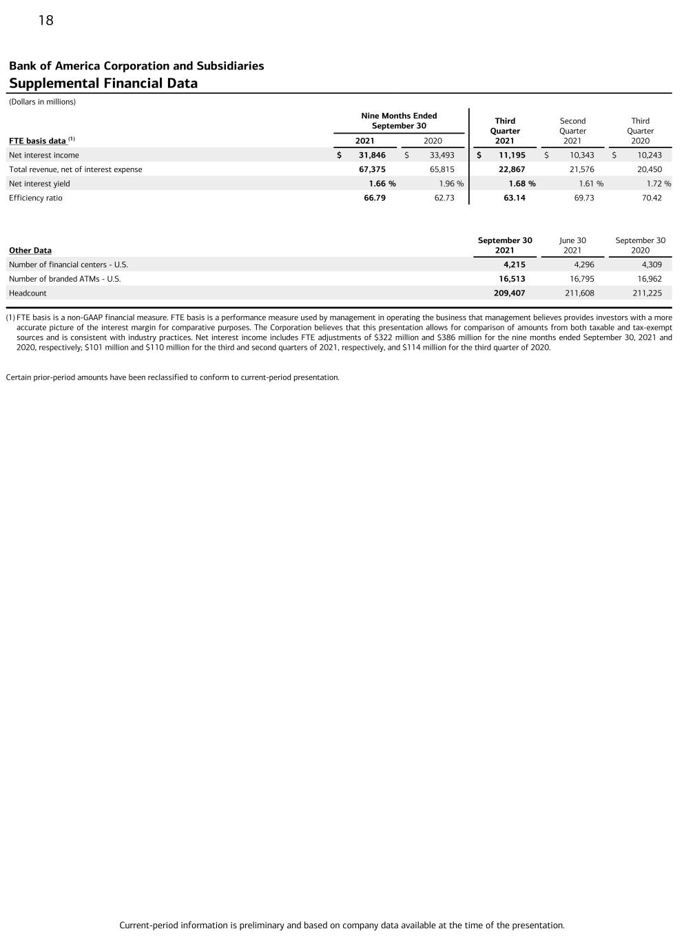 Current-period information is preliminary and based on company data available at the time of the presentation. 18 Bank of America Corporation and Subsidiaries Supplemental Financial Data (Dollars in millions) Nine Months Ended September 30 Third Quarter 2021 Second Quarter 2021 Third Quarter 2020FTE basis data (1) 2021 2020 Net interest income $ 31,846 $ 33,493 $ 11,195 $ 10,343 $ 10,243 Total revenue, net of interest expense 67,375 65,815 22,867 21,576 20,450 Net interest yield 1.66 % 1.96 % 1.68 % 1.61 % 1.72 % Efficiency ratio 66.79 62.73 63.14 69.73 70.42 Other Data September 30 2021 June 30 2021 September 30 2020 Number of financial centers - U.S. 4,215 4,296 4,309 Number of branded ATMs - U.S. 16,513 16,795 16,962 Headcount 209,407 211,608 211,225 (1) FTE basis is a non-GAAP financial measure. FTE basis is a performance measure used by management in operating the business that management believes provides investors with a more accurate picture of the interest margin for comparative purposes. The Corporation believes that this presentation allows for comparison of amounts from both taxable and tax-exempt sources and is consistent with industry practices. Net interest income includes FTE adjustments of $322 million and $386 million for the nine months ended September 30, 2021 and 2020, respectively; $101 million and $110 million for the third and second quarters of 2021, respectively, and $114 million for the third quarter of 2020. Certain prior-period amounts have been reclassified to conform to current-period presentation.
