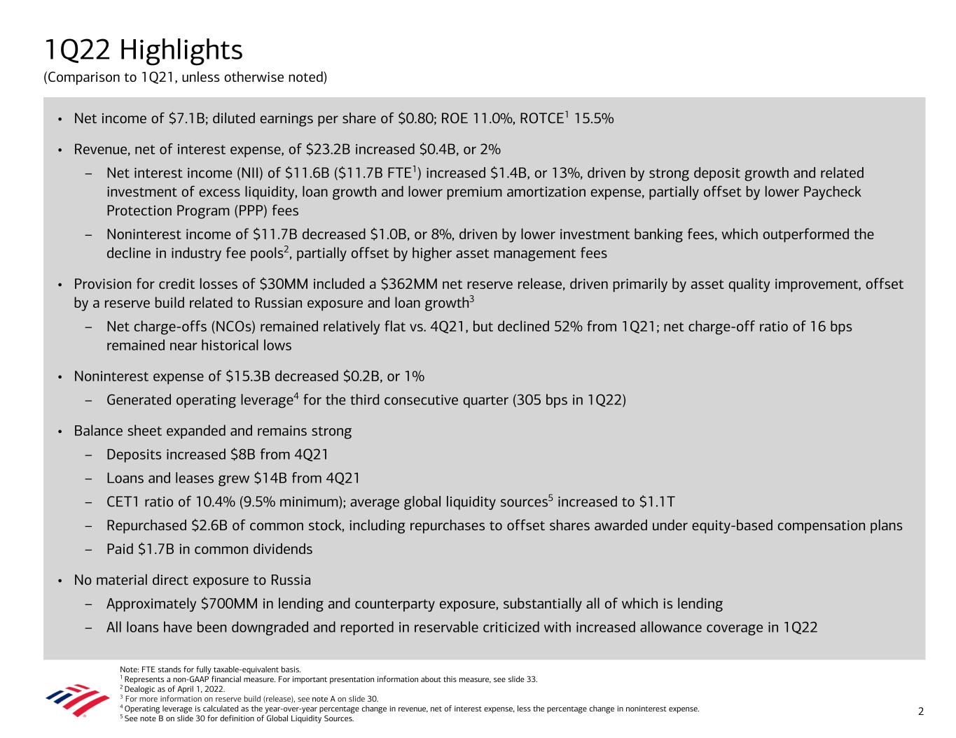 1Q22 Highlights (Comparison to 1Q21, unless otherwise noted) • Net income of $7.1B; diluted earnings per share of $0.80; ROE 11.0%, ROTCE1 15.5% • Revenue, net of interest expense, of $23.2B increased $0.4B, or 2% – Net interest income (NII) of $11.6B ($11.7B FTE1) increased $1.4B, or 13%, driven by strong deposit growth and related investment of excess liquidity, loan growth and lower premium amortization expense, partially offset by lower Paycheck Protection Program (PPP) fees – Noninterest income of $11.7B decreased $1.0B, or 8%, driven by lower investment banking fees, which outperformed the decline in industry fee pools2, partially offset by higher asset management fees • Provision for credit losses of $30MM included a $362MM net reserve release, driven primarily by asset quality improvement, offset by a reserve build related to Russian exposure and loan growth3 – Net charge-offs (NCOs) remained relatively flat vs. 4Q21, but declined 52% from 1Q21; net charge-off ratio of 16 bps remained near historical lows • Noninterest expense of $15.3B decreased $0.2B, or 1% – Generated operating leverage4 for the third consecutive quarter (305 bps in 1Q22) • Balance sheet expanded and remains strong – Deposits increased $8B from 4Q21 – Loans and leases grew $14B from 4Q21 – CET1 ratio of 10.4% (9.5% minimum); average global liquidity sources5 increased to $1.1T – Repurchased $2.6B of common stock, including repurchases to offset shares awarded under equity-based compensation plans – Paid $1.7B in common dividends • No material direct exposure to Russia – Approximately $700MM in lending and counterparty exposure, substantially all of which is lending – All loans have been downgraded and reported in reservable criticized with increased allowance coverage in 1Q22 2 Note: FTE stands for fully taxable-equivalent basis. 1 Represents a non-GAAP financial measure. For important presentation information about this measure, see slide 33. 2 Dealogic as of April 1, 2022. 3 For more information on reserve build (release), see note A on slide 30. 4 Operating leverage is calculated as the year-over-year percentage change in revenue, net of interest expense, less the percentage change in noninterest expense. 5 See note B on slide 30 for definition of Global Liquidity Sources.