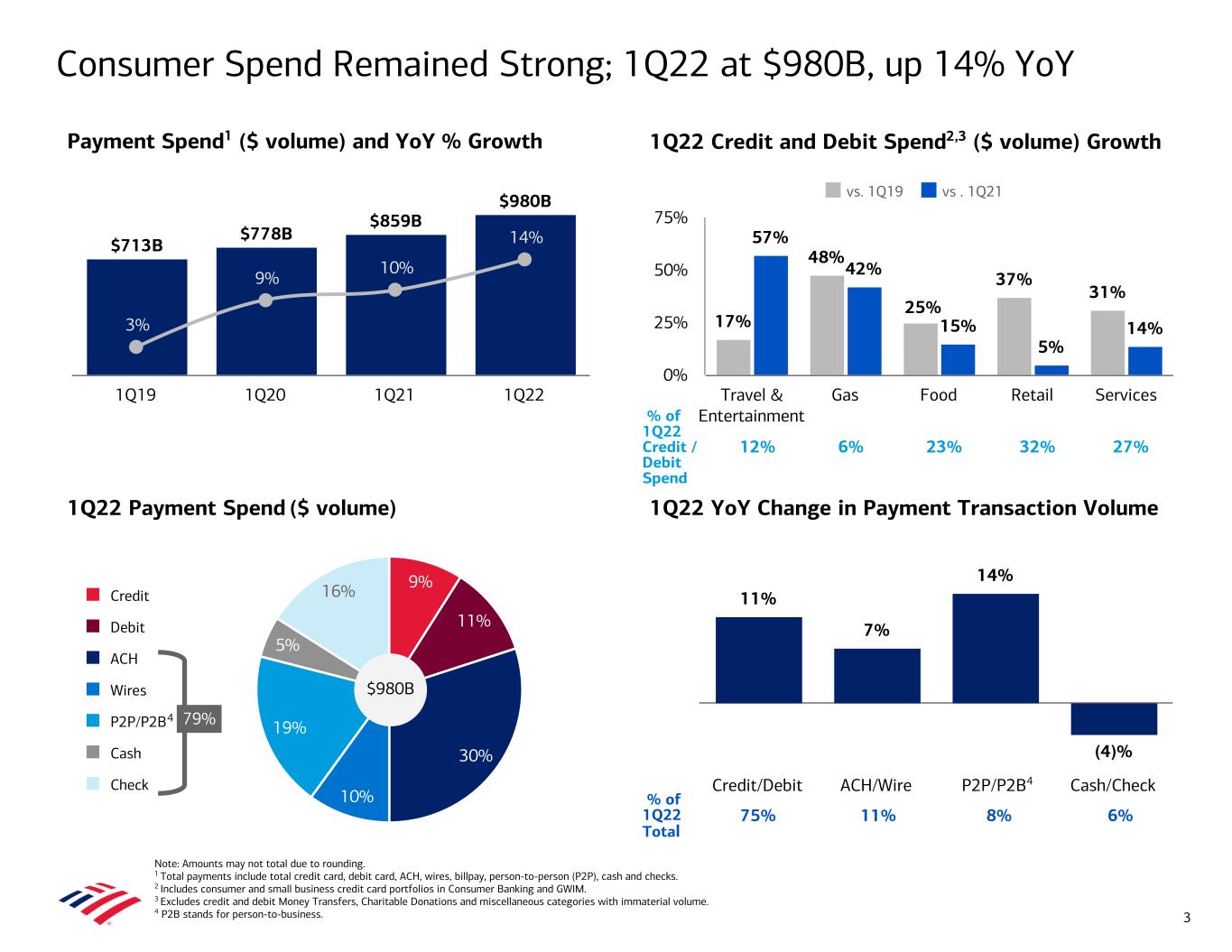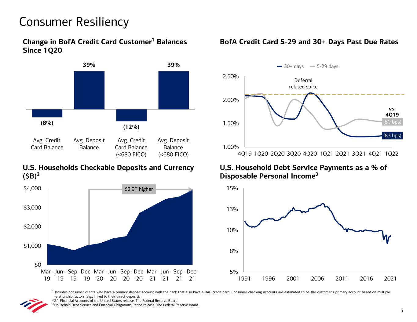 17% 48% 25% 37% 31% 57% 42% 15% 5% 14% vs. 1Q19 vs . 1Q21 Travel & Entertainment Gas Food Retail Services 0% 25% 50% 75% 9% 11% 30% 10% 19% 5% 16%Credit Debit ACH Wires P2P/P2B Cash Check 1Q22 YoY Change in Payment Transaction Volume Consumer Spend Remained Strong; 1Q22 at $980B, up 14% YoY Note: Amounts may not total due to rounding. 1 Total payments include total credit card, debit card, ACH, wires, billpay, person-to-person (P2P), cash and checks. 2 Includes consumer and small business credit card portfolios in Consumer Banking and GWIM. 3 Excludes credit and debit Money Transfers, Charitable Donations and miscellaneous categories with immaterial volume. 4 P2B stands for person-to-business. 1Q22 Credit and Debit Spend2,3 ($ volume) Growth Payment Spend1 ($ volume) and YoY % Growth 3 1Q22 Payment Spend ($ volume) 11% 7% 14% (4)% Credit/Debit ACH/Wire P2P/P2B Cash/Check $713B $778B $859B $980B 3% 9% 10% 14% 1Q19 1Q20 1Q21 1Q22 % of 1Q22 Total 75% 11% 8% 6% $980B 79%4 4 % of 1Q22 Credit / Debit Spend 12% 6% 23% 32% 27%