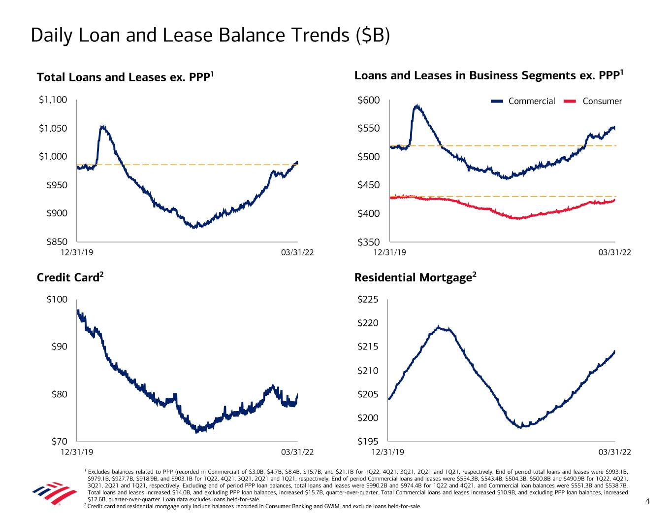 Daily Loan and Lease Balance Trends ($B) 1 Excludes balances related to PPP (recorded in Commercial) of $3.0B, $4.7B, $8.4B, $15.7B, and $21.1B for 1Q22, 4Q21, 3Q21, 2Q21 and 1Q21, respectively. End of period total loans and leases were $993.1B, $979.1B, $927.7B, $918.9B, and $903.1B for 1Q22, 4Q21, 3Q21, 2Q21 and 1Q21, respectively. End of period Commercial loans and leases were $554.3B, $543.4B, $504.3B, $500.8B and $490.9B for 1Q22, 4Q21, 3Q21, 2Q21 and 1Q21, respectively. Excluding end of period PPP loan balances, total loans and leases were $990.2B and $974.4B for 1Q22 and 4Q21, and Commercial loan balances were $551.3B and $538.7B. Total loans and leases increased $14.0B, and excluding PPP loan balances, increased $15.7B, quarter-over-quarter. Total Commercial loans and leases increased $10.9B, and excluding PPP loan balances, increased $12.6B, quarter-over-quarter. Loan data excludes loans held-for-sale. 2 Credit card and residential mortgage only include balances recorded in Consumer Banking and GWIM, and exclude loans held-for-sale. Loans and Leases in Business Segments ex. PPP1 Credit Card2 Residential Mortgage2 Total Loans and Leases ex. PPP1 4 12/31/19 03/31/22 $850 $900 $950 $1,000 $1,050 $1,100 12/31/19 03/31/22 $350 $400 $450 $500 $550 $600 12/31/19 03/31/22 $70 $80 $90 $100 12/31/19 03/31/22 $195 $200 $205 $210 $215 $220 $225 Commercial Consumer