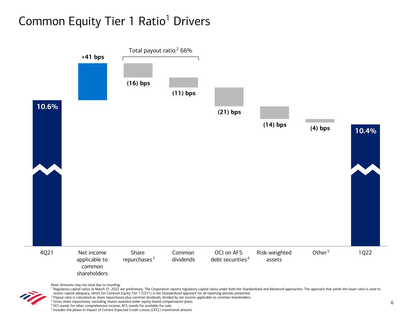 10.6% +41 bps (16) bps (11) bps (21) bps (14) bps (4) bps 10.4% 4Q21 Net income applicable to common shareholders Share repurchases Common dividends OCI on AFS debt securities Risk-weighted assets Other 1Q22 Common Equity Tier 1 Ratio1 Drivers Note: Amounts may not total due to rounding. 1 Regulatory capital ratios at March 31, 2022 are preliminary. The Corporation reports regulatory capital ratios under both the Standardized and Advanced approaches. The approach that yields the lower ratio is used to assess capital adequacy, which for Common Equity Tier 1 (CET1) is the Standardized approach for all reporting periods presented. 2 Payout ratio is calculated as share repurchases plus common dividends, divided by net income applicable to common shareholders. 3 Gross share repurchases, excluding shares awarded under equity-based compensation plans. 4 OCI stands for other comprehensive income; AFS stands for available-for-sale. 5 Includes the phase-in impact of Current Expected Credit Losses (CECL) transitional amount. 6 3 Total payout ratio:2 66% 4 5