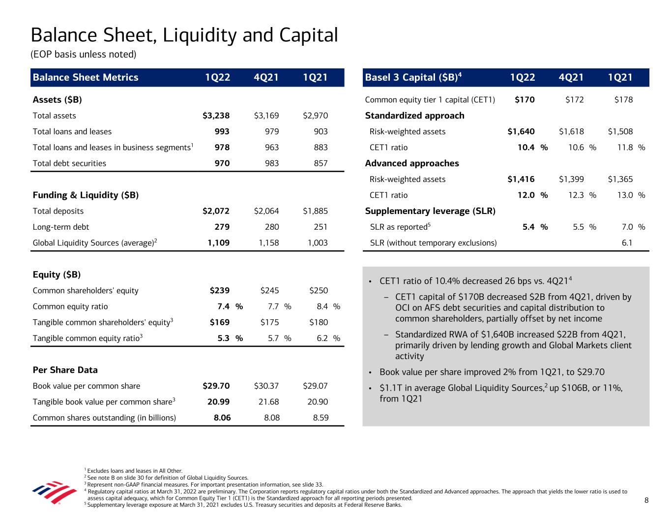 Notes: Amounts may not total due to rounding. 1 For more information on reserve build (release), see note A on slide 30. 2 Represent non-GAAP financial measures. For more information on pretax, pre-provision income and a reconciliation to GAAP, see note C on slide 30. For important presentation information about these measures, see slide 33. Summary Income Statement ($B, except per share data) 1Q22 4Q21 Inc / (Dec) 1Q21 Inc / (Dec) Total Revenue, net of interest expense $23.2 $22.1 $1.2 5 % $22.8 $0.4 2 % Provision (benefit) for credit losses — (0.5) 0.5 (106) (1.9) 1.9 (102) Net charge-offs 0.4 0.4 — 8 0.8 (0.4) (52) Reserve build (release)1 (0.4) (0.9) 0.5 (57) (2.7) 2.3 (87) Noninterest Expense 15.3 14.7 0.6 4 15.5 (0.2) (1) Pretax Income 7.9 7.8 0.1 1 9.2 (1.3) (14) Pretax, pre-provision income2 7.9 7.3 0.6 8 7.3 0.6 8 Income tax expense 0.8 0.8 — 1 1.1 (0.3) (27) Net income $7.1 $7.0 $0.1 1 $8.1 ($1.0) (12) Diluted earnings per share $0.80 $0.82 ($0.02) (2) $0.86 ($0.06) (7) Average diluted common shares (in millions) 8,202 8,305 (103) (1) 8,756 (554) (6) Return Metrics and Efficiency Ratio Return on average assets 0.89 % 0.88 % 1.13 % Return on average common shareholders' equity 11.0 10.9 12.3 Return on average tangible common shareholders' equity2 15.5 15.2 17.1 Efficiency ratio 66 67 68 1Q22 Financial Results 7