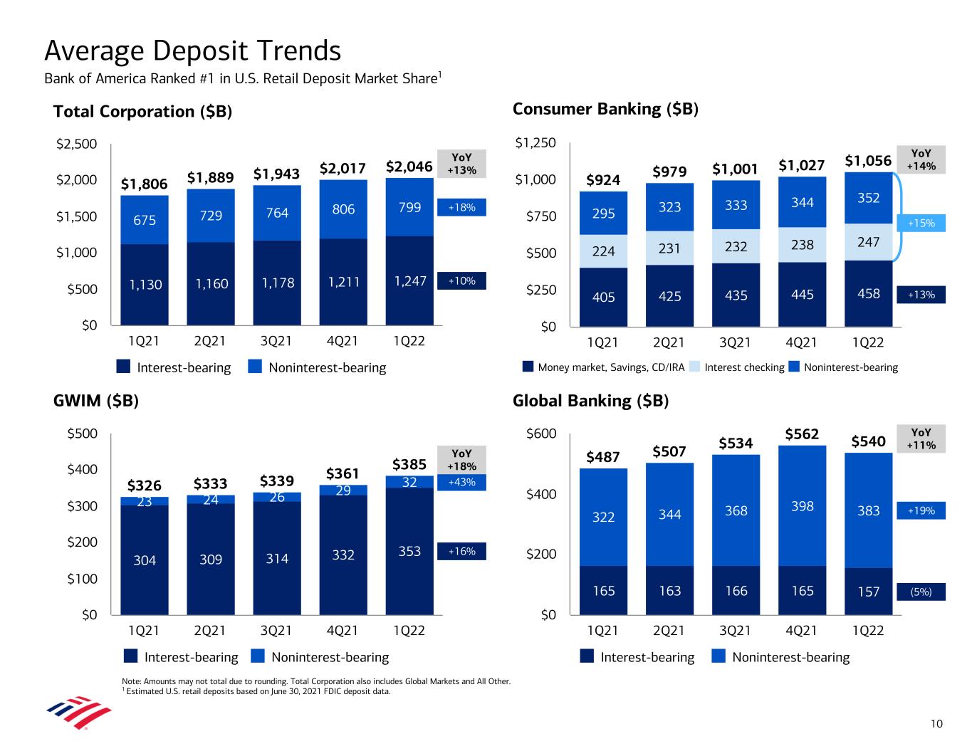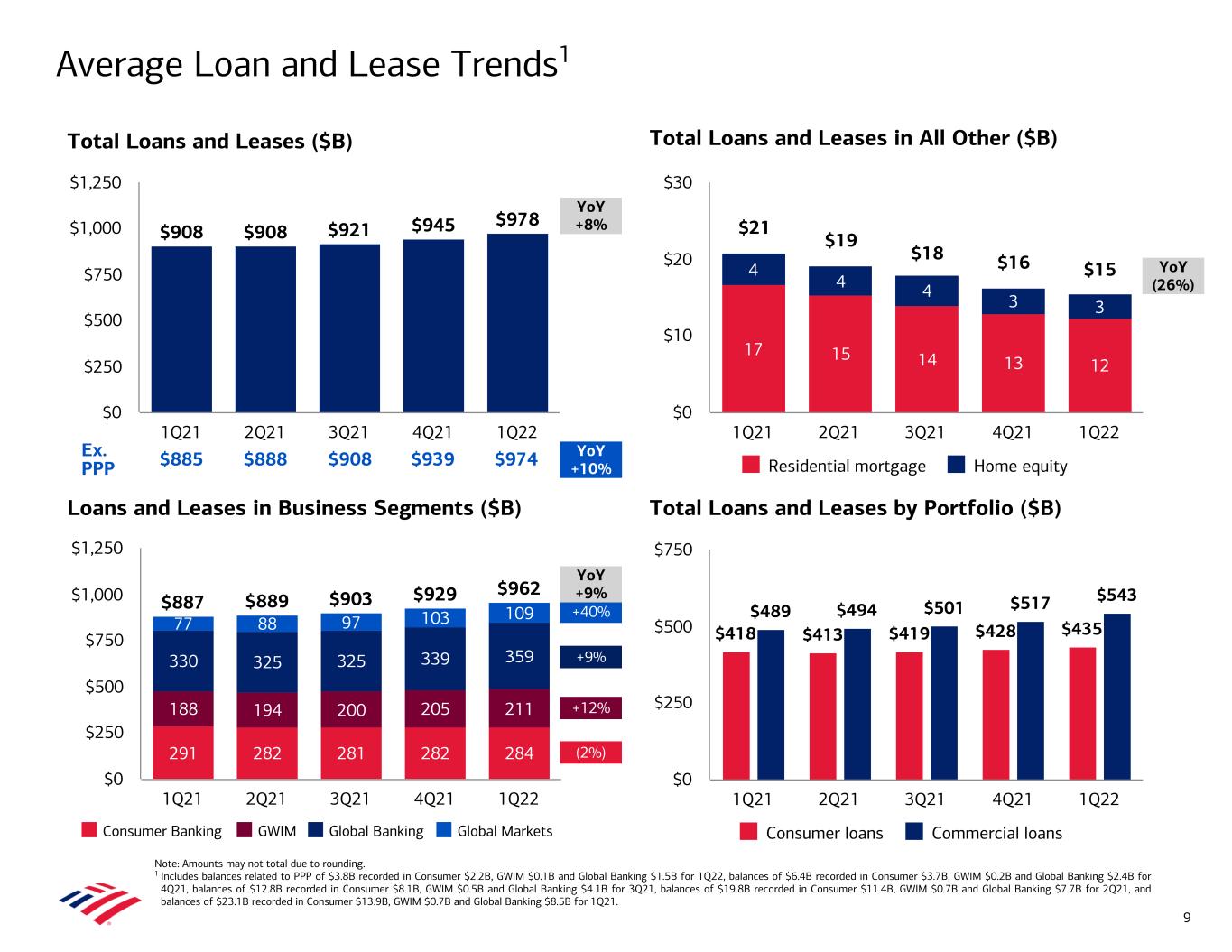 $887 $889 $903 $929 $962 291 282 281 282 284 188 194 200 205 211 330 325 325 339 359 77 88 97 103 109 Consumer Banking GWIM Global Banking Global Markets 1Q21 2Q21 3Q21 4Q21 1Q22 $0 $250 $500 $750 $1,000 $1,250 $908 $908 $921 $945 $978 1Q21 2Q21 3Q21 4Q21 1Q22 $0 $250 $500 $750 $1,000 $1,250 (2%) +12% +9% +40% Average Loan and Lease Trends1 YoY +8% YoY +9% YoY (26%) Note: Amounts may not total due to rounding. 1 Includes balances related to PPP of $3.8B recorded in Consumer $2.2B, GWIM $0.1B and Global Banking $1.5B for 1Q22, balances of $6.4B recorded in Consumer $3.7B, GWIM $0.2B and Global Banking $2.4B for 4Q21, balances of $12.8B recorded in Consumer $8.1B, GWIM $0.5B and Global Banking $4.1B for 3Q21, balances of $19.8B recorded in Consumer $11.4B, GWIM $0.7B and Global Banking $7.7B for 2Q21, and balances of $23.1B recorded in Consumer $13.9B, GWIM $0.7B and Global Banking $8.5B for 1Q21. Total Loans and Leases in All Other ($B) Loans and Leases in Business Segments ($B) Total Loans and Leases by Portfolio ($B) Total Loans and Leases ($B) $418 $413 $419 $428 $435 $489 $494 $501 $517 $543 Consumer loans Commercial loans 1Q21 2Q21 3Q21 4Q21 1Q22 $0 $250 $500 $750 9 Ex. PPP $885 $888 $908 $939 $974 17 15 14 13 12 4 4 4 3 3 $21 $19 $18 $16 $15 Residential mortgage Home equity 1Q21 2Q21 3Q21 4Q21 1Q22 $0 $10 $20 $30 YoY +10%