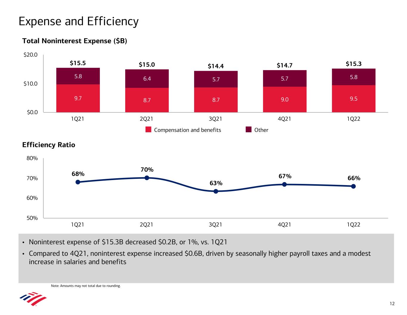 $15.5 $15.0 $14.4 $14.7 $15.3 9.7 8.7 8.7 9.0 9.5 5.8 6.4 5.7 5.7 5.8 Compensation and benefits Other 1Q21 2Q21 3Q21 4Q21 1Q22 $0.0 $10.0 $20.0 68% 70% 63% 67% 66% 1Q21 2Q21 3Q21 4Q21 1Q22 50% 60% 70% 80% • Noninterest expense of $15.3B decreased $0.2B, or 1%, vs. 1Q21 • Compared to 4Q21, noninterest expense increased $0.6B, driven by seasonally higher payroll taxes and a modest increase in salaries and benefits Total Noninterest Expense ($B) Efficiency Ratio Expense and Efficiency Note: Amounts may not total due to rounding. 12
