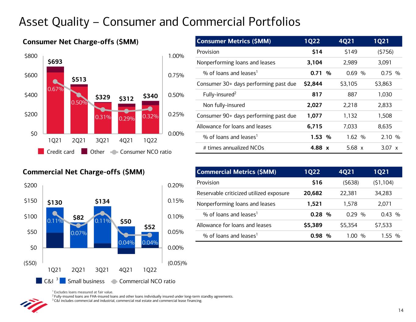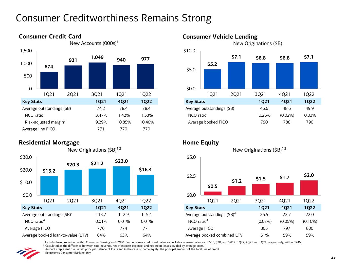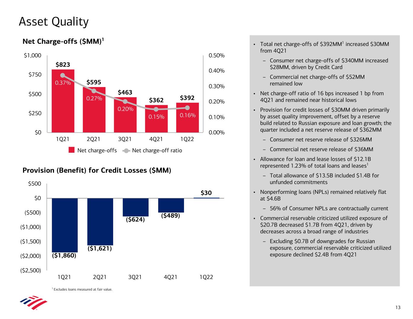 • Total net charge-offs of $392MM1 increased $30MM from 4Q21 – Consumer net charge-offs of $340MM increased $28MM, driven by Credit Card – Commercial net charge-offs of $52MM remained low • Net charge-off ratio of 16 bps increased 1 bp from 4Q21 and remained near historical lows • Provision for credit losses of $30MM driven primarily by asset quality improvement, offset by a reserve build related to Russian exposure and loan growth; the quarter included a net reserve release of $362MM – Consumer net reserve release of $326MM – Commercial net reserve release of $36MM • Allowance for loan and lease losses of $12.1B represented 1.23% of total loans and leases1 – Total allowance of $13.5B included $1.4B for unfunded commitments • Nonperforming loans (NPLs) remained relatively flat at $4.6B – 56% of Consumer NPLs are contractually current • Commercial reservable criticized utilized exposure of $20.7B decreased $1.7B from 4Q21, driven by decreases across a broad range of industries – Excluding $0.7B of downgrades for Russian exposure, commercial reservable criticized utilized exposure declined $2.4B from 4Q21 Asset Quality 1 Excludes loans measured at fair value. Provision (Benefit) for Credit Losses ($MM) Net Charge-offs ($MM)1 ($1,860) ($1,621) ($624) ($489) $30 1Q21 2Q21 3Q21 4Q21 1Q22 ($2,500) ($2,000) ($1,500) ($1,000) ($500) $0 $500 $823 $595 $463 $362 $392 0.37% 0.27% 0.20% 0.15% 0.16% Net charge-offs Net charge-off ratio 1Q21 2Q21 3Q21 4Q21 1Q22 $0 $250 $500 $750 $1,000 0.00% 0.10% 0.20% 0.30% 0.40% 0.50% 13