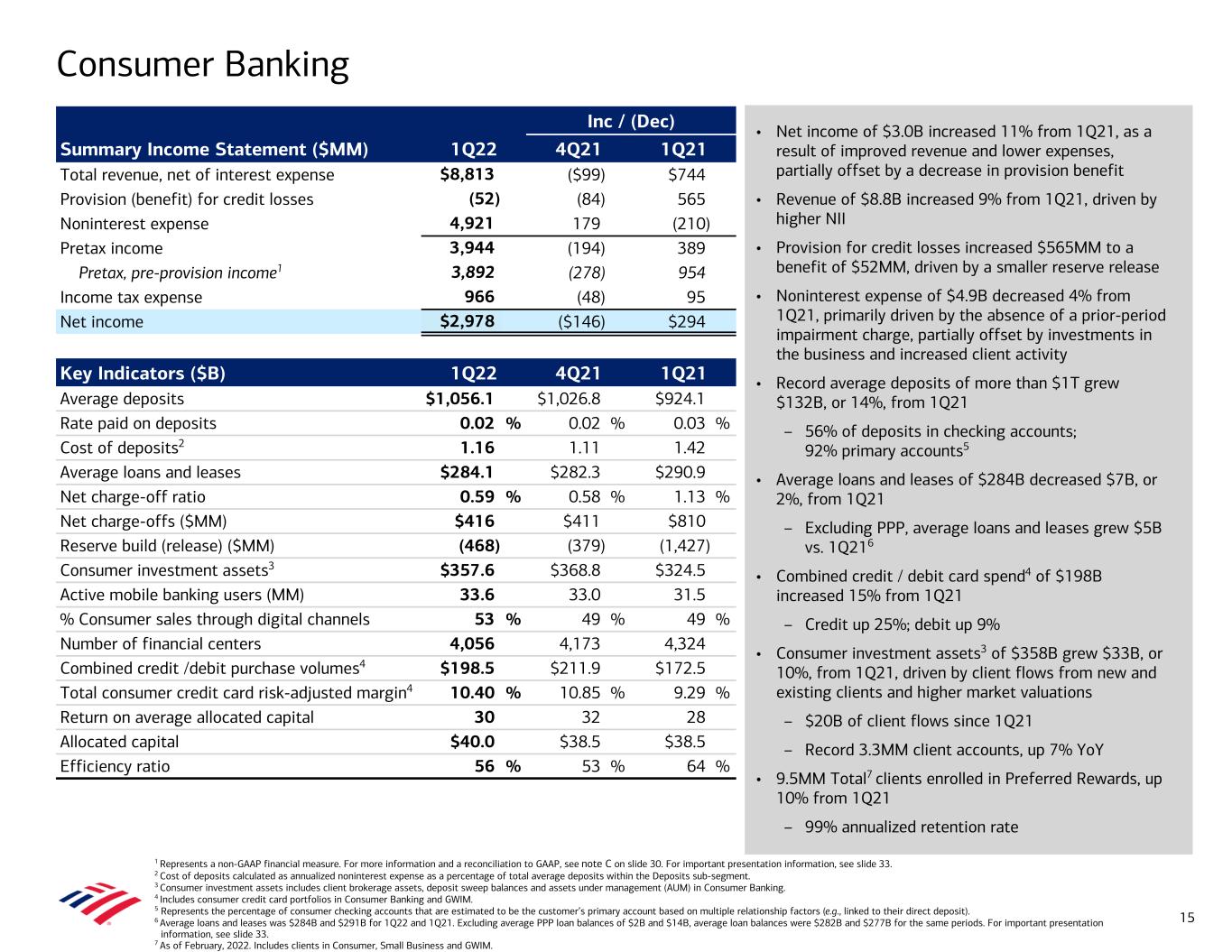 • Net income of $3.0B increased 11% from 1Q21, as a result of improved revenue and lower expenses, partially offset by a decrease in provision benefit • Revenue of $8.8B increased 9% from 1Q21, driven by higher NII • Provision for credit losses increased $565MM to a benefit of $52MM, driven by a smaller reserve release • Noninterest expense of $4.9B decreased 4% from 1Q21, primarily driven by the absence of a prior-period impairment charge, partially offset by investments in the business and increased client activity • Record average deposits of more than $1T grew $132B, or 14%, from 1Q21 – 56% of deposits in checking accounts; 92% primary accounts5 • Average loans and leases of $284B decreased $7B, or 2%, from 1Q21 – Excluding PPP, average loans and leases grew $5B vs. 1Q216 • Combined credit / debit card spend4 of $198B increased 15% from 1Q21 – Credit up 25%; debit up 9% • Consumer investment assets3 of $358B grew $33B, or 10%, from 1Q21, driven by client flows from new and existing clients and higher market valuations – $20B of client flows since 1Q21 – Record 3.3MM client accounts, up 7% YoY • 9.5MM Total7 clients enrolled in Preferred Rewards, up 10% from 1Q21 – 99% annualized retention rate Consumer Banking 1 Represents a non-GAAP financial measure. For more information and a reconciliation to GAAP, see note C on slide 30. For important presentation information, see slide 33. 2 Cost of deposits calculated as annualized noninterest expense as a percentage of total average deposits within the Deposits sub-segment. 3 Consumer investment assets includes client brokerage assets, deposit sweep balances and assets under management (AUM) in Consumer Banking. 4 Includes consumer credit card portfolios in Consumer Banking and GWIM. 5 Represents the percentage of consumer checking accounts that are estimated to be the customer’s primary account based on multiple relationship factors (e.g., linked to their direct deposit). 6 Average loans and leases was $284B and $291B for 1Q22 and 1Q21. Excluding average PPP loan balances of $2B and $14B, average loan balances were $282B and $277B for the same periods. For important presentation information, see slide 33. 7 As of February, 2022. Includes clients in Consumer, Small Business and GWIM. Inc / (Dec) Summary Income Statement ($MM) 1Q22 4Q21 1Q21 Total revenue, net of interest expense $8,813 ($99) $744 Provision (benefit) for credit losses (52) (84) 565 Noninterest expense 4,921 179 (210) Pretax income 3,944 (194) 389 Pretax, pre-provision income1 3,892 (278) 954 Income tax expense 966 (48) 95 Net income $2,978 ($146) $294 Key Indicators ($B) 1Q22 4Q21 1Q21 Average deposits $1,056.1 $1,026.8 $924.1 Rate paid on deposits 0.02 % 0.02 % 0.03 % Cost of deposits2 1.16 1.11 1.42 Average loans and leases $284.1 $282.3 $290.9 Net charge-off ratio 0.59 % 0.58 % 1.13 % Net charge-offs ($MM) $416 $411 $810 Reserve build (release) ($MM) (468) (379) (1,427) Consumer investment assets3 $357.6 $368.8 $324.5 Active mobile banking users (MM) 33.6 33.0 31.5 % Consumer sales through digital channels 53 % 49 % 49 % Number of financial centers 4,056 4,173 4,324 Combined credit /debit purchase volumes4 $198.5 $211.9 $172.5 Total consumer credit card risk-adjusted margin4 10.40 % 10.85 % 9.29 % Return on average allocated capital 30 32 28 Allocated capital $40.0 $38.5 $38.5 Efficiency ratio 56 % 53 % 64 % 15