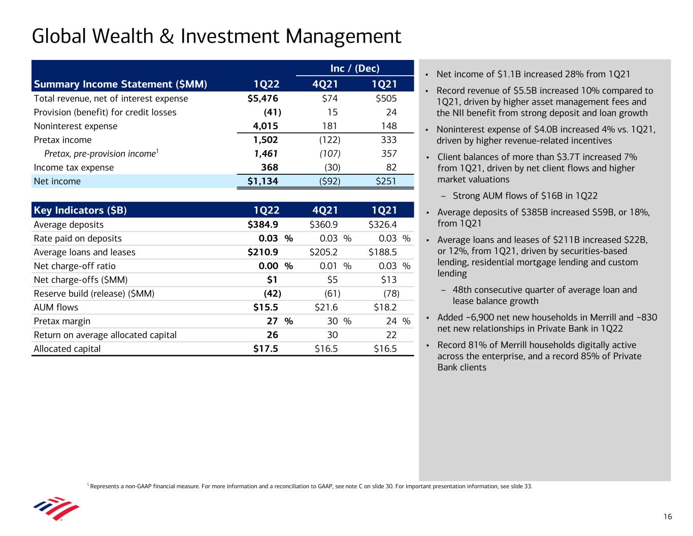 • Net income of $1.1B increased 28% from 1Q21 • Record revenue of $5.5B increased 10% compared to 1Q21, driven by higher asset management fees and the NII benefit from strong deposit and loan growth • Noninterest expense of $4.0B increased 4% vs. 1Q21, driven by higher revenue-related incentives • Client balances of more than $3.7T increased 7% from 1Q21, driven by net client flows and higher market valuations – Strong AUM flows of $16B in 1Q22 • Average deposits of $385B increased $59B, or 18%, from 1Q21 • Average loans and leases of $211B increased $22B, or 12%, from 1Q21, driven by securities-based lending, residential mortgage lending and custom lending – 48th consecutive quarter of average loan and lease balance growth • Added ~6,900 net new households in Merrill and ~830 net new relationships in Private Bank in 1Q22 • Record 81% of Merrill households digitally active across the enterprise, and a record 85% of Private Bank clients Global Wealth & Investment Management 1 Represents a non-GAAP financial measure. For more information and a reconciliation to GAAP, see note C on slide 30. For important presentation information, see slide 33. Inc / (Dec) Summary Income Statement ($MM) 1Q22 4Q21 1Q21 Total revenue, net of interest expense $5,476 $74 $505 Provision (benefit) for credit losses (41) 15 24 Noninterest expense 4,015 181 148 Pretax income 1,502 (122) 333 Pretax, pre-provision income1 1,461 (107) 357 Income tax expense 368 (30) 82 Net income $1,134 ($92) $251 Key Indicators ($B) 1Q22 4Q21 1Q21 Average deposits $384.9 $360.9 $326.4 Rate paid on deposits 0.03 % 0.03 % 0.03 % Average loans and leases $210.9 $205.2 $188.5 Net charge-off ratio 0.00 % 0.01 % 0.03 % Net charge-offs ($MM) $1 $5 $13 Reserve build (release) ($MM) (42) (61) (78) AUM flows $15.5 $21.6 $18.2 Pretax margin 27 % 30 % 24 % Return on average allocated capital 26 30 22 Allocated capital $17.5 $16.5 $16.5 16