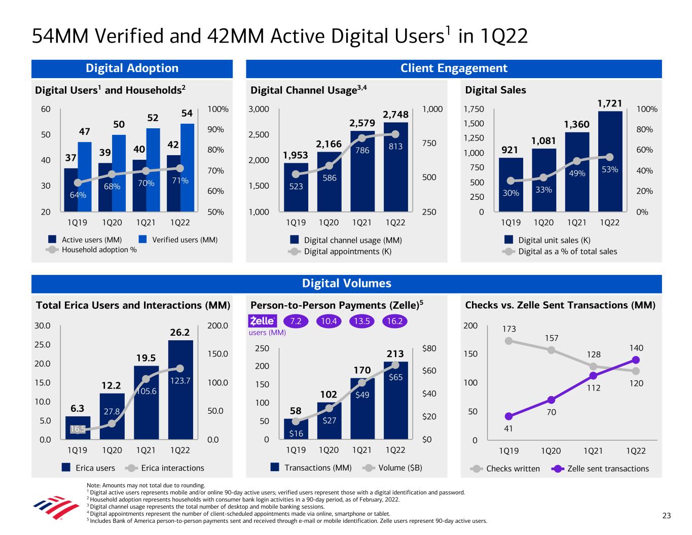 Checks vs. Zelle Sent Transactions (MM) 173 157 128 120 41 70 112 140 Checks written Zelle sent transactions 1Q19 1Q20 1Q21 1Q22 0 50 100 150 200 Digital SalesDigital Users1 and Households2 Digital Channel Usage3,4 921 1,081 1,360 1,721 30% 33% 49% 53% Digital unit sales (K) Digital as a % of total sales 1Q19 1Q20 1Q21 1Q22 0 250 500 750 1,000 1,250 1,500 1,750 0% 20% 40% 60% 80% 100% 1,953 2,166 2,579 2,748 523 586 786 813 Digital channel usage (MM) Digital appointments (K) 1Q19 1Q20 1Q21 1Q22 1,000 1,500 2,000 2,500 3,000 250 500 750 1,000 37 39 40 42 47 50 52 54 64% 68% 70% 71% Active users (MM) Verified users (MM) Household adoption % 1Q19 1Q20 1Q21 1Q22 20 30 40 50 60 50% 60% 70% 80% 90% 100% Client Engagement Person-to-Person Payments (Zelle)5 Digital Volumes 58 102 170 213 $16 $27 $49 $65 Transactions (MM) Volume ($B) 1Q19 1Q20 1Q21 1Q22 0 50 100 150 200 250 $0 $20 $40 $60 $80 54MM Verified and 42MM Active Digital Users1 in 1Q22 Note: Amounts may not total due to rounding. 1 Digital active users represents mobile and/or online 90-day active users; verified users represent those with a digital identification and password. 2 Household adoption represents households with consumer bank login activities in a 90-day period, as of February, 2022. 3 Digital channel usage represents the total number of desktop and mobile banking sessions. 4 Digital appointments represent the number of client-scheduled appointments made via online, smartphone or tablet. 5 Includes Bank of America person-to-person payments sent and received through e-mail or mobile identification. Zelle users represent 90-day active users. Total Erica Users and Interactions (MM) 6.3 12.2 19.5 26.2 27.8 105.6 123.7 Erica users Erica interactions 1Q19 1Q20 1Q21 1Q22 0.0 5.0 10.0 15.0 20.0 25.0 30.0 0.0 50.0 100.0 150.0 200.0 7.2 10.4 13.5 16.2 users (MM) 23 Digital Adoption 16.5