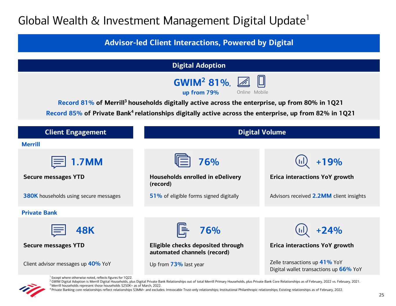 Average Deposits ($B) Global Wealth & Investment Management Trends Business Leadership1 • No. 1 on Forbes’ Top 100 Women Advisors (2022), Top Women Advisors Best-in State (2022), Best-in- State Wealth Advisors (2022) and Top Next Generation Advisors (2021) • No. 1 on Barron’s Top 100 Women Financial Advisors List (2021) • MMI/Barron’s Industry Awards for Digital Innovation – Digital Wealth Overview (2021) • Celent Model Wealth Manager award for Client Experience (2022) • No. 1 in personal trust AUM(I) • Best Private Bank for Customer Service (U.S.)(J) • Best Private Bank for Philanthropic Services (Global) and Most Innovative Private Bank (North America)(K) • Best Private Bank in North America(L) Note: Amounts may not total due to rounding. 1 See slide 31 for business leadership sources. 2 Average loans and leases includes PPP balances of $0.1B in 1Q22, $0.2B in 4Q21, $0.5B in 3Q21, $0.7B in 2Q21, and $0.7B in 1Q21. 3 End of period. Loans and leases includes margin receivables which are classified in customer and other receivables on the Consolidated Balance Sheet. 4 Managed deposits in investment accounts of $53B, $56B, $49B, $47B and $49B for 1Q22, 4Q21, 3Q21, 2Q21 and 1Q21, respectively, are included in both AUM and Deposits. Total client balances only include these balances once. Average Loans and Leases ($B)2 Total Revenue ($B) Client Balances ($B)3,4 $5.0 $5.1 $5.3 $5.4 $5.5 1.3 1.4 1.5 1.5 1.7 3.0 3.1 3.2 3.2 3.2 0.7 0.6 0.6 0.6 0.6 Net interest income Asset management fees Brokerage / Other 1Q21 2Q21 3Q21 4Q21 1Q22 $0.0 $2.0 $4.0 $6.0 1,467 1,549 1,579 1,639 1,572 1,535 1,619 1,612 1,655 1,593 333 331 346 390 385193 201 205 212 217 $3,480 $3,653 $3,693 $3,840 $3,714 AUM Brokerage / Other Deposits Loans and leases 1Q21 2Q21 3Q21 4Q21 1Q22 $0 $1,000 $2,000 $3,000 $4,000 $188 $194 $200 $205 $211 91 92 94 96 99 45 47 50 53 55 50 52 53 54 55 Consumer real estate Securities-based lending Custom lending Credit card 1Q21 2Q21 3Q21 4Q21 1Q22 $0 $50 $100 $150 $200 $250 $326 $333 $339 $361 $385 1Q21 2Q21 3Q21 4Q21 1Q22 $0 $100 $200 $300 $400 24
