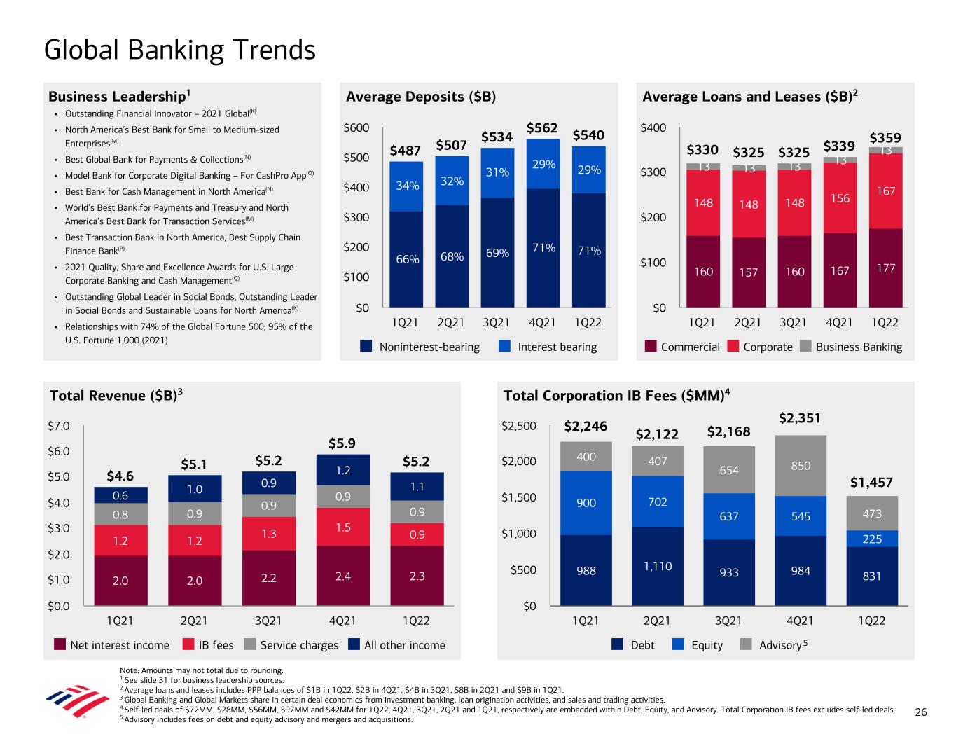 Global Banking Trends Note: Amounts may not total due to rounding. 1 See slide 31 for business leadership sources. 2 Average loans and leases includes PPP balances of $1B in 1Q22, $2B in 4Q21, $4B in 3Q21, $8B in 2Q21 and $9B in 1Q21. 3 Global Banking and Global Markets share in certain deal economics from investment banking, loan origination activities, and sales and trading activities. 4 Self-led deals of $72MM, $28MM, $56MM, $97MM and $42MM for 1Q22, 4Q21, 3Q21, 2Q21 and 1Q21, respectively are embedded within Debt, Equity, and Advisory. Total Corporation IB fees excludes self-led deals. 5 Advisory includes fees on debt and equity advisory and mergers and acquisitions. Average Deposits ($B)Business Leadership1 • Outstanding Financial Innovator – 2021 Global(K) • North America’s Best Bank for Small to Medium-sized Enterprises(M) • Best Global Bank for Payments & Collections(N) • Model Bank for Corporate Digital Banking – For CashPro App(O) • Best Bank for Cash Management in North America(N) • World’s Best Bank for Payments and Treasury and North America’s Best Bank for Transaction Services(M) • Best Transaction Bank in North America, Best Supply Chain Finance Bank(P) • 2021 Quality, Share and Excellence Awards for U.S. Large Corporate Banking and Cash Management(Q) • Outstanding Global Leader in Social Bonds, Outstanding Leader in Social Bonds and Sustainable Loans for North America(K) • Relationships with 74% of the Global Fortune 500; 95% of the U.S. Fortune 1,000 (2021) Average Loans and Leases ($B)2 Total Revenue ($B)3 Total Corporation IB Fees ($MM)4 $4.6 $5.1 $5.2 $5.9 $5.2 2.0 2.0 2.2 2.4 2.3 1.2 1.2 1.3 1.5 0.9 0.8 0.9 0.9 0.9 0.9 0.6 1.0 0.9 1.2 1.1 Net interest income IB fees Service charges All other income 1Q21 2Q21 3Q21 4Q21 1Q22 $0.0 $1.0 $2.0 $3.0 $4.0 $5.0 $6.0 $7.0 988 1,110 933 984 831 900 702 637 545 225 400 407 654 850 473 $2,246 $2,122 $2,168 $2,351 $1,457 Debt Equity Advisory 1Q21 2Q21 3Q21 4Q21 1Q22 $0 $500 $1,000 $1,500 $2,000 $2,500 160 157 160 167 177 148 148 148 156 167 13 13 13 13 13$330 $325 $325 $339 $359 Commercial Corporate Business Banking 1Q21 2Q21 3Q21 4Q21 1Q22 $0 $100 $200 $300 $400 5 $487 $507 $534 $562 $540 Noninterest-bearing Interest bearing 1Q21 2Q21 3Q21 4Q21 1Q22 $0 $100 $200 $300 $400 $500 $600 26 66% 68% 69% 71% 71% 34% 32% 31% 29% 29%