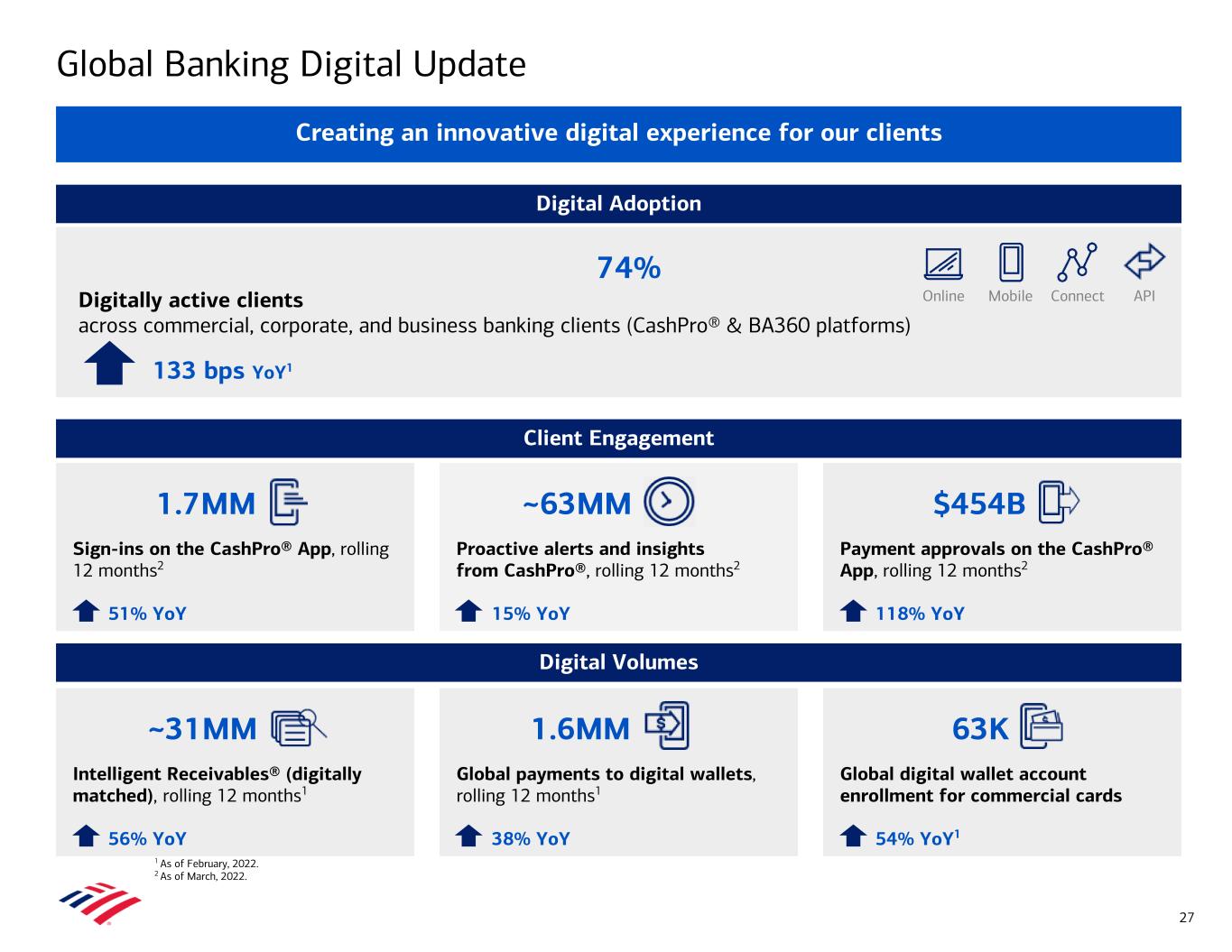 Global Banking Digital Update 74% Digitally active clients across commercial, corporate, and business banking clients (CashPro® & BA360 platforms) 133 bps YoY1 Digital Adoption 1.7MM Sign-ins on the CashPro® App, rolling 12 months2 51% YoY $454B Payment approvals on the CashPro® App, rolling 12 months2 118% YoY ~31MM Intelligent Receivables® (digitally matched), rolling 12 months1 56% YoY 63K Global digital wallet account enrollment for commercial cards 54% YoY1 ~63MM Proactive alerts and insights from CashPro®, rolling 12 months2 15% YoY 1.6MM Global payments to digital wallets, rolling 12 months1 38% YoY Client Engagement Online Mobile Connect API Digital Volumes 1 As of February, 2022. 2 As of March, 2022. Creating an innovative digital experience for our clients 27