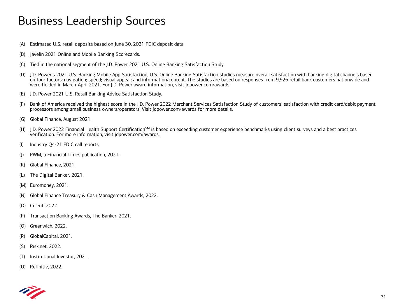 Business Leadership Sources (A) Estimated U.S. retail deposits based on June 30, 2021 FDIC deposit data. (B) Javelin 2021 Online and Mobile Banking Scorecards. (C) Tied in the national segment of the J.D. Power 2021 U.S. Online Banking Satisfaction Study. (D) J.D. Power’s 2021 U.S. Banking Mobile App Satisfaction, U.S. Online Banking Satisfaction studies measure overall satisfaction with banking digital channels based on four factors: navigation; speed; visual appeal; and information/content. The studies are based on responses from 9,926 retail bank customers nationwide and were fielded in March-April 2021. For J.D. Power award information, visit jdpower.com/awards. (E) J.D. Power 2021 U.S. Retail Banking Advice Satisfaction Study. (F) Bank of America received the highest score in the J.D. Power 2022 Merchant Services Satisfaction Study of customers’ satisfaction with credit card/debit payment processors among small business owners/operators. Visit jdpower.com/awards for more details. (G) Global Finance, August 2021. (H) J.D. Power 2022 Financial Health Support CertificationSM is based on exceeding customer experience benchmarks using client surveys and a best practices verification. For more information, visit jdpower.com/awards. (I) Industry Q4-21 FDIC call reports. (J) PWM, a Financial Times publication, 2021. (K) Global Finance, 2021. (L) The Digital Banker, 2021. (M) Euromoney, 2021. (N) Global Finance Treasury & Cash Management Awards, 2022. (O) Celent, 2022 (P) Transaction Banking Awards, The Banker, 2021. (Q) Greenwich, 2022. (R) GlobalCapital, 2021. (S) Risk.net, 2022. (T) Institutional Investor, 2021. (U) Refinitiv, 2022. 31