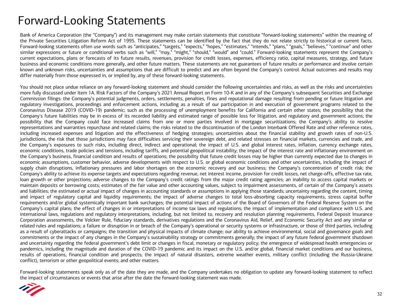Forward-Looking Statements Bank of America Corporation (the “Company”) and its management may make certain statements that constitute “forward-looking statements” within the meaning of the Private Securities Litigation Reform Act of 1995. These statements can be identified by the fact that they do not relate strictly to historical or current facts. Forward-looking statements often use words such as “anticipates,” “targets,” “expects,” “hopes,” “estimates,” “intends,” “plans,” “goals,” “believes,” “continue” and other similar expressions or future or conditional verbs such as “will,” “may,” “might,” “should,” “would” and “could.” Forward-looking statements represent the Company’s current expectations, plans or forecasts of its future results, revenues, provision for credit losses, expenses, efficiency ratio, capital measures, strategy, and future business and economic conditions more generally, and other future matters. These statements are not guarantees of future results or performance and involve certain known and unknown risks, uncertainties and assumptions that are difficult to predict and are often beyond the Company’s control. Actual outcomes and results may differ materially from those expressed in, or implied by, any of these forward-looking statements. You should not place undue reliance on any forward-looking statement and should consider the following uncertainties and risks, as well as the risks and uncertainties more fully discussed under Item 1A. Risk Factors of the Company’s 2021 Annual Report on Form 10-K and in any of the Company’s subsequent Securities and Exchange Commission filings: the Company’s potential judgments, orders, settlements, penalties, fines and reputational damage resulting from pending or future litigation and regulatory investigations, proceedings and enforcement actions, including as a result of our participation in and execution of government programs related to the Coronavirus Disease 2019 (COVID-19) pandemic; such as the processing of unemployment benefits for California and certain other states; the possibility that the Company's future liabilities may be in excess of its recorded liability and estimated range of possible loss for litigation, and regulatory and government actions; the possibility that the Company could face increased claims from one or more parties involved in mortgage securitizations; the Company’s ability to resolve representations and warranties repurchase and related claims; the risks related to the discontinuation of the London Interbank Offered Rate and other reference rates, including increased expenses and litigation and the effectiveness of hedging strategies; uncertainties about the financial stability and growth rates of non-U.S. jurisdictions, the risk that those jurisdictions may face difficulties servicing their sovereign debt, and related stresses on financial markets, currencies and trade, and the Company’s exposures to such risks, including direct, indirect and operational; the impact of U.S. and global interest rates, inflation, currency exchange rates, economic conditions, trade policies and tensions, including tariffs, and potential geopolitical instability; the impact of the interest rate and inflationary environment on the Company’s business, financial condition and results of operations; the possibility that future credit losses may be higher than currently expected due to changes in economic assumptions, customer behavior, adverse developments with respect to U.S. or global economic conditions and other uncertainties, including the impact of supply chain disruptions, inflationary pressures and labor shortages on the economic recovery and our business; the Company’s concentration of credit risk; the Company's ability to achieve its expense targets and expectations regarding revenue, net interest income, provision for credit losses, net charge-offs, effective tax rate, loan growth or other projections; adverse changes to the Company’s credit ratings from the major credit rating agencies; an inability to access capital markets or maintain deposits or borrowing costs; estimates of the fair value and other accounting values, subject to impairment assessments, of certain of the Company’s assets and liabilities; the estimated or actual impact of changes in accounting standards or assumptions in applying those standards; uncertainty regarding the content, timing and impact of regulatory capital and liquidity requirements; the impact of adverse changes to total loss-absorbing capacity requirements, stress capital buffer requirements and/or global systemically important bank surcharges; the potential impact of actions of the Board of Governors of the Federal Reserve System on the Company’s capital plans; the effect of changes in or interpretations of income tax laws and regulations; the impact of implementation and compliance with U.S. and international laws, regulations and regulatory interpretations, including, but not limited to, recovery and resolution planning requirements, Federal Deposit Insurance Corporation assessments, the Volcker Rule, fiduciary standards, derivatives regulations and the Coronavirus Aid, Relief, and Economic Security Act and any similar or related rules and regulations; a failure or disruption in or breach of the Company’s operational or security systems or infrastructure, or those of third parties, including as a result of cyberattacks or campaigns; the transition and physical impacts of climate change; our ability to achieve environmental, social and governance goals and commitments or the impact of any changes in the Company's sustainability strategy or commitments generally; the impact of any future federal government shutdown and uncertainty regarding the federal government’s debt limit or changes in fiscal, monetary or regulatory policy; the emergence of widespread health emergencies o
