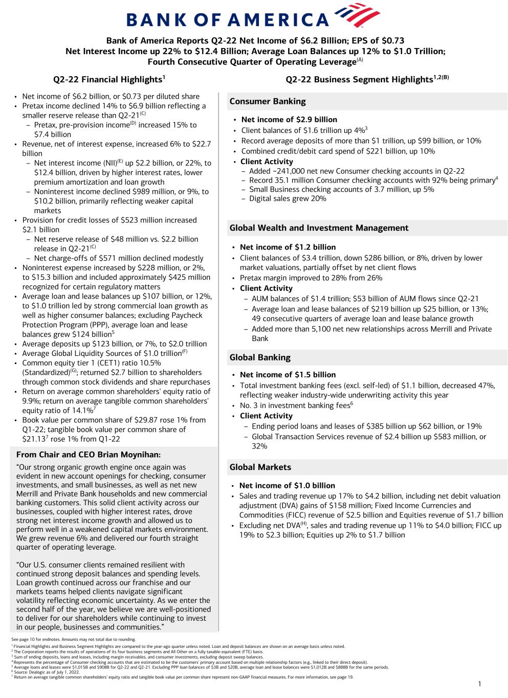 1 Q2-22 Financial Highlights1 Q2-22 Business Segment Highlights1,2(B) Consumer Banking Global Wealth and Investment Management Global Banking Global Markets Bank of America Reports Q2-22 Net Income of $6.2 Billion; EPS of $0.73 Net Interest Income up 22% to $12.4 Billion; Average Loan Balances up 12% to $1.0 Trillion; Fourth Consecutive Quarter of Operating Leverage(A) See page 10 for endnotes. Amounts may not total due to rounding. 1 Financial Highlights and Business Segment Highlights are compared to the year-ago quarter unless noted. Loan and deposit balances are shown on an average basis unless noted. 2 The Corporation reports the results of operations of its four business segments and All Other on a fully taxable-equivalent (FTE) basis. 3 Sum of ending deposits, loans and leases, including margin receivables, and consumer investments, excluding deposit sweep balances. 4 Represents the percentage of Consumer checking accounts that are estimated to be the customers' primary account based on multiple relationship factors (e.g., linked to their direct deposit). 5 Average loans and leases were $1,015B and $908B for Q2-22 and Q2-21. Excluding PPP loan balances of $3B and $20B, average loan and lease balances were $1,012B and $888B for the same periods. 6 Source: Dealogic as of July 1, 2022. 7 Return on average tangible common shareholders’ equity ratio and tangible book value per common share represent non-GAAP financial measures. For more information, see page 19. • Net income of $6.2 billion, or $0.73 per diluted share • Pretax income declined 14% to $6.9 billion reflecting a smaller reserve release than Q2-21(C) – Pretax, pre-provision income(D) increased 15% to $7.4 billion • Revenue, net of interest expense, increased 6% to $22.7 billion – Net interest income (NII)(E) up $2.2 billion, or 22%, to $12.4 billion, driven by higher interest rates, lower premium amortization and loan growth – Noninterest income declined $989 million, or 9%, to $10.2 billion, primarily reflecting weaker capital markets • Provision for credit losses of $523 million increased $2.1 billion – Net reserve release of $48 million vs. $2.2 billion release in Q2-21(C) – Net charge-offs of $571 million declined modestly • Noninterest expense increased by $228 million, or 2%, to $15.3 billion and included approximately $425 million recognized for certain regulatory matters • Average loan and lease balances up $107 billion, or 12%, to $1.0 trillion led by strong commercial loan growth as well as higher consumer balances; excluding Paycheck Protection Program (PPP), average loan and lease balances grew $124 billion5 • Average deposits up $123 billion, or 7%, to $2.0 trillion • Average Global Liquidity Sources of $1.0 trillion(F) • Common equity tier 1 (CET1) ratio 10.5% (Standardized)(G); returned $2.7 billion to shareholders through common stock dividends and share repurchases • Return on average common shareholders' equity ratio of 9.9%; return on average tangible common shareholders' equity ratio of 14.1%7 • Book value per common share of $29.87 rose 1% from Q1-22; tangible book value per common share of $21.137 rose 1% from Q1-22 • Net income of $1.0 billion • Sales and trading revenue up 17% to $4.2 billion, including net debit valuation adjustment (DVA) gains of $158 million; Fixed Income Currencies and Commodities (FICC) revenue of $2.5 billion and Equities revenue of $1.7 billion • Excluding net DVA(H), sales and trading revenue up 11% to $4.0 billion; FICC up 19% to $2.3 billion; Equities up 2% to $1.7 billion From Chair and CEO Brian Moynihan: “Our strong organic growth engine once again was evident in new account openings for checking, consumer investments, and small businesses, as well as net new Merrill and Private Bank households and new commercial banking customers. This solid client activity across our businesses, coupled with higher interest rates, drove strong net interest income growth and allowed us to perform well in a weakened capital markets environment. We grew revenue 6% and delivered our fourth straight quarter of operating leverage. “Our U.S. consumer clients remained resilient with continued strong deposit balances and spending levels. Loan growth continued across our franchise and our markets teams helped clients navigate significant volatility reflecting economic uncertainty. As we enter the second half of the year, we believe we are well-positioned to deliver for our shareholders while continuing to invest in our people, businesses and communities.” • Net income of $1.2 billion • Client balances of $3.4 trillion, down $286 billion, or 8%, driven by lower market valuations, partially offset by net client flows • Pretax margin improved to 28% from 26% • Client Activity – AUM balances of $1.4 trillion; $53 billion of AUM flows since Q2-21 – Average loan and lease balances of $219 billion up $25 billion, or 13%; 49 consecutive quarters of average loan and lease balance growth – Added more than 5,100 net new relationships across Merrill and Private Bank • Net income of $1.5 billion • Total investment banking fees (excl. self-led) of $1.1 billion, decreased 47%, reflecting weaker industry-wide underwriting activity this year • No. 3 in investment banking fees6 • Client Activity – Ending period loans and leases of $385 billion up $62 billion, or 19% – Global Transaction Services revenue of $2.4 billion up $583 million, or 32% • Net income of $2.9 billion • Client balances of $1.6 trillion up 4%3 • Record average deposits of more than $1 trillion, up $99 billion, or 10% • Combined credit/debit card spend of $221 billion, up 10% • Client Activity – Added ~241,000 net new Consumer checking accounts in Q2-22 – Record 35.1 million Consumer checking accounts with 92% being primary4 – Small Business checking accounts of 3.7 million, up 5% – Digital sales grew 20%