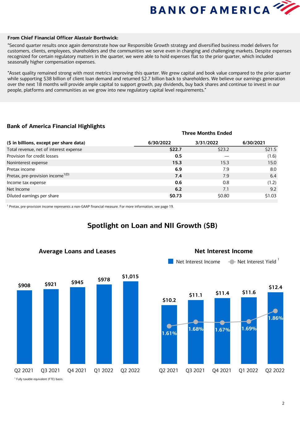 2 Bank of America Financial Highlights Three Months Ended ($ in billions, except per share data) 6/30/2022 3/31/2022 6/30/2021 Total revenue, net of interest expense $22.7 $23.2 $21.5 Provision for credit losses 0.5 — (1.6) Noninterest expense 15.3 15.3 15.0 Pretax income 6.9 7.9 8.0 Pretax, pre-provision income1(D) 7.4 7.9 6.4 Income tax expense 0.6 0.8 (1.2) Net Income 6.2 7.1 9.2 Diluted earnings per share $0.73 $0.80 $1.03 1 Pretax, pre-provision income represents a non-GAAP financial measure. For more information, see page 19. From Chief Financial Officer Alastair Borthwick: “Second quarter results once again demonstrate how our Responsible Growth strategy and diversified business model delivers for customers, clients, employees, shareholders and the communities we serve even in changing and challenging markets. Despite expenses recognized for certain regulatory matters in the quarter, we were able to hold expenses flat to the prior quarter, which included seasonally higher compensation expenses. “Asset quality remained strong with most metrics improving this quarter. We grew capital and book value compared to the prior quarter while supporting $38 billion of client loan demand and returned $2.7 billion back to shareholders. We believe our earnings generation over the next 18 months will provide ample capital to support growth, pay dividends, buy back shares and continue to invest in our people, platforms and communities as we grow into new regulatory capital level requirements.” Net Interest Income $10.2 $11.1 $11.4 $11.6 $12.4 1.61% 1.68% 1.67% 1.69% 1.86% Net Interest Income Net Interest Yield Q2 2021 Q3 2021 Q4 2021 Q1 2022 Q2 2022 Average Loans and Leases $908 $921 $945 $978 $1,015 Q2 2021 Q3 2021 Q4 2021 Q1 2022 Q2 2022 Spotlight on Loan and NII Growth ($B) 1 1 Fully taxable equivalent (FTE) basis.