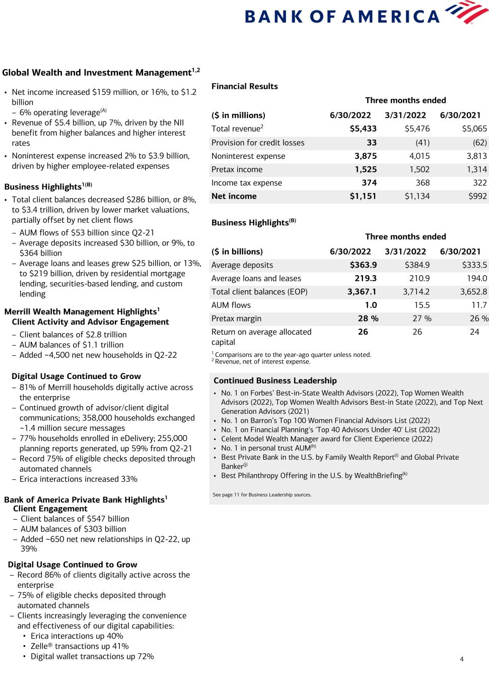 3 Consumer Banking1,2 Financial Results Three months ended ($ in millions) 6/30/2022 3/31/2022 6/30/2021 Total revenue2 $9,136 $8,813 $8,186 Provision for credit losses 350 (52) (697) Noninterest expense 4,959 4,921 4,859 Pretax income 3,827 3,944 4,024 Income tax expense 938 966 986 Net income $2,889 $2,978 $3,038 Business Highlights3(B) Three months ended ($ in billions) 6/30/2022 3/31/2022 6/30/2021 Average deposits $1,078.0 $1,056.1 $979.1 Average loans and leases 289.6 284.1 281.8 Consumer investment assets (EOP)6 315.2 357.6 345.8 Active mobile banking users (MM) 34.2 33.6 31.8 Number of financial centers 3,984 4,056 4,296 Efficiency ratio 54 % 56 % 59 % Return on average allocated capital 29 30 32 Total Consumer Credit Card3 Average credit card outstanding balances $81.0 $78.4 $73.4 Total credit/debit spend 220.5 198.5 200.3 Risk-adjusted margin 9.9 % 10.4 % 9.8 % 1 Comparisons are to the year-ago quarter unless noted. 2 Revenue, net of interest expense. 3 The Consumer credit card portfolio includes Consumer Banking and GWIM. 4 Represents the percentage of consumer checking accounts that are estimated to be the customer’s primary account based on multiple relationship factors (e.g., linked to their direct deposit). 5 Average loans and leases were $290B and $282B for Q2-22 and Q2-21. Excluding average PPP loan balances of $2B and $11B, average loan balances were $288B and $270B for the same periods. 6 Consumer investment assets includes client brokerage assets, deposit sweep balances and AUM in Consumer Banking. 7 Includes clients in Consumer, Small Business and GWIM. As of May 2022. 8 Household adoption represents households with consumer bank login activities in a 90-day period, as of May 2022. • Net income of $2.9 billion decreased 5% from Q2-21 as NII improvement was more than offset by increased provision expense due to a reserve release that benefited Q2-21(C) – 10% operating leverage(A) • Revenue of $9.1 billion increased 12%, from increased NII driven by higher balances and higher interest rates, partially offset by the impact of non- sufficient funds and overdraft policy changes • Provision for credit losses was $350 million primarily driven by loan growth and a dampening macroeconomic outlook, and increased $1.0 billion from Q2-21, which benefited from a reserve release(C) • Noninterest expense increased 2% to $5.0 billion, primarily driven by investments in the business Business Highlights1,3(B) • Record average deposits grew $99 billion, or 10%, to more than $1 trillion – 56% of deposits in checking accounts; 92% primary accounts4 • Average loans and leases increased $8 billion, or 3%, to $290 billion; average loans and leases, excluding PPP, grew $18 billion to $288 billion5 • Consumer investment assets6 declined $31 billion, or 9%, to $315 billion, driven by lower market valuations, partially offset by strong client flows from new and existing clients – $21 billion of client flows since Q2-21 – Record 3.4 million client accounts, up 6% • Combined credit/debit card spend up $20 billion, or 10%; credit card up 17% and debit card up 6%, to a record • 9.8 million total clients7 enrolled in Preferred Rewards, up 10%, with 99% annualized retention rate Digital Usage Continued to Grow1 • Record 72% of overall households8 actively using digital platforms • Record 42.7 million active digital banking users, up 5% or ~2.2 million • Over 1.6 million digital sales, up 20% • Record 2.8 billion digital logins • 17.0 million active Zelle® users, now including small businesses, sent and received 239 million transfers worth $73 billion, up 26% and 29% YoY, respectively • Clients booked ~911,000 digital appointments Continued Business Leadership • No. 1 in estimated U.S. Retail Deposits(a) • No. 1 Online Banking and Mobile Banking Functionality(b) • No. 1 in customer satisfaction with Merchant Services by J.D. Power(c) • No. 1 Small Business Lender(d) • Best Bank in the U.S.(e) • Best Consumer Digital Bank in the U.S.(f) • Certified by J.D. Power for providing outstanding client satisfaction for financial wellness support(g) See page 11 for Business Leadership sources.