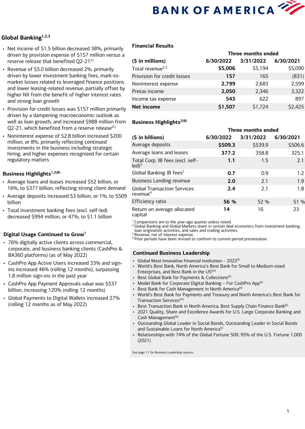 4 Global Wealth and Investment Management1,2 Financial Results Three months ended ($ in millions) 6/30/2022 3/31/2022 6/30/2021 Total revenue2 $5,433 $5,476 $5,065 Provision for credit losses 33 (41) (62) Noninterest expense 3,875 4,015 3,813 Pretax income 1,525 1,502 1,314 Income tax expense 374 368 322 Net income $1,151 $1,134 $992 Business Highlights(B) Three months ended ($ in billions) 6/30/2022 3/31/2022 6/30/2021 Average deposits $363.9 $384.9 $333.5 Average loans and leases 219.3 210.9 194.0 Total client balances (EOP) 3,367.1 3,714.2 3,652.8 AUM flows 1.0 15.5 11.7 Pretax margin 28 % 27 % 26 % Return on average allocated capital 26 26 24 1 Comparisons are to the year-ago quarter unless noted. 2 Revenue, net of interest expense. Continued Business Leadership • No. 1 on Forbes’ Best-in-State Wealth Advisors (2022), Top Women Wealth Advisors (2022), Top Women Wealth Advisors Best-in State (2022), and Top Next Generation Advisors (2021) • No. 1 on Barron’s Top 100 Women Financial Advisors List (2022) • No. 1 on Financial Planning's 'Top 40 Advisors Under 40' List (2022) • Celent Model Wealth Manager award for Client Experience (2022) • No. 1 in personal trust AUM(h) • Best Private Bank in the U.S. by Family Wealth Report(i) and Global Private Banker(j) • Best Philanthropy Offering in the U.S. by WealthBriefing(k) See page 11 for Business Leadership sources. • Net income increased $159 million, or 16%, to $1.2 billion – 6% operating leverage(A) • Revenue of $5.4 billion, up 7%, driven by the NII benefit from higher balances and higher interest rates • Noninterest expense increased 2% to $3.9 billion, driven by higher employee-related expenses Business Highlights1(B) • Total client balances decreased $286 billion, or 8%, to $3.4 trillion, driven by lower market valuations, partially offset by net client flows – AUM flows of $53 billion since Q2-21 – Average deposits increased $30 billion, or 9%, to $364 billion – Average loans and leases grew $25 billion, or 13%, to $219 billion, driven by residential mortgage lending, securities-based lending, and custom lending Merrill Wealth Management Highlights1 Client Activity and Advisor Engagement – Client balances of $2.8 trillion – AUM balances of $1.1 trillion – Added ~4,500 net new households in Q2-22 Digital Usage Continued to Grow – 81% of Merrill households digitally active across the enterprise – Continued growth of advisor/client digital communications; 358,000 households exchanged ~1.4 million secure messages – 77% households enrolled in eDelivery; 255,000 planning reports generated, up 59% from Q2-21 – Record 75% of eligible checks deposited through automated channels – Erica interactions increased 33% Client Engagement – Client balances of $547 billion – AUM balances of $303 billion – Added ~650 net new relationships in Q2-22, up 39% Bank of America Private Bank Highlights1 Digital Usage Continued to Grow – Record 86% of clients digitally active across the enterprise – 75% of eligible checks deposited through automated channels – Clients increasingly leveraging the convenience and effectiveness of our digital capabilities: ▪ Erica interactions up 40% ▪ Zelle® transactions up 41% ▪ Digital wallet transactions up 72%