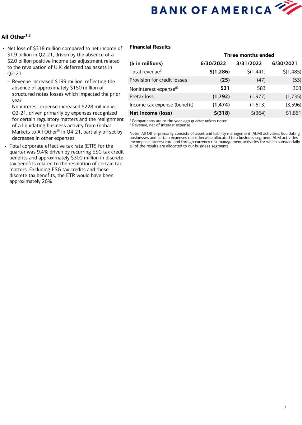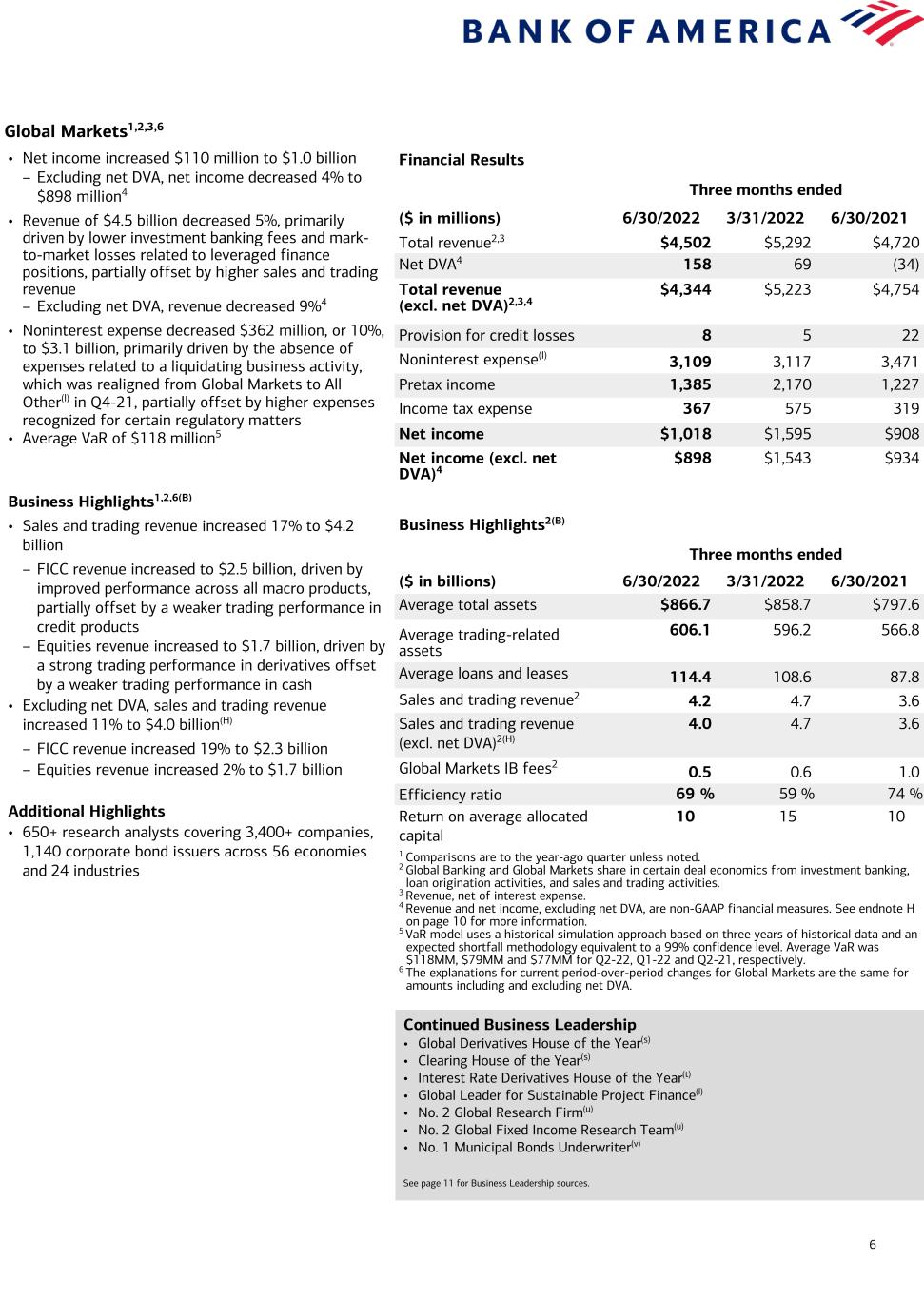 6 Global Markets1,2,3,6 Financial Results Three months ended ($ in millions) 6/30/2022 3/31/2022 6/30/2021 Total revenue2,3 $4,502 $5,292 $4,720 Net DVA4 158 69 (34) Total revenue (excl. net DVA)2,3,4 $4,344 $5,223 $4,754 Provision for credit losses 8 5 22 Noninterest expense(I) 3,109 3,117 3,471 Pretax income 1,385 2,170 1,227 Income tax expense 367 575 319 Net income $1,018 $1,595 $908 Net income (excl. net DVA)4 $898 $1,543 $934 Business Highlights2(B) Three months ended ($ in billions) 6/30/2022 3/31/2022 6/30/2021 Average total assets $866.7 $858.7 $797.6 Average trading-related assets 606.1 596.2 566.8 Average loans and leases 114.4 108.6 87.8 Sales and trading revenue2 4.2 4.7 3.6 Sales and trading revenue (excl. net DVA)2(H) 4.0 4.7 3.6 Global Markets IB fees2 0.5 0.6 1.0 Efficiency ratio 69 % 59 % 74 % Return on average allocated capital 10 15 10 1 Comparisons are to the year-ago quarter unless noted. 2 Global Banking and Global Markets share in certain deal economics from investment banking, loan origination activities, and sales and trading activities. 3 Revenue, net of interest expense. 4 Revenue and net income, excluding net DVA, are non-GAAP financial measures. See endnote H on page 10 for more information. 5 VaR model uses a historical simulation approach based on three years of historical data and an expected shortfall methodology equivalent to a 99% confidence level. Average VaR was $118MM, $79MM and $77MM for Q2-22, Q1-22 and Q2-21, respectively. 6 The explanations for current period-over-period changes for Global Markets are the same for amounts including and excluding net DVA. • Net income increased $110 million to $1.0 billion – Excluding net DVA, net income decreased 4% to $898 million4 • Revenue of $4.5 billion decreased 5%, primarily driven by lower investment banking fees and mark- to-market losses related to leveraged finance positions, partially offset by higher sales and trading revenue – Excluding net DVA, revenue decreased 9%4 • Noninterest expense decreased $362 million, or 10%, to $3.1 billion, primarily driven by the absence of expenses related to a liquidating business activity, which was realigned from Global Markets to All Other(l) in Q4-21, partially offset by higher expenses recognized for certain regulatory matters • Average VaR of $118 million5 Business Highlights1,2,6(B) • Sales and trading revenue increased 17% to $4.2 billion – FICC revenue increased to $2.5 billion, driven by improved performance across all macro products, partially offset by a weaker trading performance in credit products – Equities revenue increased to $1.7 billion, driven by a strong trading performance in derivatives offset by a weaker trading performance in cash • Excluding net DVA, sales and trading revenue increased 11% to $4.0 billion(H) – FICC revenue increased 19% to $2.3 billion – Equities revenue increased 2% to $1.7 billion Additional Highlights • 650+ research analysts covering 3,400+ companies, 1,140 corporate bond issuers across 56 economies and 24 industries Continued Business Leadership • Global Derivatives House of the Year(s) • Clearing House of the Year(s) • Interest Rate Derivatives House of the Year(t) • Global Leader for Sustainable Project Finance(l) • No. 2 Global Research Firm(u) • No. 2 Global Fixed Income Research Team(u) • No. 1 Municipal Bonds Underwriter(v) See page 11 for Business Leadership sources.