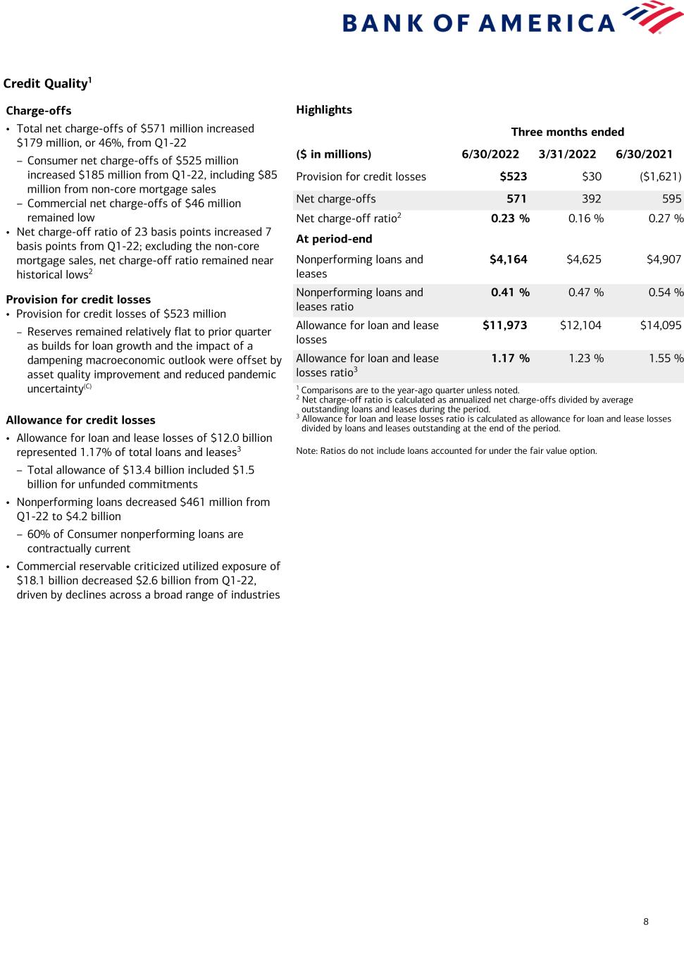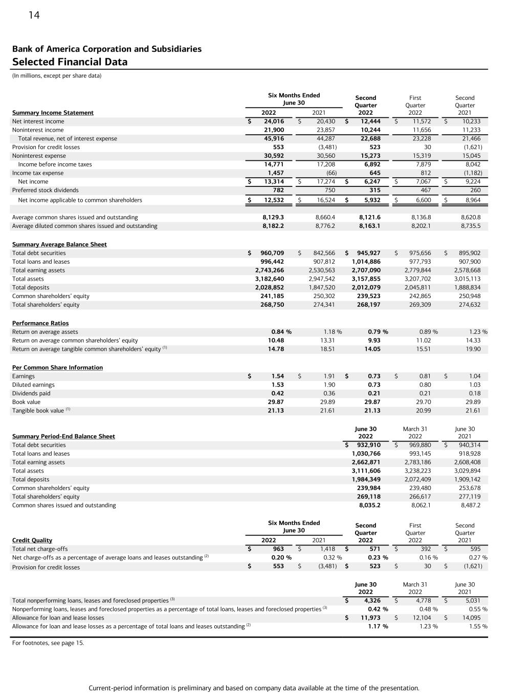 Current-period information is preliminary and based on company data available at the time of the presentation. 14 Bank of America Corporation and Subsidiaries Selected Financial Data (In millions, except per share data) Six Months Ended June 30 Second Quarter 2022 First Quarter 2022 Second Quarter 2021Summary Income Statement 2022 2021 Net interest income $ 24,016 $ 20,430 $ 12,444 $ 11,572 $ 10,233 Noninterest income 21,900 23,857 10,244 11,656 11,233 Total revenue, net of interest expense 45,916 44,287 22,688 23,228 21,466 Provision for credit losses 553 (3,481) 523 30 (1,621) Noninterest expense 30,592 30,560 15,273 15,319 15,045 Income before income taxes 14,771 17,208 6,892 7,879 8,042 Income tax expense 1,457 (66) 645 812 (1,182) Net income $ 13,314 $ 17,274 $ 6,247 $ 7,067 $ 9,224 Preferred stock dividends 782 750 315 467 260 Net income applicable to common shareholders $ 12,532 $ 16,524 $ 5,932 $ 6,600 $ 8,964 Average common shares issued and outstanding 8,129.3 8,660.4 8,121.6 8,136.8 8,620.8 Average diluted common shares issued and outstanding 8,182.2 8,776.2 8,163.1 8,202.1 8,735.5 Summary Average Balance Sheet Total debt securities $ 960,709 $ 842,566 $ 945,927 $ 975,656 $ 895,902 Total loans and leases 996,442 907,812 1,014,886 977,793 907,900 Total earning assets 2,743,266 2,530,563 2,707,090 2,779,844 2,578,668 Total assets 3,182,640 2,947,542 3,157,855 3,207,702 3,015,113 Total deposits 2,028,852 1,847,520 2,012,079 2,045,811 1,888,834 Common shareholders’ equity 241,185 250,302 239,523 242,865 250,948 Total shareholders’ equity 268,750 274,341 268,197 269,309 274,632 Performance Ratios Return on average assets 0.84 % 1.18 % 0.79 % 0.89 % 1.23 % Return on average common shareholders’ equity 10.48 13.31 9.93 11.02 14.33 Return on average tangible common shareholders’ equity (1) 14.78 18.51 14.05 15.51 19.90 Per Common Share Information Earnings $ 1.54 $ 1.91 $ 0.73 $ 0.81 $ 1.04 Diluted earnings 1.53 1.90 0.73 0.80 1.03 Dividends paid 0.42 0.36 0.21 0.21 0.18 Book value 29.87 29.89 29.87 29.70 29.89 Tangible book value (1) 21.13 21.61 21.13 20.99 21.61 Summary Period-End Balance Sheet June 30 2022 March 31 2022 June 30 2021 Total debt securities $ 932,910 $ 969,880 $ 940,314 Total loans and leases 1,030,766 993,145 918,928 Total earning assets 2,662,871 2,783,186 2,608,408 Total assets 3,111,606 3,238,223 3,029,894 Total deposits 1,984,349 2,072,409 1,909,142 Common shareholders’ equity 239,984 239,480 253,678 Total shareholders’ equity 269,118 266,617 277,119 Common shares issued and outstanding 8,035.2 8,062.1 8,487.2 Six Months Ended June 30 Second Quarter 2022 First Quarter 2022 Second Quarter 2021Credit Quality 2022 2021 Total net charge-offs $ 963 $ 1,418 $ 571 $ 392 $ 595 Net charge-offs as a percentage of average loans and leases outstanding (2) 0.20 % 0.32 % 0.23 % 0.16 % 0.27 % Provision for credit losses $ 553 $ (3,481) $ 523 $ 30 $ (1,621) June 30 2022 March 31 2022 June 30 2021 Total nonperforming loans, leases and foreclosed properties (3) $ 4,326 $ 4,778 $ 5,031 Nonperforming loans, leases and foreclosed properties as a percentage of total loans, leases and foreclosed properties (3) 0.42 % 0.48 % 0.55 % Allowance for loan and lease losses $ 11,973 $ 12,104 $ 14,095 Allowance for loan and lease losses as a percentage of total loans and leases outstanding (2) 1.17 % 1.23 % 1.55 % For footnotes, see page 15.