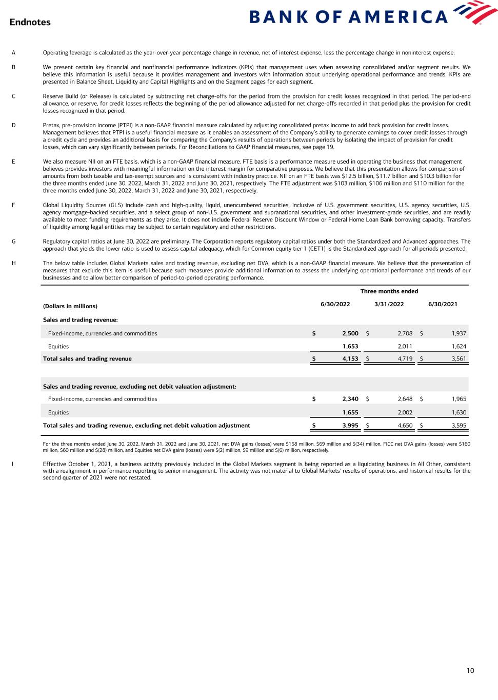 10 A Operating leverage is calculated as the year-over-year percentage change in revenue, net of interest expense, less the percentage change in noninterest expense. B We present certain key financial and nonfinancial performance indicators (KPIs) that management uses when assessing consolidated and/or segment results. We believe this information is useful because it provides management and investors with information about underlying operational performance and trends. KPIs are presented in Balance Sheet, Liquidity and Capital Highlights and on the Segment pages for each segment. C Reserve Build (or Release) is calculated by subtracting net charge-offs for the period from the provision for credit losses recognized in that period. The period-end allowance, or reserve, for credit losses reflects the beginning of the period allowance adjusted for net charge-offs recorded in that period plus the provision for credit losses recognized in that period. D Pretax, pre-provision income (PTPI) is a non-GAAP financial measure calculated by adjusting consolidated pretax income to add back provision for credit losses. Management believes that PTPI is a useful financial measure as it enables an assessment of the Company’s ability to generate earnings to cover credit losses through a credit cycle and provides an additional basis for comparing the Company's results of operations between periods by isolating the impact of provision for credit losses, which can vary significantly between periods. For Reconciliations to GAAP financial measures, see page 19. E We also measure NII on an FTE basis, which is a non-GAAP financial measure. FTE basis is a performance measure used in operating the business that management believes provides investors with meaningful information on the interest margin for comparative purposes. We believe that this presentation allows for comparison of amounts from both taxable and tax-exempt sources and is consistent with industry practice. NII on an FTE basis was $12.5 billion, $11.7 billion and $10.3 billion for the three months ended June 30, 2022, March 31, 2022 and June 30, 2021, respectively. The FTE adjustment was $103 million, $106 million and $110 million for the three months ended June 30, 2022, March 31, 2022 and June 30, 2021, respectively. F Global Liquidity Sources (GLS) include cash and high-quality, liquid, unencumbered securities, inclusive of U.S. government securities, U.S. agency securities, U.S. agency mortgage-backed securities, and a select group of non-U.S. government and supranational securities, and other investment-grade securities, and are readily available to meet funding requirements as they arise. It does not include Federal Reserve Discount Window or Federal Home Loan Bank borrowing capacity. Transfers of liquidity among legal entities may be subject to certain regulatory and other restrictions. G Regulatory capital ratios at June 30, 2022 are preliminary. The Corporation reports regulatory capital ratios under both the Standardized and Advanced approaches. The approach that yields the lower ratio is used to assess capital adequacy, which for Common equity tier 1 (CET1) is the Standardized approach for all periods presented. H The below table includes Global Markets sales and trading revenue, excluding net DVA, which is a non-GAAP financial measure. We believe that the presentation of measures that exclude this item is useful because such measures provide additional information to assess the underlying operational performance and trends of our businesses and to allow better comparison of period-to-period operating performance. For the three months ended June 30, 2022, March 31, 2022 and June 30, 2021, net DVA gains (losses) were $158 million, $69 million and $(34) million, FICC net DVA gains (losses) were $160 million, $60 million and $(28) million, and Equities net DVA gains (losses) were $(2) million, $9 million and $(6) million, respectively. I Effective October 1, 2021, a business activity previously included in the Global Markets segment is being reported as a liquidating business in All Other, consistent with a realignment in performance reporting to senior management. The activity was not material to Global Markets' results of operations, and historical results for the second quarter of 2021 were not restated. Endnotes Three months ended (Dollars in millions) 6/30/2022 3/31/2022 6/30/2021 Sales and trading revenue: Fixed-income, currencies and commodities $ 2,500 $ 2,708 $ 1,937 Equities 1,653 2,011 1,624 Total sales and trading revenue $ 4,153 $ 4,719 $ 3,561 Sales and trading revenue, excluding net debit valuation adjustment: Fixed-income, currencies and commodities $ 2,340 $ 2,648 $ 1,965 Equities 1,655 2,002 1,630 Total sales and trading revenue, excluding net debit valuation adjustment $ 3,995 $ 4,650 $ 3,595