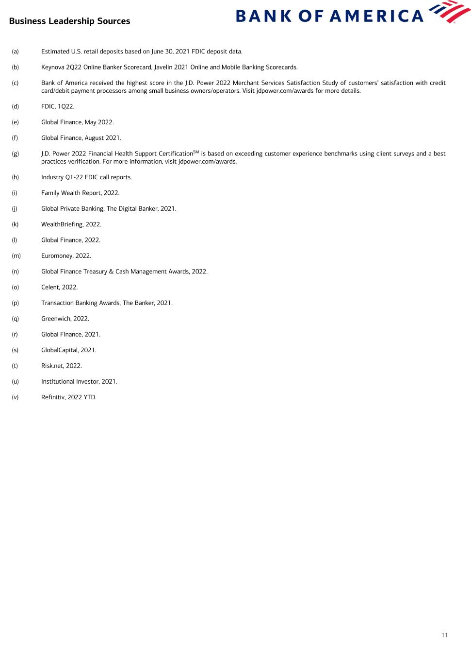 11 (a) Estimated U.S. retail deposits based on June 30, 2021 FDIC deposit data. (b) Keynova 2Q22 Online Banker Scorecard, Javelin 2021 Online and Mobile Banking Scorecards. (c) Bank of America received the highest score in the J.D. Power 2022 Merchant Services Satisfaction Study of customers’ satisfaction with credit card/debit payment processors among small business owners/operators. Visit jdpower.com/awards for more details. (d) FDIC, 1Q22. (e) Global Finance, May 2022. (f) Global Finance, August 2021. (g) J.D. Power 2022 Financial Health Support CertificationSM is based on exceeding customer experience benchmarks using client surveys and a best practices verification. For more information, visit jdpower.com/awards. (h) Industry Q1-22 FDIC call reports. (i) Family Wealth Report, 2022. (j) Global Private Banking, The Digital Banker, 2021. (k) WealthBriefing, 2022. (l) Global Finance, 2022. (m) Euromoney, 2022. (n) Global Finance Treasury & Cash Management Awards, 2022. (o) Celent, 2022. (p) Transaction Banking Awards, The Banker, 2021. (q) Greenwich, 2022. (r) Global Finance, 2021. (s) GlobalCapital, 2021. (t) Risk.net, 2022. (u) Institutional Investor, 2021. (v) Refinitiv, 2022 YTD. Business Leadership Sources
