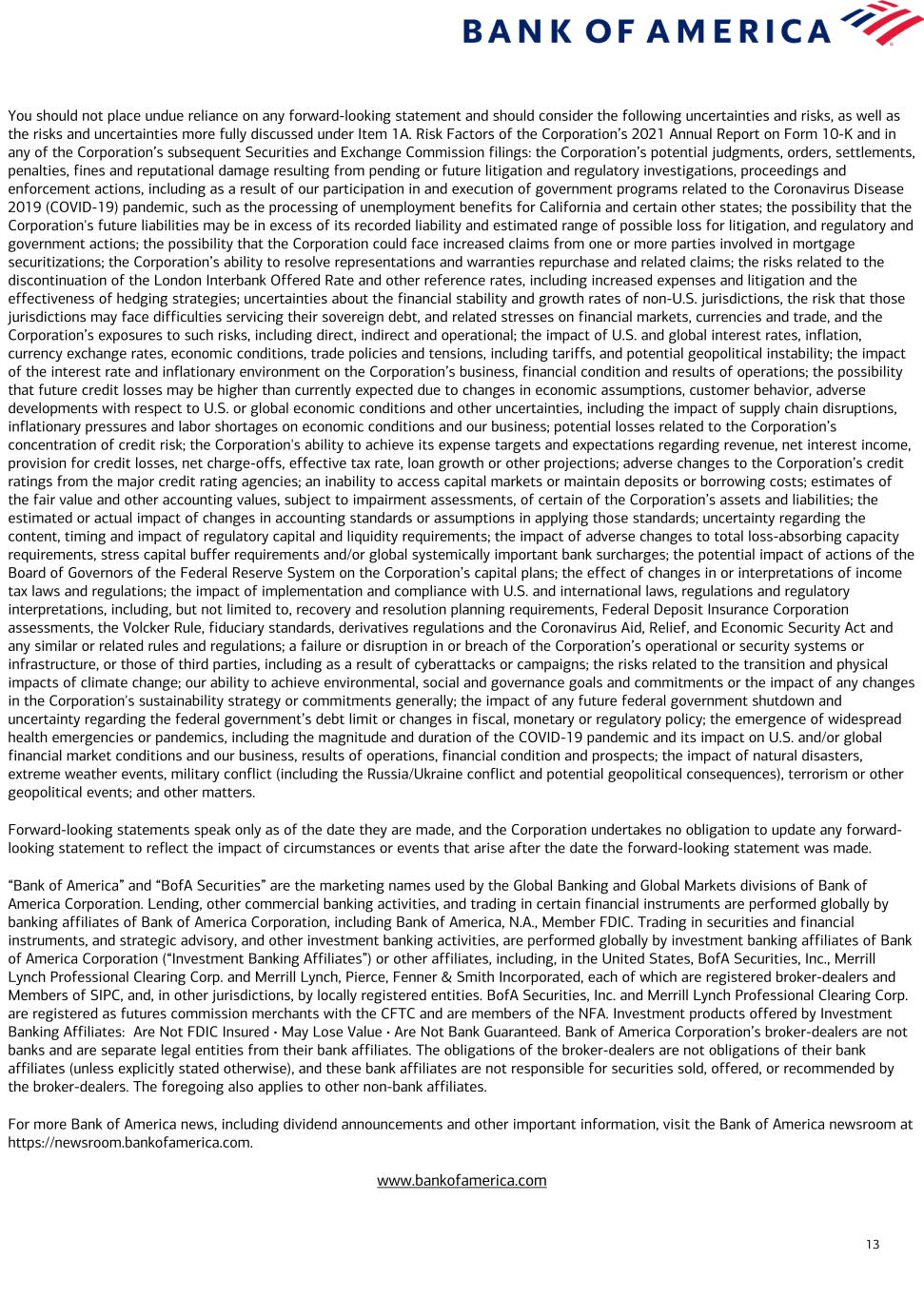 13 You should not place undue reliance on any forward-looking statement and should consider the following uncertainties and risks, as well as the risks and uncertainties more fully discussed under Item 1A. Risk Factors of the Corporation’s 2021 Annual Report on Form 10-K and in any of the Corporation’s subsequent Securities and Exchange Commission filings: the Corporation’s potential judgments, orders, settlements, penalties, fines and reputational damage resulting from pending or future litigation and regulatory investigations, proceedings and enforcement actions, including as a result of our participation in and execution of government programs related to the Coronavirus Disease 2019 (COVID-19) pandemic, such as the processing of unemployment benefits for California and certain other states; the possibility that the Corporation's future liabilities may be in excess of its recorded liability and estimated range of possible loss for litigation, and regulatory and government actions; the possibility that the Corporation could face increased claims from one or more parties involved in mortgage securitizations; the Corporation’s ability to resolve representations and warranties repurchase and related claims; the risks related to the discontinuation of the London Interbank Offered Rate and other reference rates, including increased expenses and litigation and the effectiveness of hedging strategies; uncertainties about the financial stability and growth rates of non-U.S. jurisdictions, the risk that those jurisdictions may face difficulties servicing their sovereign debt, and related stresses on financial markets, currencies and trade, and the Corporation’s exposures to such risks, including direct, indirect and operational; the impact of U.S. and global interest rates, inflation, currency exchange rates, economic conditions, trade policies and tensions, including tariffs, and potential geopolitical instability; the impact of the interest rate and inflationary environment on the Corporation’s business, financial condition and results of operations; the possibility that future credit losses may be higher than currently expected due to changes in economic assumptions, customer behavior, adverse developments with respect to U.S. or global economic conditions and other uncertainties, including the impact of supply chain disruptions, inflationary pressures and labor shortages on economic conditions and our business; potential losses related to the Corporation’s concentration of credit risk; the Corporation's ability to achieve its expense targets and expectations regarding revenue, net interest income, provision for credit losses, net charge-offs, effective tax rate, loan growth or other projections; adverse changes to the Corporation’s credit ratings from the major credit rating agencies; an inability to access capital markets or maintain deposits or borrowing costs; estimates of the fair value and other accounting values, subject to impairment assessments, of certain of the Corporation’s assets and liabilities; the estimated or actual impact of changes in accounting standards or assumptions in applying those standards; uncertainty regarding the content, timing and impact of regulatory capital and liquidity requirements; the impact of adverse changes to total loss-absorbing capacity requirements, stress capital buffer requirements and/or global systemically important bank surcharges; the potential impact of actions of the Board of Governors of the Federal Reserve System on the Corporation’s capital plans; the effect of changes in or interpretations of income tax laws and regulations; the impact of implementation and compliance with U.S. and international laws, regulations and regulatory interpretations, including, but not limited to, recovery and resolution planning requirements, Federal Deposit Insurance Corporation assessments, the Volcker Rule, fiduciary standards, derivatives regulations and the Coronavirus Aid, Relief, and Economic Security Act and any similar or related rules and regulations; a failure or disruption in or breach of the Corporation’s operational or security systems or infrastructure, or those of third parties, including as a result of cyberattacks or campaigns; the risks related to the transition and physical impacts of climate change; our ability to achieve environmental, social and governance goals and commitments or the impact of any changes in the Corporation's sustainability strategy or commitments generally; the impact of any future federal government shutdown and uncertainty regarding the federal government’s debt limit or changes in fiscal, monetary or regulatory policy; the emergence of widespread health emergencies or pandemics, including the magnitude and duration of the COVID-19 pandemic and its impact on U.S. and/or global financial market conditions and our business, results of operations, financial condition and prospects; the impact of natural disasters, extreme weather events, military conflict (including the Russia/Ukraine conflict and potential geopolitical consequences), terrorism or other geopolitical events; and other matters. Forward-looking statements speak only as of the date they are made, and the Corporation undertakes no obligation to update any forward- looking statement to reflect the impact of circumstances or events that arise after the date the forward-looking statement was made. “Bank of America” and “BofA Securities” are the marketing names used by the Global Banking and Global Markets divisions of Bank of America Corporation. Lending, other commercial banking activities, and trading in certain financial instruments are performed globally by banking affiliates of Bank of America Corporation, including Bank of America, N.A., Member FDIC. Trading in securities and financial instruments, and strategic advisory, and other investment banking activities, are performed globally by investment banking affiliates of B