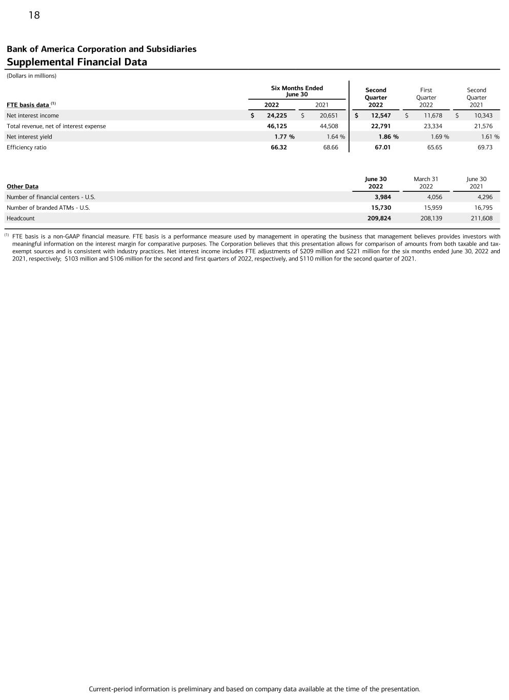 Current-period information is preliminary and based on company data available at the time of the presentation. 18 Bank of America Corporation and Subsidiaries Supplemental Financial Data (Dollars in millions) Six Months Ended June 30 Second Quarter 2022 First Quarter 2022 Second Quarter 2021FTE basis data (1) 2022 2021 Net interest income $ 24,225 $ 20,651 $ 12,547 $ 11,678 $ 10,343 Total revenue, net of interest expense 46,125 44,508 22,791 23,334 21,576 Net interest yield 1.77 % 1.64 % 1.86 % 1.69 % 1.61 % Efficiency ratio 66.32 68.66 67.01 65.65 69.73 Other Data June 30 2022 March 31 2022 June 30 2021 Number of financial centers - U.S. 3,984 4,056 4,296 Number of branded ATMs - U.S. 15,730 15,959 16,795 Headcount 209,824 208,139 211,608 (1) FTE basis is a non-GAAP financial measure. FTE basis is a performance measure used by management in operating the business that management believes provides investors with meaningful information on the interest margin for comparative purposes. The Corporation believes that this presentation allows for comparison of amounts from both taxable and tax- exempt sources and is consistent with industry practices. Net interest income includes FTE adjustments of $209 million and $221 million for the six months ended June 30, 2022 and 2021, respectively; $103 million and $106 million for the second and first quarters of 2022, respectively, and $110 million for the second quarter of 2021.