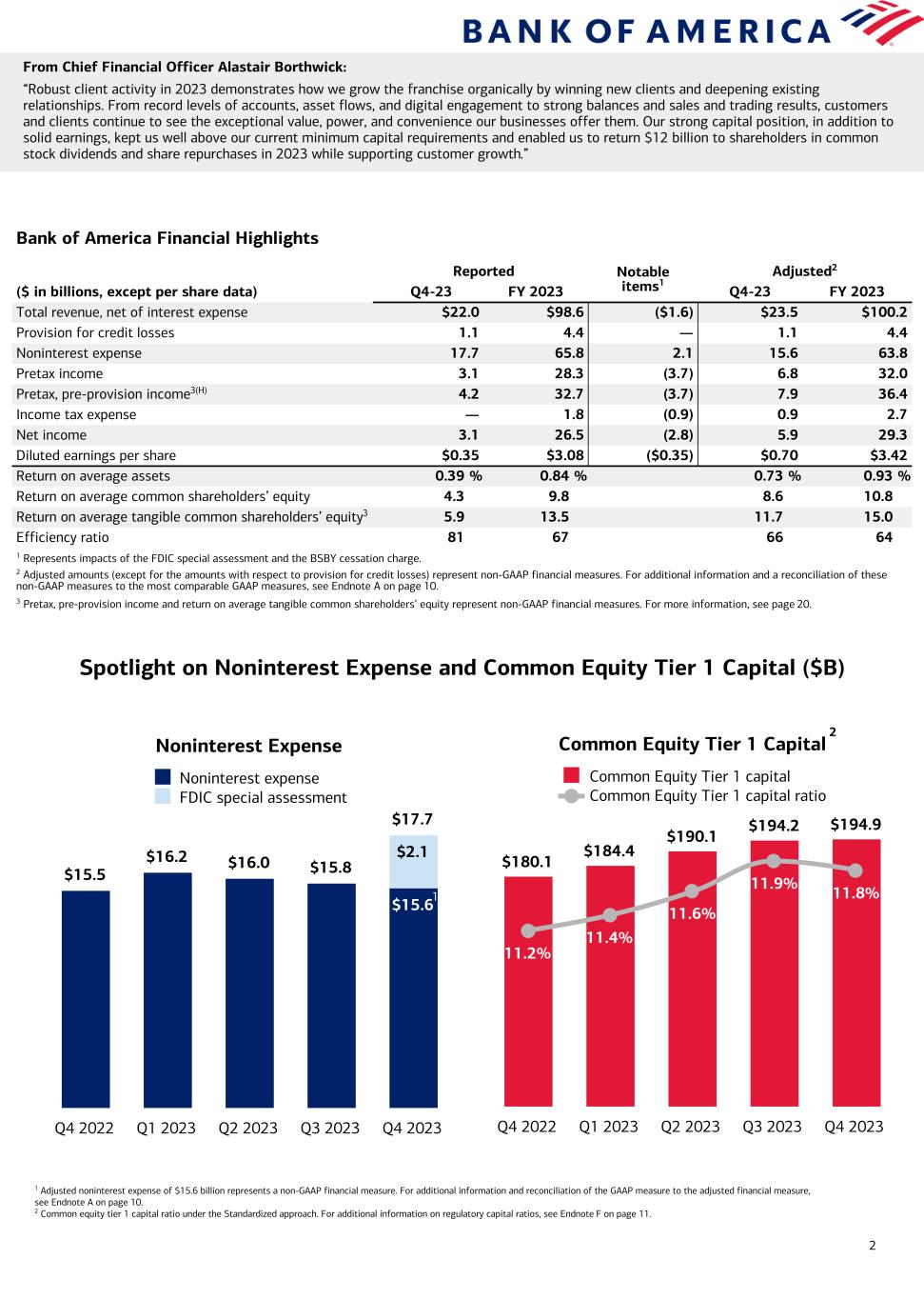 2 Bank of America Financial Highlights Reported Notable items1 Adjusted2 ($ in billions, except per share data) Q4-23 FY 2023 Q4-23 FY 2023 Total revenue, net of interest expense $22.0 $98.6 ($1.6) $23.5 $100.2 Provision for credit losses 1.1 4.4 — 1.1 4.4 Noninterest expense 17.7 65.8 2.1 15.6 63.8 Pretax income 3.1 28.3 (3.7) 6.8 32.0 Pretax, pre-provision income3(H) 4.2 32.7 (3.7) 7.9 36.4 Income tax expense — 1.8 (0.9) 0.9 2.7 Net income 3.1 26.5 (2.8) 5.9 29.3 Diluted earnings per share $0.35 $3.08 ($0.35) $0.70 $3.42 Return on average assets 0.39 % 0.84 % 0.73 % 0.93 % Return on average common shareholders’ equity 4.3 9.8 8.6 10.8 Return on average tangible common shareholders’ equity3 5.9 13.5 11.7 15.0 Efficiency ratio 81 67 66 64 1 Represents impacts of the FDIC special assessment and the BSBY cessation charge. 2 Adjusted amounts (except for the amounts with respect to provision for credit losses) represent non-GAAP financial measures. For additional information and a reconciliation of these non-GAAP measures to the most comparable GAAP measures, see Endnote A on page 10. 3 Pretax, pre-provision income and return on average tangible common shareholders’ equity represent non-GAAP financial measures. For more information, see page 20. From Chief Financial Officer Alastair Borthwick: “Robust client activity in 2023 demonstrates how we grow the franchise organically by winning new clients and deepening existing relationships. From record levels of accounts, asset flows, and digital engagement to strong balances and sales and trading results, customers and clients continue to see the exceptional value, power, and convenience our businesses offer them. Our strong capital position, in addition to solid earnings, kept us well above our current minimum capital requirements and enabled us to return $12 billion to shareholders in common stock dividends and share repurchases in 2023 while supporting customer growth.” Common Equity Tier 1 Capital $180.1 $184.4 $190.1 $194.2 $194.9 11.2% 11.4% 11.6% 11.9% 11.8% Common Equity Tier 1 capital Common Equity Tier 1 capital ratio Q4 2022 Q1 2023 Q2 2023 Q3 2023 Q4 2023 Noninterest Expense $15.5 $16.2 $16.0 $15.8 $17.7 $15.6 $2.1 Noninterest expense FDIC special assessment Q4 2022 Q1 2023 Q2 2023 Q3 2023 Q4 2023 Spotlight on Noninterest Expense and Common Equity Tier 1 Capital ($B) 2 1 Adjusted noninterest expense of $15.6 billion represents a non-GAAP financial measure. For additional information and reconciliation of the GAAP measure to the adjusted financial measure, see Endnote A on page 10. 2 Common equity tier 1 capital ratio under the Standardized approach. For additional information on regulatory capital ratios, see Endnote F on page 11. 1