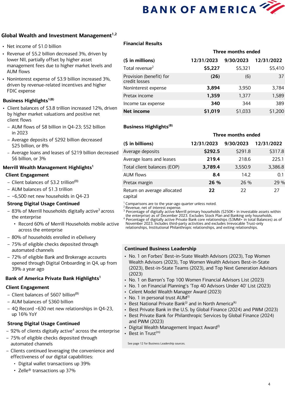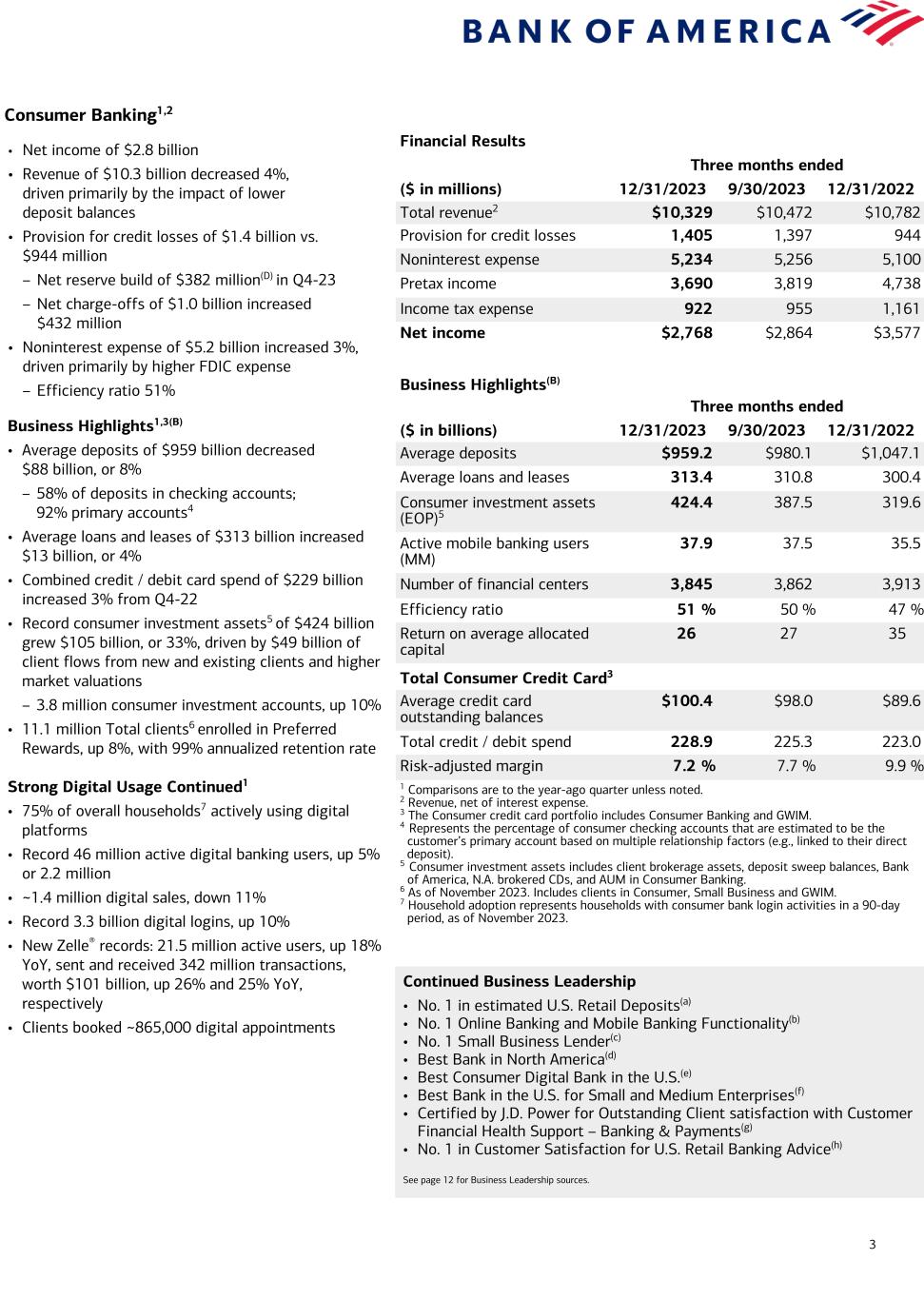 3 Consumer Banking1,2 Financial Results Three months ended ($ in millions) 12/31/2023 9/30/2023 12/31/2022 Total revenue2 $10,329 $10,472 $10,782 Provision for credit losses 1,405 1,397 944 Noninterest expense 5,234 5,256 5,100 Pretax income 3,690 3,819 4,738 Income tax expense 922 955 1,161 Net income $2,768 $2,864 $3,577 Business Highlights(B) Three months ended ($ in billions) 12/31/2023 9/30/2023 12/31/2022 Average deposits $959.2 $980.1 $1,047.1 Average loans and leases 313.4 310.8 300.4 Consumer investment assets (EOP)5 424.4 387.5 319.6 Active mobile banking users (MM) 37.9 37.5 35.5 Number of financial centers 3,845 3,862 3,913 Efficiency ratio 51 % 50 % 47 % Return on average allocated capital 26 27 35 Total Consumer Credit Card3 Average credit card outstanding balances $100.4 $98.0 $89.6 Total credit / debit spend 228.9 225.3 223.0 Risk-adjusted margin 7.2 % 7.7 % 9.9 % 1 Comparisons are to the year-ago quarter unless noted. 2 Revenue, net of interest expense. 3 The Consumer credit card portfolio includes Consumer Banking and GWIM. 4 Represents the percentage of consumer checking accounts that are estimated to be the customer’s primary account based on multiple relationship factors (e.g., linked to their direct deposit). 5 Consumer investment assets includes client brokerage assets, deposit sweep balances, Bank of America, N.A. brokered CDs, and AUM in Consumer Banking. 6 As of November 2023. Includes clients in Consumer, Small Business and GWIM. 7 Household adoption represents households with consumer bank login activities in a 90-day period, as of November 2023. • Net income of $2.8 billion • Revenue of $10.3 billion decreased 4%, driven primarily by the impact of lower deposit balances • Provision for credit losses of $1.4 billion vs. $944 million – Net reserve build of $382 million(D) in Q4-23 – Net charge-offs of $1.0 billion increased $432 million • Noninterest expense of $5.2 billion increased 3%, driven primarily by higher FDIC expense – Efficiency ratio 51% Business Highlights1,3(B) • Average deposits of $959 billion decreased $88 billion, or 8% – 58% of deposits in checking accounts; 92% primary accounts4 • Average loans and leases of $313 billion increased $13 billion, or 4% • Combined credit / debit card spend of $229 billion increased 3% from Q4-22 • Record consumer investment assets5 of $424 billion grew $105 billion, or 33%, driven by $49 billion of client flows from new and existing clients and higher market valuations – 3.8 million consumer investment accounts, up 10% • 11.1 million Total clients6 enrolled in Preferred Rewards, up 8%, with 99% annualized retention rate Strong Digital Usage Continued1 • 75% of overall households7 actively using digital platforms • Record 46 million active digital banking users, up 5% or 2.2 million • ~1.4 million digital sales, down 11% • Record 3.3 billion digital logins, up 10% • New Zelle® records: 21.5 million active users, up 18% YoY, sent and received 342 million transactions, worth $101 billion, up 26% and 25% YoY, respectively • Clients booked ~865,000 digital appointments Continued Business Leadership • No. 1 in estimated U.S. Retail Deposits(a) • No. 1 Online Banking and Mobile Banking Functionality(b) • No. 1 Small Business Lender(c) • Best Bank in North America(d) • Best Consumer Digital Bank in the U.S.(e) • Best Bank in the U.S. for Small and Medium Enterprises(f) • Certified by J.D. Power for Outstanding Client satisfaction with Customer Financial Health Support – Banking & Payments(g) • No. 1 in Customer Satisfaction for U.S. Retail Banking Advice(h) See page 12 for Business Leadership sources.