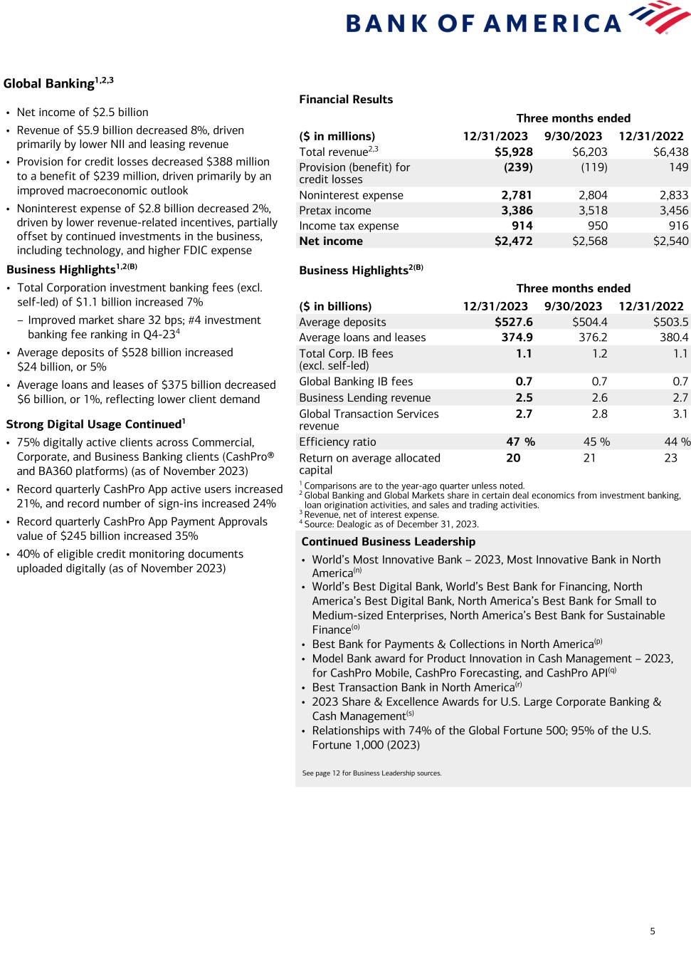 4 Global Wealth and Investment Management1,2 Financial Results Three months ended ($ in millions) 12/31/2023 9/30/2023 12/31/2022 Total revenue2 $5,227 $5,321 $5,410 Provision (benefit) for credit losses (26) (6) 37 Noninterest expense 3,894 3,950 3,784 Pretax income 1,359 1,377 1,589 Income tax expense 340 344 389 Net income $1,019 $1,033 $1,200 Business Highlights(B) Three months ended ($ in billions) 12/31/2023 9/30/2023 12/31/2022 Average deposits $292.5 $291.8 $317.8 Average loans and leases 219.4 218.6 225.1 Total client balances (EOP) 3,789.4 3,550.9 3,386.8 AUM flows 8.4 14.2 0.1 Pretax margin 26 % 26 % 29 % Return on average allocated capital 22 22 27 1 Comparisons are to the year-ago quarter unless noted. 2 Revenue, net of interest expense. 3 Percentage of digitally active Merrill primary households ($250K+ in investable assets within the enterprise) as of December 2023. Excludes Stock Plan and Banking only households. 4 Percentage of digitally active Private Bank core relationships ($3MM+ in total Balances) as of November 2023. Includes third-party activities and excludes Irrevocable Trust-only relationships, Institutional Philanthropic relationships, and exiting relationships. Continued Business Leadership • No. 1 on Forbes’ Best-in-State Wealth Advisors (2023), Top Women Wealth Advisors (2023), Top Women Wealth Advisors Best-in-State (2023), Best-in-State Teams (2023), and Top Next Generation Advisors (2023) • No. 1 on Barron’s Top 100 Women Financial Advisors List (2023) • No. 1 on Financial Planning's 'Top 40 Advisors Under 40' List (2023) • Celent Model Wealth Manager Award (2023) • No. 1 in personal trust AUM(i) • Best National Private Bank(j) and in North America(k) • Best Private Bank in the U.S. by Global Finance (2024) and PWM (2023) • Best Private Bank for Philanthropic Services by Global Finance (2024) and PWM (2023) • Digital Wealth Management Impact Award(l) • Best in Trust(m) See page 12 for Business Leadership sources. • Net income of $1.0 billion • Revenue of $5.2 billion decreased 3%, driven by lower NII, partially offset by higher asset management fees due to higher market levels and AUM flows • Noninterest expense of $3.9 billion increased 3%, driven by revenue-related incentives and higher FDIC expense Business Highlights1(B) • Client balances of $3.8 trillion increased 12%, driven by higher market valuations and positive net client flows – AUM flows of $8 billion in Q4-23; $52 billion in 2023 – Average deposits of $292 billion decreased $25 billion, or 8% – Average loans and leases of $219 billion decreased $6 billion, or 3% Merrill Wealth Management Highlights1 Client Engagement – Client balances of $3.2 trillion(B) – AUM balances of $1.3 trillion – ~6,500 net new households in Q4-23 Strong Digital Usage Continued – 83% of Merrill households digitally active3 across the enterprise ▪ Record 60% of Merrill Households mobile active across the enterprise – 80% of households enrolled in eDelivery – 75% of eligible checks deposited through automated channels – 72% of eligible Bank and Brokerage accounts opened through Digital Onboarding in Q4, up from 39% a year ago Client Engagement – Client balances of $607 billion(B) – AUM balances of $360 billion – 4Q Record ~630 net new relationships in Q4-23, up 16% YoY Bank of America Private Bank Highlights1 Strong Digital Usage Continued – 92% of clients digitally active4 across the enterprise – 75% of eligible checks deposited through automated channels – Clients continued leveraging the convenience and effectiveness of our digital capabilities: ▪ Digital wallet transactions up 39% ▪ Zelle® transactions up 37%