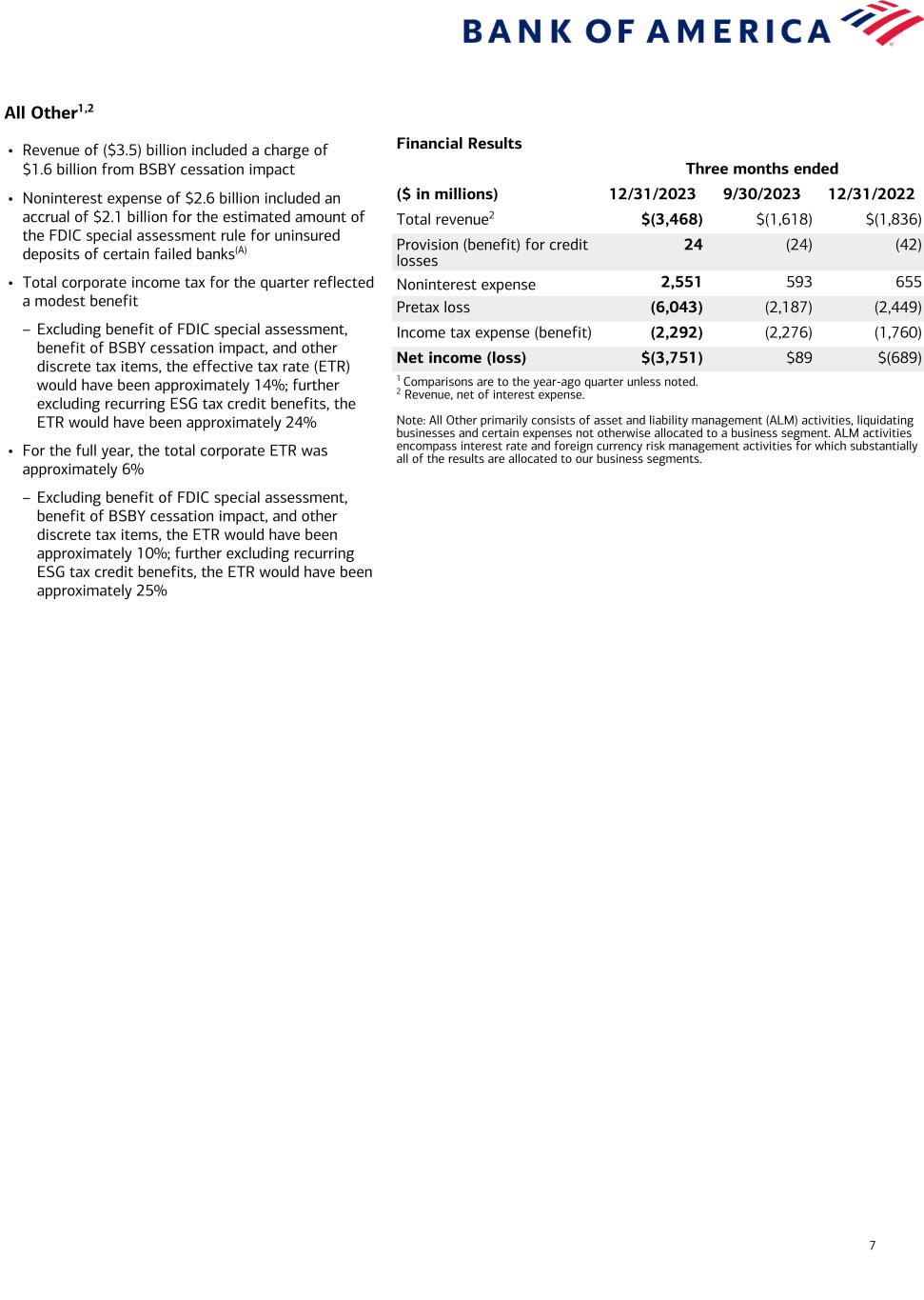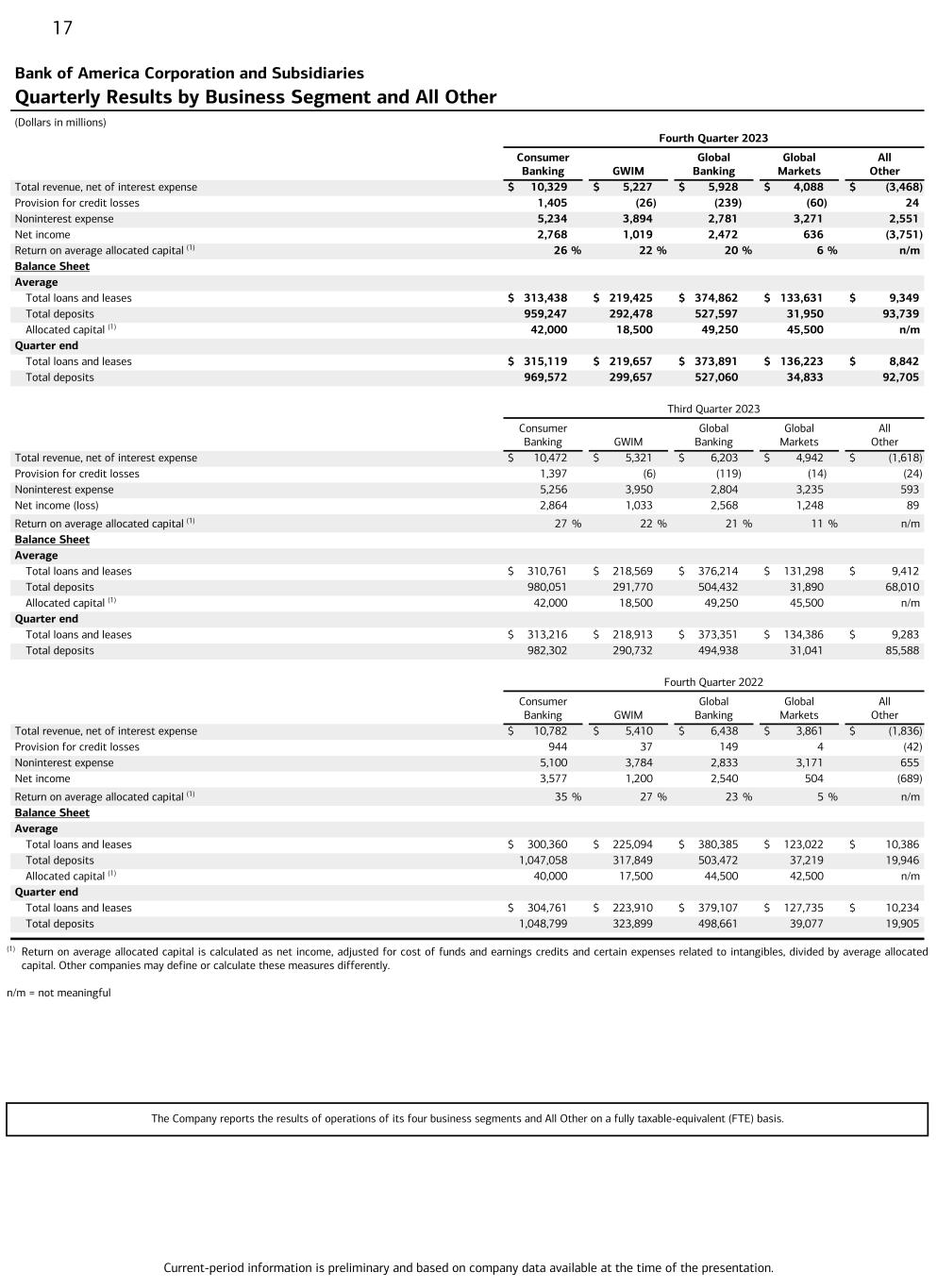 Current-period information is preliminary and based on company data available at the time of the presentation. 17 Bank of America Corporation and Subsidiaries Quarterly Results by Business Segment and All Other (Dollars in millions) Fourth Quarter 2023 Consumer Banking GWIM Global Banking Global Markets All Other Total revenue, net of interest expense $ 10,329 $ 5,227 $ 5,928 $ 4,088 $ (3,468) Provision for credit losses 1,405 (26) (239) (60) 24 Noninterest expense 5,234 3,894 2,781 3,271 2,551 Net income 2,768 1,019 2,472 636 (3,751) Return on average allocated capital (1) 26 % 22 % 20 % 6 % n/m Balance Sheet Average Total loans and leases $ 313,438 $ 219,425 $ 374,862 $ 133,631 $ 9,349 Total deposits 959,247 292,478 527,597 31,950 93,739 Allocated capital (1) 42,000 18,500 49,250 45,500 n/m Quarter end Total loans and leases $ 315,119 $ 219,657 $ 373,891 $ 136,223 $ 8,842 Total deposits 969,572 299,657 527,060 34,833 92,705 Third Quarter 2023 Consumer Banking GWIM Global Banking Global Markets All Other Total revenue, net of interest expense $ 10,472 $ 5,321 $ 6,203 $ 4,942 $ (1,618) Provision for credit losses 1,397 (6) (119) (14) (24) Noninterest expense 5,256 3,950 2,804 3,235 593 Net income (loss) 2,864 1,033 2,568 1,248 89 Return on average allocated capital (1) 27 % 22 % 21 % 11 % n/m Balance Sheet Average Total loans and leases $ 310,761 $ 218,569 $ 376,214 $ 131,298 $ 9,412 Total deposits 980,051 291,770 504,432 31,890 68,010 Allocated capital (1) 42,000 18,500 49,250 45,500 n/m Quarter end Total loans and leases $ 313,216 $ 218,913 $ 373,351 $ 134,386 $ 9,283 Total deposits 982,302 290,732 494,938 31,041 85,588 Fourth Quarter 2022 Consumer Banking GWIM Global Banking Global Markets All Other Total revenue, net of interest expense $ 10,782 $ 5,410 $ 6,438 $ 3,861 $ (1,836) Provision for credit losses 944 37 149 4 (42) Noninterest expense 5,100 3,784 2,833 3,171 655 Net income 3,577 1,200 2,540 504 (689) Return on average allocated capital (1) 35 % 27 % 23 % 5 % n/m Balance Sheet Average Total loans and leases $ 300,360 $ 225,094 $ 380,385 $ 123,022 $ 10,386 Total deposits 1,047,058 317,849 503,472 37,219 19,946 Allocated capital (1) 40,000 17,500 44,500 42,500 n/m Quarter end Total loans and leases $ 304,761 $ 223,910 $ 379,107 $ 127,735 $ 10,234 Total deposits 1,048,799 323,899 498,661 39,077 19,905 (1) Return on average allocated capital is calculated as net income, adjusted for cost of funds and earnings credits and certain expenses related to intangibles, divided by average allocated capital. Other companies may define or calculate these measures differently. n/m = not meaningful The Company reports the results of operations of its four business segments and All Other on a fully taxable-equivalent (FTE) basis.