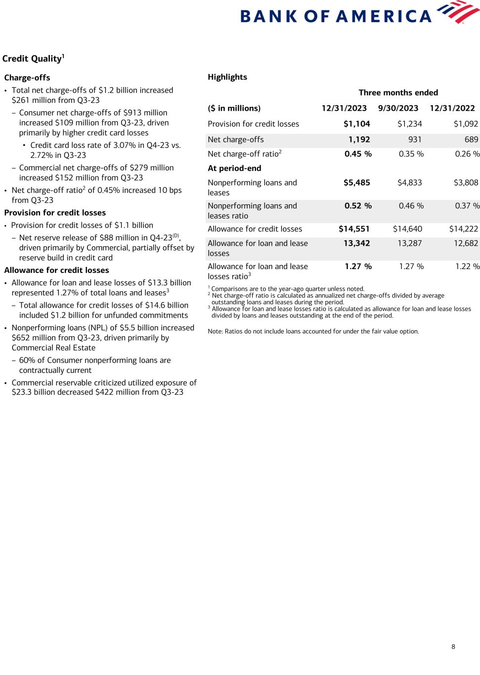 Current-period information is preliminary and based on company data available at the time of the presentation. 15 Bank of America Corporation and Subsidiaries Selected Financial Data (In millions, except per share data) Year Ended December 31 Fourth Quarter 2023 Third Quarter 2023 Fourth Quarter 2022Summary Income Statement 2023 2022 Net interest income $ 56,931 $ 52,462 $ 13,946 $ 14,379 $ 14,681 Noninterest income 41,650 42,488 8,013 10,788 9,851 Total revenue, net of interest expense 98,581 94,950 21,959 25,167 24,532 Provision for credit losses 4,394 2,543 1,104 1,234 1,092 Noninterest expense 65,845 61,438 17,731 15,838 15,543 Income before income taxes 28,342 30,969 3,124 8,095 7,897 Income tax expense 1,827 3,441 (20) 293 765 Net income $ 26,515 $ 27,528 $ 3,144 $ 7,802 $ 7,132 Preferred stock dividends and other 1,649 1,513 306 532 228 Net income applicable to common shareholders $ 24,866 $ 26,015 $ 2,838 $ 7,270 $ 6,904 Average common shares issued and outstanding 8,028.6 8,113.7 7,990.9 8,017.1 8,088.3 Average diluted common shares issued and outstanding 8,080.5 8,167.5 8,062.5 8,075.9 8,155.7 Summary Average Balance Sheet Total cash and cash equivalents $ 350,465 $ 223,593 $ 405,052 $ 378,955 $ 203,366 Total debt securities 794,192 922,730 802,657 752,569 869,084 Total loans and leases 1,046,256 1,016,782 1,050,705 1,046,254 1,039,247 Total earning assets 2,753,600 2,700,860 2,829,765 2,738,699 2,647,712 Total assets 3,153,513 3,135,894 3,213,159 3,128,466 3,074,289 Total deposits 1,887,541 1,986,158 1,905,011 1,876,153 1,925,544 Common shareholders’ equity 254,956 241,981 260,221 256,578 243,647 Total shareholders’ equity 283,353 270,299 288,618 284,975 272,629 Performance Ratios Return on average assets 0.84 % 0.88 % 0.39 % 0.99 % 0.92 % Return on average common shareholders’ equity 9.75 10.75 4.33 11.24 11.24 Return on average tangible common shareholders’ equity (1) 13.46 15.15 5.92 15.47 15.79 Per Common Share Information Earnings $ 3.10 $ 3.21 $ 0.36 $ 0.91 $ 0.85 Diluted earnings 3.08 3.19 0.35 0.90 0.85 Dividends paid 0.92 0.86 0.24 0.24 0.22 Book value 33.34 30.61 33.34 32.65 30.61 Tangible book value (1) 24.46 21.83 24.46 23.79 21.83 Summary Period-End Balance Sheet December 31 2023 September 30 2023 December 31 2022 Total cash and cash equivalents $ 333,073 $ 351,726 $ 230,203 Total debt securities 871,407 778,873 862,819 Total loans and leases 1,053,732 1,049,149 1,045,747 Total earning assets 2,808,175 2,761,184 2,640,827 Total assets 3,179,876 3,153,090 3,051,375 Total deposits 1,923,827 1,884,601 1,930,341 Common shareholders’ equity 263,249 258,667 244,800 Total shareholders’ equity 291,646 287,064 273,197 Common shares issued and outstanding 7,895.5 7,923.4 7,996.8 Year Ended December 31 Fourth Quarter 2023 Third Quarter 2023 Fourth Quarter 2022Credit Quality 2023 2022 Total net charge-offs $ 3,799 $ 2,172 $ 1,192 $ 931 $ 689 Net charge-offs as a percentage of average loans and leases outstanding (2) 0.36 % 0.21 % 0.45 % 0.35 % 0.26 % Provision for credit losses $ 4,394 $ 2,543 $ 1,104 $ 1,234 $ 1,092 December 31 2023 September 30 2023 December 31 2022 Total nonperforming loans, leases and foreclosed properties (3) $ 5,630 $ 4,993 $ 3,978 Nonperforming loans, leases and foreclosed properties as a percentage of total loans, leases and foreclosed properties (3) 0.54 % 0.48 % 0.38 % Allowance for credit losses $ 14,551 $ 14,640 $ 14,222 Allowance for loan and lease losses 13,342 13,287 12,682 Allowance for loan and lease losses as a percentage of total loans and leases outstanding (2) 1.27 % 1.27 % 1.22 % For footnotes, see page 16.